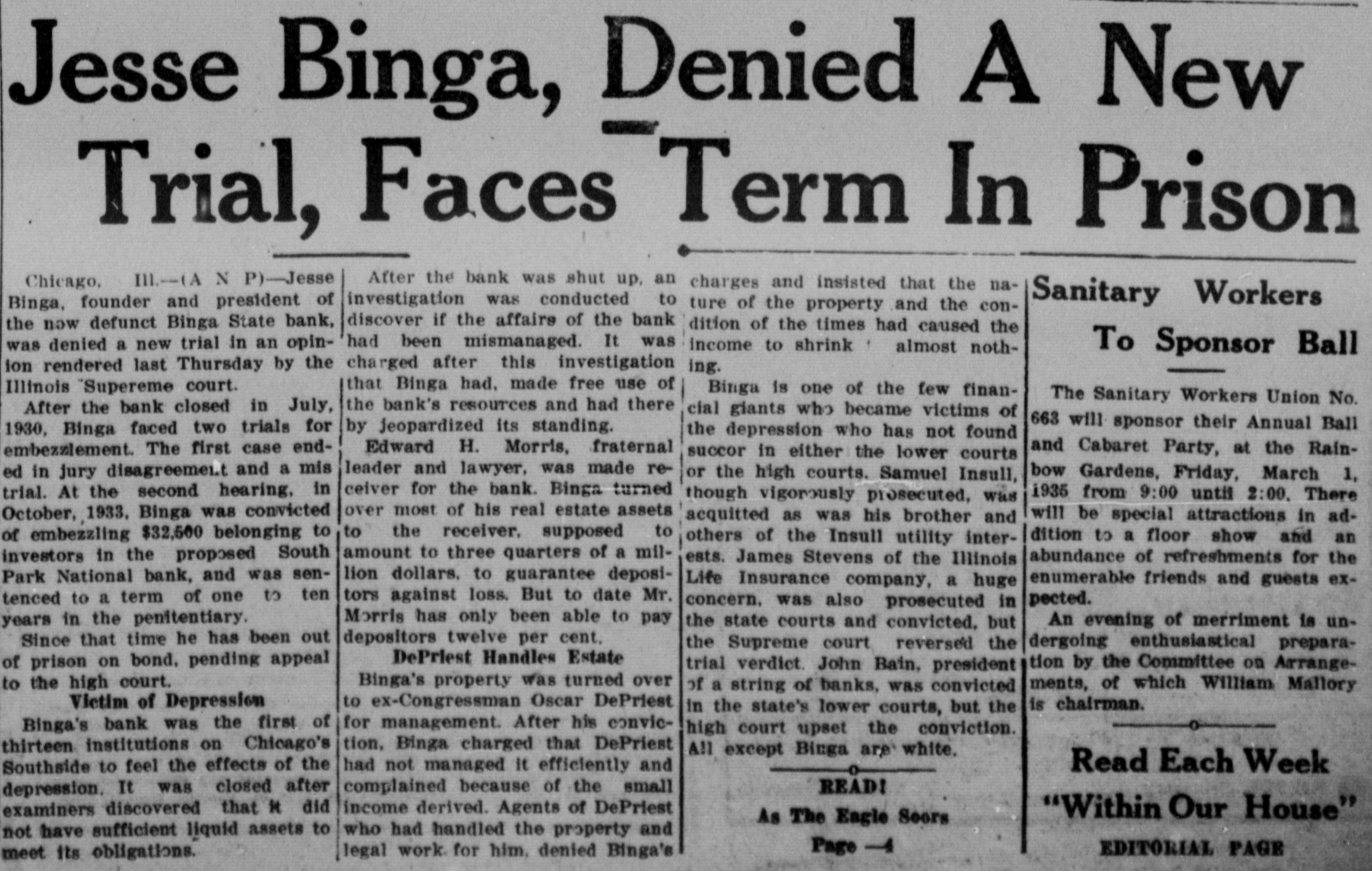 Jesse Binga, former president of the defunct Binga State Bank, was arrested ... charged with embezzlement of some $300,000 from the institution ... So much of the institution's money became tied up ... that it was forced to close.
