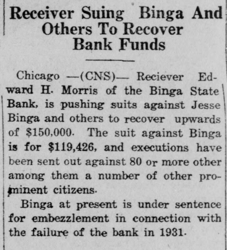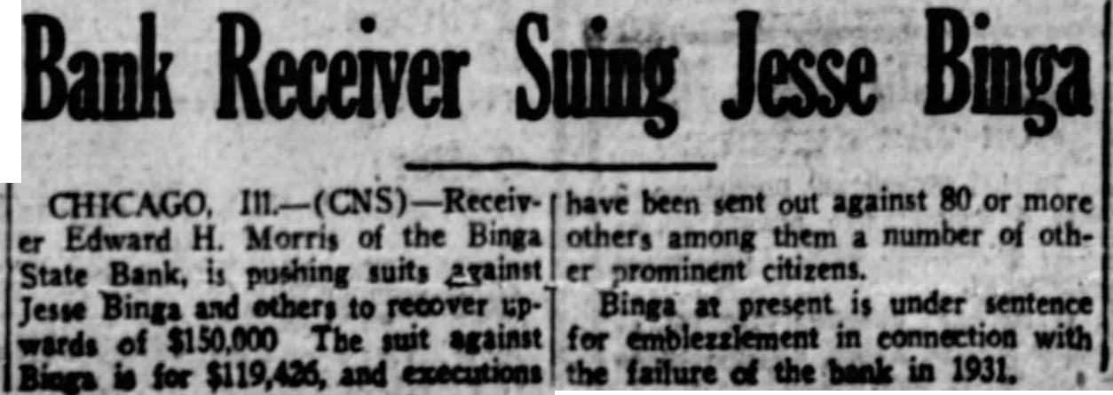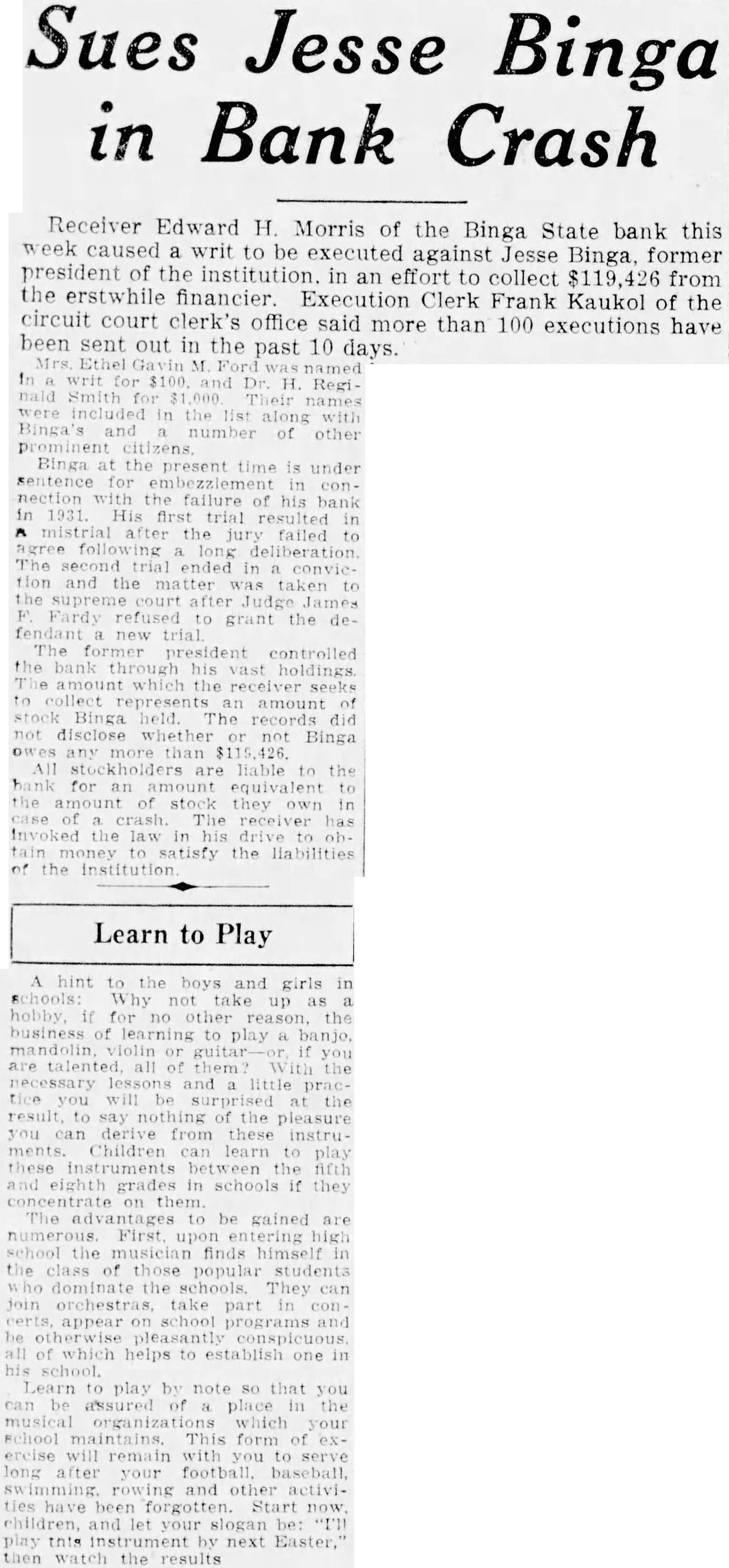Sues Jesse Binga in Bank Crash Receiver Edward H. Morris of the Binga State bank this week caused a writ to be executed against Jesse Binga, former president of the institution. in an effort to collect $119,426 from the erstwhile financier. Execution Clerk Frank Kaukol of the circuit court clerk's office said more than 100 executions have been sent out in the past 10 days. for $100 and Dr. H. RegiSmith Their were included in the along with number of other prominent Binga at the time is for the his first resulted the failed to ended in taken to supreme court after Judge James F. to the president controlled the bank holdings vast seeks to represents an amount of The records did Binga liable to amount equivalent amount stock in case The receiver Invoked the satisfy the liabilities Learn to Play A hint to the boys and girls Why up if for the business to play banjo, violin if are them With be the to nothing of the pleasure derive these Children play the grades schools if on The be gained First school musician finds himself in the class of those dominate the They part appear on school programs and pleasantly helps to establish one in to play note that you can assured of place in your This form of remain to your act Start and let your slogan be: this by next Easter," watch the results