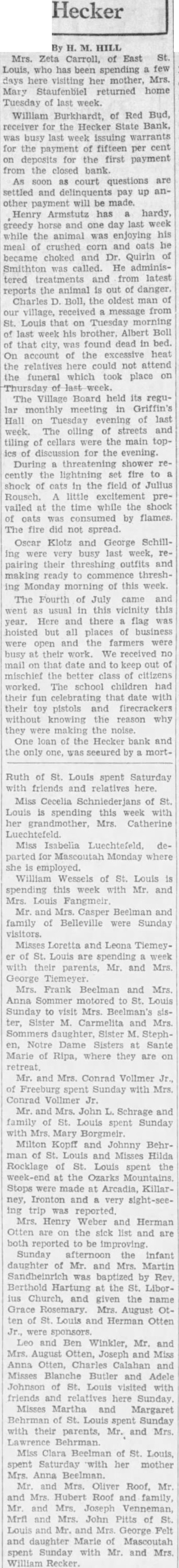 Hecker By HILL Mrs. Zeta Carroll, of East St. Louis, who has been spending few days here visiting her mother, Mrs. Mary Staufenbiel returned home Tuesday of last week. William Burkhardt, of Red Bud, receiver for the Hecker State Bank. was busy last week issuing warrants for the payment of fifteen per cent on deposits for the first payment from the closed bank As soon court questions are settled and delinquents pay up another payment will be made. Henry Armstutz has hardy, greedy and one day last week while the animal was enjoying his meal of crushed corn and oats he became choked and Dr. Quirin of called. He administered treatments and from latest reports the animal is out of danger. Charles Boll, the oldest man of our village, from St. Louis that on Tuesday morning of last week his brother, Albert Boll of that city, was found dead in bed. On account of the excessive heat the relatives here could not attend the funeral which took place on of last week. The Village Board held its regular monthly meeting in Griffin's Hall on Tuesday of last week. The oiling of streets and tiling of cellars were the main topics of discussion for the evening. During threatening shower recently the lightning set fire to shock of oats in the field of Julius Rousch. little prevalled at the time while the shock of oats was consumed by flames. The fire did not spread. Oscar Klotz and George Schilling were very busy last week, repairing their threshing outfits and making ready to commence threshing Monday morning of this week. The Fourth of July came and went as usual in this vicinity this year. Here and there flag was hoisted but all places of business were open and the farmers were busy at their work. We received no mail on that date and to keep out of mischief the better class of citizens worked. school children had their fun celebrating that date with their pistols firecrackers without knowing the reason why they were making the noise. One loan of the Hecker bank and the only one, was secured by mort- Ruth of St. Louis spent Saturday with friends and relatives here. Miss Cecelia Schniederjans of Louis is spending this week with her grandmother, Mrs. Catherine Luechtefeld. Miss Isabelia Luechtefeld departed Mascoutah Monday where she employed. William Wessels of St. Louis spending this week with Mr. and Mrs. Louis Fangmeir Mr. and Mrs. Casper Beelman and family of Belleville were Sunday visitors. Misses Loretta and Leona Tiemeyer of St. Louis are week with their parents, Mr. and Mrs. George Tiemeyer. Mrs. Frank Beelman and Mrs. Anna Sommer motored St. Louis Sunday to visit Mrs. Beelman's sister, Sister M. Carmelita and Mrs. daughter, Sister M. Stephen, Notre Dame Sisters at Sante Marie of Ripa, where they are Mr. and Mrs. Conrad Vollmer of spent Sunday with Mrs. Conrad Vollmer Jr. Mr. and Mrs. John L. Schrage and family of St. Louis spent Sunday with Mrs. Mary Borgmeir. Milton Kopff and Johnny Behrman of St. Louis and Misses Hilda Rocklage of St. Louis spent the week-end the Ozarks Mountains. Stops were made at Arcadia, Killarney, Ironton and very sight-seeing trip reported. Mrs. Henry Weber and Herman Otten are on the sick list and are both reported to be improving Sunday afternoon the infant daughter of Mr. and Mrs. Martin Sandheinrich was baptized by Rev. Berthold Hartung at the St. Liborius Church, given the name Grace Mrs. August Otten of St. Louis and Herman Otten Jr., were sponsors. Leo and Ben Winkler, Mr. and Mrs. August Otten, Joseph and Miss Anna Otten, Charles Calahan and Misses Blanche Butler and Adele Johnson of St. Louis visited with friends and relatives here Sunday. Misses Martha and Margaret Behrman of St. Louis spent Sunday with their parents, Mr. and Mrs. Lawrence Miss Clara Beelman of St. Louis, spent Saturday with her mother Mrs. Anna Beelman. Mrs. Oliver Roof. Mr and Mrs Hubert Roof family, Mr. and Mrs. Joseph Venneman, Mrfl and Mrs. John Pitts of St. Louis and Mr. and Mrs George Felt and daughter Marie of Mascoutah spent Sunday with Mr. and Mrs. William Recker.