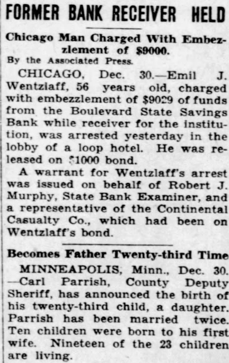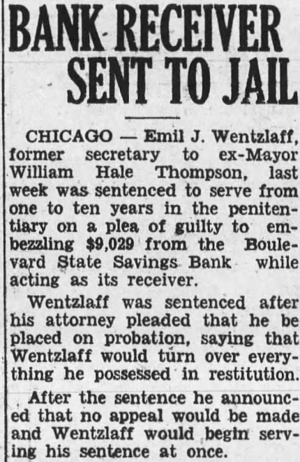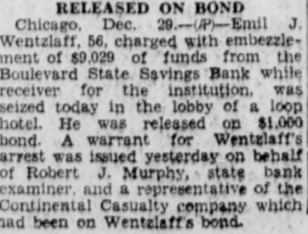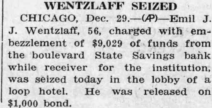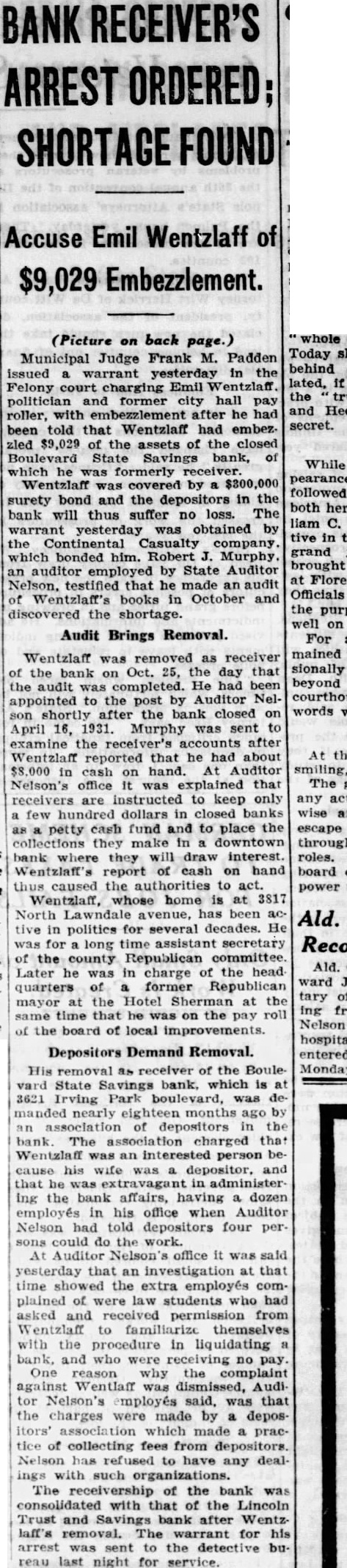 BANK RECEIVER'S ARREST ORDERED; SHORTAGE FOUND Accuse Emil Wentzlaff of $9,029 Embezzlement. (Picture on back page.) Municipal Judge Frank M. Padden issued a warrant yesterday in the Felony court charging Emil Wentzlaff politician and former city hall pay roller, with embezzlement after he been told that Wentzlaff had embez. zled $9,029 of the assets of the closed Boulevard State Savings bank, of which was formerly Wentzlaff was by $300,000 surety bond and the depositors in the bank will thus suffer no loss. The warrant yesterday was obtained by the Continental Casualty company. which bonded him. Robert J. Murphy. an auditor employed by State Auditor Nelson. testified that he made an audit of Wentzlaff's books in October and discovered the shortage. Audit Brings Removal. Wentzlaff was removed as receiver of the bank on Oct. 25, the day that the audit completed. He had been appointed to the post by Auditor Nelson shortly after the bank closed on April 16, 1931. Murphy was sent to examine the after Wentzlaff reported that he had about 000 in cash on hand. Auditor Nelson's office It was explained that receivers are instructed to keep only few hundred dollars in closed banks as petty cash fund and to place the collections they make in downtown bank where they will draw interest Wentzlaff's report of cash on hand thus caused the authorities to act. Wentzlaff, whose home is at 3817 North Lawndale avenue, has been active in polities for several decades. He was for long time assistant secretary of the county Republican committee. Later he was in charge of the head quarters of former Republican mayor at the Hotel Sherman at the same time that he on the pay roll of the board of local improvements. Depositors Demand Removal. His as receiver of the Boule- Monday. vard State Savings bank, which is at 3621 Irving Park boulevard, was denearly months ago by an association of depositors in the bank The charged that Wentzlaff was an interested person because his wife was depositor, and that he was extravagant in administer ing the bank affairs, having a dozen employés in his office when Auditor Nelson had told depositors four persons could do the work. At Auditor Nelson office it was sald yesterday that an investigation at that time showed the extra employés complained of were law students who had asked and received permission from Wentzlaff to familiarize themselves with the procedure in liquidating bank, and who were receiving no pay. One reason why the complaint against Wentlaff was Audi tor Nelson's employes said, was that the charges were made by a depositors' which made a practice of collecting fees from Nelson has to have any dealings with such The of the bank was consolidated with that of the Lincoln Trust and Savings bank after Wentzlaff's The warrant for his arrest was sent to the detective bureau last night for service.