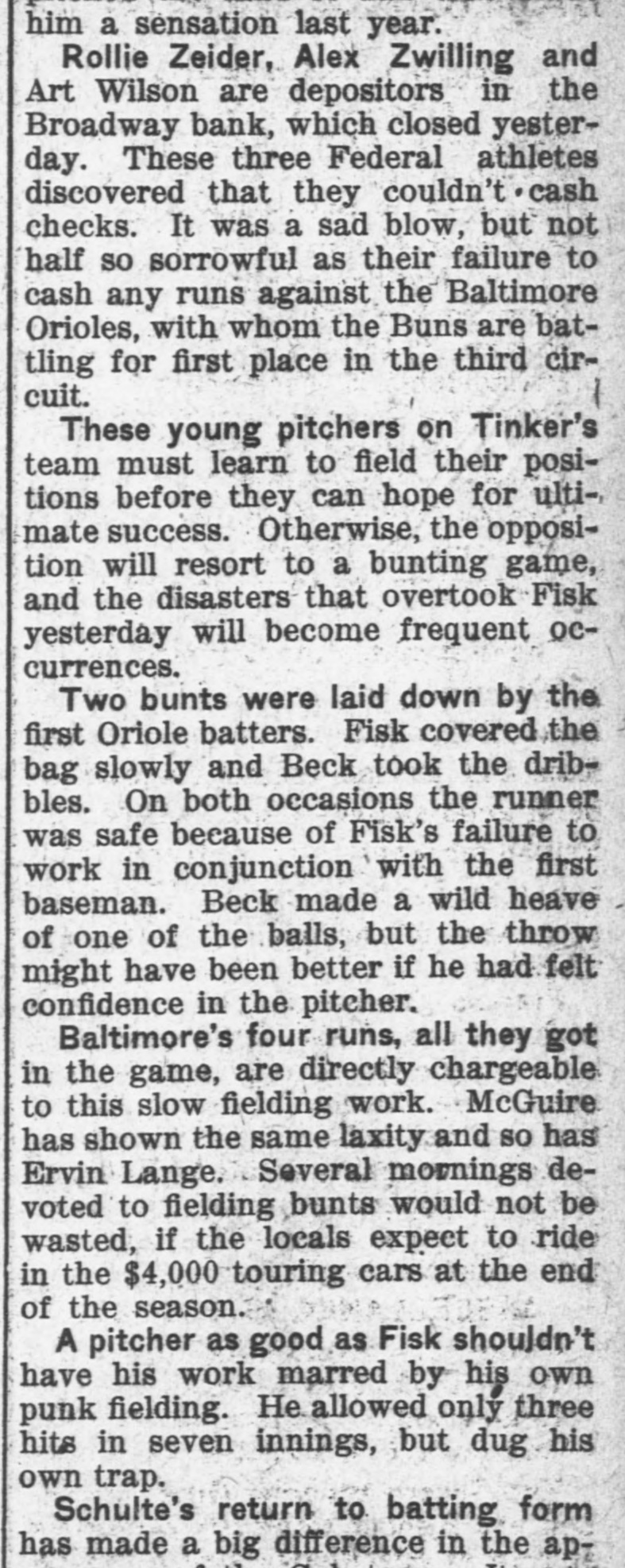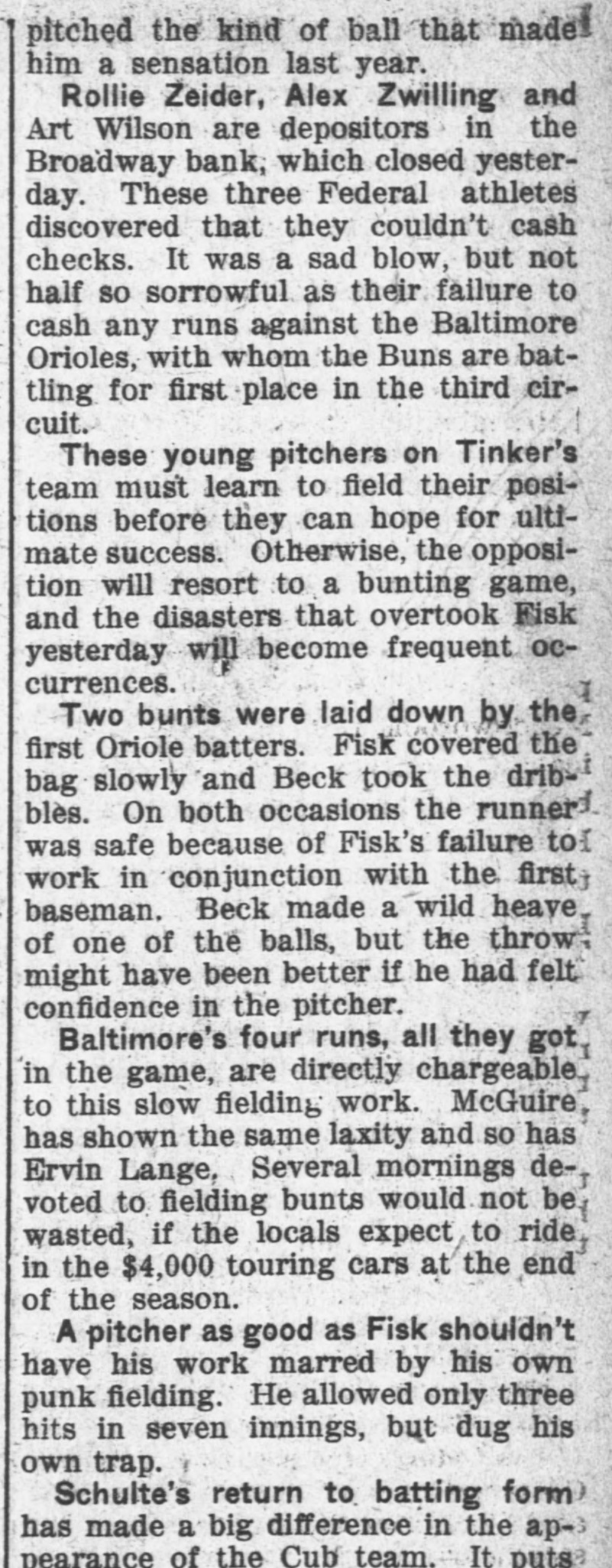 him a sensation last year. Rollie Zeider, Alex Zwilling and Art Wilson are depositors in the Broadway bank, which closed yesterday. These three Federal athletes discovered that they couldn't cash checks. It was a sad blow, but not half so sorrowful as their failure to cash any runs against the Baltimore Orioles, with whom the Buns are battling for first place in the third circuit. These young pitchers on Tinker's team must learn to field their positions before they can hope for ulti-, mate success. Otherwise, the opposition will resort to a bunting game, and the disasters that overtook Fisk yesterday will become frequent occurrences. Two bunts were laid down by the first Oriole batters. Fisk covered the bag slowly and Beck took the dribbles. On both occasions the runner was safe because of Fisk's failure to work in conjunction with the first baseman. Beck made a wild heave of one of the balls, but the throw might have been better if he had felt confidence in the pitcher. Baltimore's four runs, all they got in the game, are directly chargeable to this slow fielding work. McGuire has shown the same laxity and so has Ervin Lange. Several mornings devoted to fielding bunts would not be wasted, if the locals expect to ride in the $4,000 touring cars at the end of the season. A pitcher as good as Fisk shouldn't have his work marred by his own punk fielding. He allowed only three hits in seven innings, but dug his own trap. Schulte's return to batting form has made a big difference in the ap-