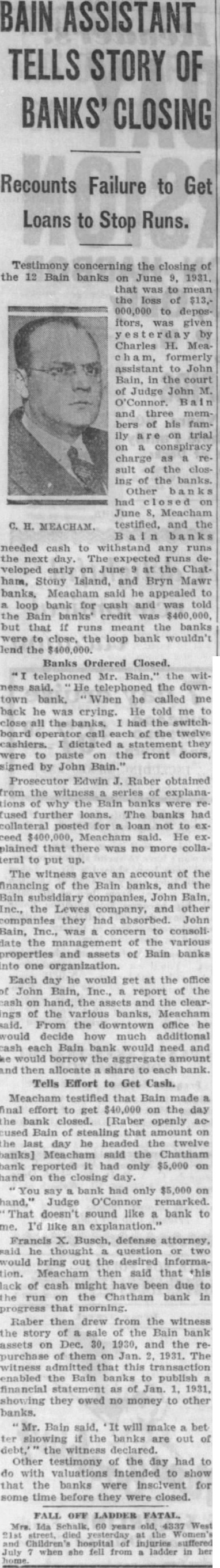 BAIN ASSISTANT TELLS STORY OF BANKS' CLOSING Recounts Failure to Get Loans to Stop Runs. Testimony concerning the closing of the 12 Bain banks on June 9, 1931. that was to mean the loss of 000,000 to depositors, was given rday by Charles Meaformerly assistant to John Bain, in the court of Judge John and three members of his famIly on trial on conspiracy charge as result of the closing of the banks. Other had on June Meacham testified, and the B banks needed cash to withstand any runs the next day. runs developed early on June at the Chat. ham, Stony Island, and Bryn Mawr banks, Meacham said he appealed to a loop bank for cash and was told the Bain banks' credit was $400,000, but that if runs meant the banks were close, the loop bank wouldn't lend the $400,000. Banks Ordered Closed. "I telephoned Mr. the ness said. He telephoned the down town bank. When he called me back he was crying. He told me to close all the banks, had the switchboard operator call each of the twelve cashiers. dictated a statement they were to paste on the front doors, signed by John Bain." Prosecutor Edwin J. Raber obtained from the witness series of explanations why the Bain banks were refused further loans. The banks had for loan not to exceed 000, said. He explained that there was no more collateral to put up. The gave an account of the financing of the Bain banks, and the Bain John Bain. Inc., the Lewes company, and other they had absorbed. John Bain, Inc., was a to consolidate the of the various properties and assets of Bain banks into one organization. Each day he would get at the office of John Bain, Inc., a report of the cash on hand, the and the clearings of the various banks, Meacham said. From the downtown office he would decide how much additional cash each Bain bank would need and ke would borrow the aggregate amount and then allocate share to each bank. Tells Effort to Get Cash. Meacham testified that Bain made a final effort to get $40,000 on the day the bank closed. [Raber openly accused Bain of stealing that amount on the last day he headed the twelve banks] Meacham said the Chatham bank reported it had only $5,000 on hand on the closing day. You say bank had only $5,000 on hand," Judge O'Connor remarked. That doesn't sound like a bank to me. I'd like an explanation." Francis X. Busch, defense attorney, said he thought question or two would bring out the desired information. Meacham then said that this lack of cash might have been due to the run on the Chatham bank in progress that morning. Raber then drew from the witness the story of a sale of the Bain bank assets on Dec. 30, 1930, and the repurchase of them on Jan. 2, 1931. The witness that this enabled the Bain banks to publish a financial as of Jan. 1, 1931, showing they owed no money to other banks. Mr. Bain said, 'It will make bet ter showing if the banks are out of debt,' the witness declared. Other testimony of the day had to do with valuations intended to show that the banks were insolvent for some time before they were closed. FALL OFF LADDER FATAL. Mrs. Ida 60 years 4337 West died the suffered when she fell from ladder in her