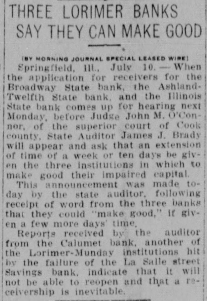 THREE LORIMER BANKS SAY THEY CAN MAKE GOOD (BY MORNING JOURNAL SPECIAL LEASED WIRE Springfield, III., July 10. - When the application for receivers for the Broadway State bank, the AshlandTwelfth State bank and the Illinois State bank comes up for hearing next Monday, before Judge John M. O'Connor, of the superior court of Cook county, State Auditor James J. Brady will appear and ask that an extension of time of a week or ten days be given the three Institutions in which to make good their impaired capital. This announcement was made today by the state auditor, following receipt of word from the three banks that they could "make good," If given a few more days' time. Reports received by the auditor from the Calumet bank, another of the Lorimer-Munday institutions hit by the failure of the La Salle street Savings bank. indicate that it will not be able to reopen and that a receivership is inevitable.