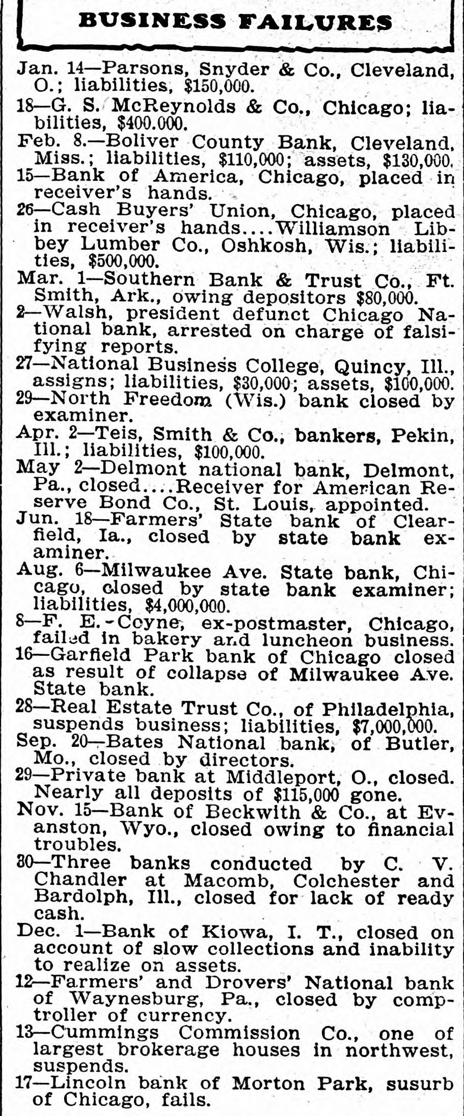 BUSINESS FAILURES Jan. 14-Parsons, Snyder & Co., Cleveland, O.; liabilities, $150,000. 18-G. S. McReynolds & Co., Chicago; liabilities, $400.000. Feb. 8.-Boliver County Bank, Cleveland, Miss.; liabilities, $110,000; assets, $130,000. 15-Bank of America, Chicago, placed in receiver's hands. 26-Cash Buyers' Union, Chicago, placed in receiver's hands Williamson Libbey Lumber Co., Oshkosh, Wis.; liabilities, $500,000. Mar. 1-Southern Bank & Trust Co., Ft. Smith, Ark., owing depositors $80,000. 2-Walsh,* president defunct Chicago National bank, arrested on charge of falsifying reports. 27-National Business College, Quincy, Ill., assigns; liabilities, $30,000; assets, $100,000. 29-North Freedom (Wis.) bank closed by examiner. Apr. 2-Teis, Smith & Co., bankers, Pekin, Ill.; liabilities, $100,000. May 2-Delmont national bank, Delmont, Pa., closed Receiver for American Reserve Bond Co., St. Louis, appointed. Jun. 18-Farmers' State bank of Clearfield, Ia., closed by state bank examiner. Aug. 6-Milwaukee Ave. State bank, Chicago, closed by state bank examiner; liabilities, $4,000,000. 8-F. E. Coyne, ex-postmaster, Chicago, failed in bakery and luncheon business. 16-Garfield Park bank of Chicago closed as result of collapse of Milwaukee Ave. State bank. 28-Real Estate Trust Co., of Philadelphia, suspends business; liabilities, $7,000,000. Sep. 20--Bates National bank, of Butler, Mo., closed by directors. 29-Private bank at Middleport, O., closed. Nearly all deposits of $115,000 gone. Nov. 15-Bank of Beckwith & Co., at Evanston, Wyo., closed owing to financial troubles. 30-Three banks conducted by C. V. Chandler at Macomb, Colchester and Bardolph, Ill., closed for lack of ready cash. Dec. 1-Bank of Kiowa, I. T., closed on account of slow collections and inability to realize on assets. 12-Farmers' and Drovers' National bank of Waynesburg, Pa., closed by comptroller of currency. 13-Cummings Commission Co., one of largest brokerage houses in northwest, suspends. 17-Lincoln bank of Morton Park, susurb of Chicago, fails.