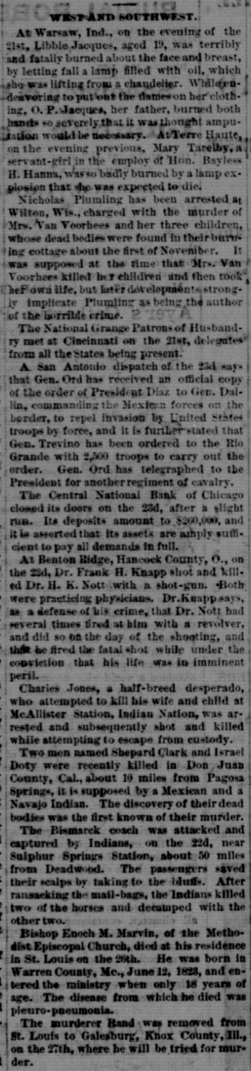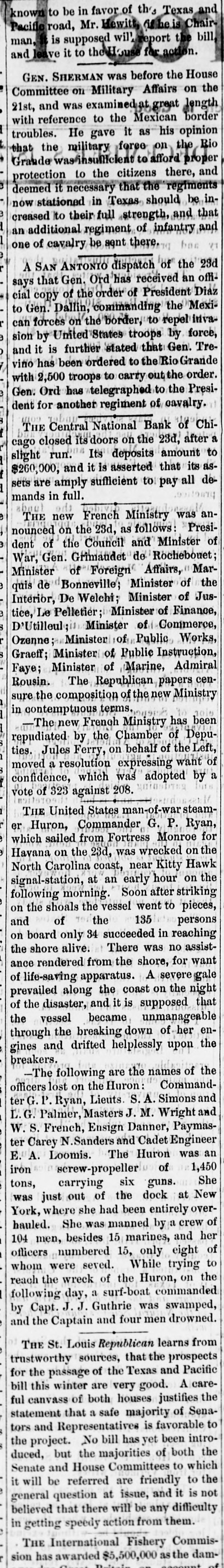 Repeal of a Portion of the Resumption Law by the house. The Senate Committee Report in Favor of Kellogg from Lousiana. List of the New French Cabinet. MISCELLANEOUS. A SPECK OF WAR. Clacionati, Nov. 23.-A San Antonio dispatch ways that Gen. Ord yesterday received an official copy of the order of President Diaz to Gen. Dalcon, commanding the Mex. ican forces on the border, to repel invasion by the United States troops by force, and and that Gen. Trevino had been ordered to the Rio Grande with 2,500 troops to carry out the order. Gen. Ord. has telegraphed to the President for another regiment of cavalry. GOING INTO LIQUIDATION. Chicago, Nov. 23.-The Central National Bank, 104 and 106 Washington street, closed its doors this morning and will go into liquidation. This action was conse quent upon the determination of the meeting of the directors and stockholders last evening. The institution did only a small commercial business and was backed by some of the substantial business men of this city, and will, its officers claim, pay dollar for dollar to depositors, and make a good showing towards paying the stockholders in full. Its liabilities to depositors are $260,000; assets $400,000 of bills receivabie, and $75,000 in cash resources. Its capital stock was $200,000. W. F. Eudicott is president and John Greenleaf cashier. It experienced a slight run yesterday, and since October 1st, although none of the depositors have closed their accounts, some $200,000 have been drawn out. THE KANSAS STATE UNIVERSITY. Lawrence, Nov. 22.-The dedication of the new building of the Kansas state university, took place here to-day. The attendance upon the exercises was large, wellknown citizens from all parts of the state being present. Gov. Anthony presided. Addresses were made by Chandler Marvin, State Superintendent Lemmon, Rev. T. Tindall, Gov. Anthony, and others. A banquet was given for the benefit of the society. Gov. Anthony was given a complimentary reception at the Ludington house, by the Young Men's social club, of Law. rence. A JURY WHICH DISAGREE. Chicago, Nov. 23.-The Jury in the condonation of whisky cases came in this morning, and reported a disagreement, nine having voted for a verdict in favor of the government, and three for the defendants. The question in dispute was whether the evidence showed that complete immunity had been promised. SHORT EXPLANATIONS. Providence, Nov. 23.-Capt. Carson. of the U. 8. cutter Samuel Dexter, lying in the Bristol harbor this morning. said he felt unauthorized to make any statements regarding his special orders and duties. He added: "There is a suspected craft, and 'her' a government steamer. Draw your