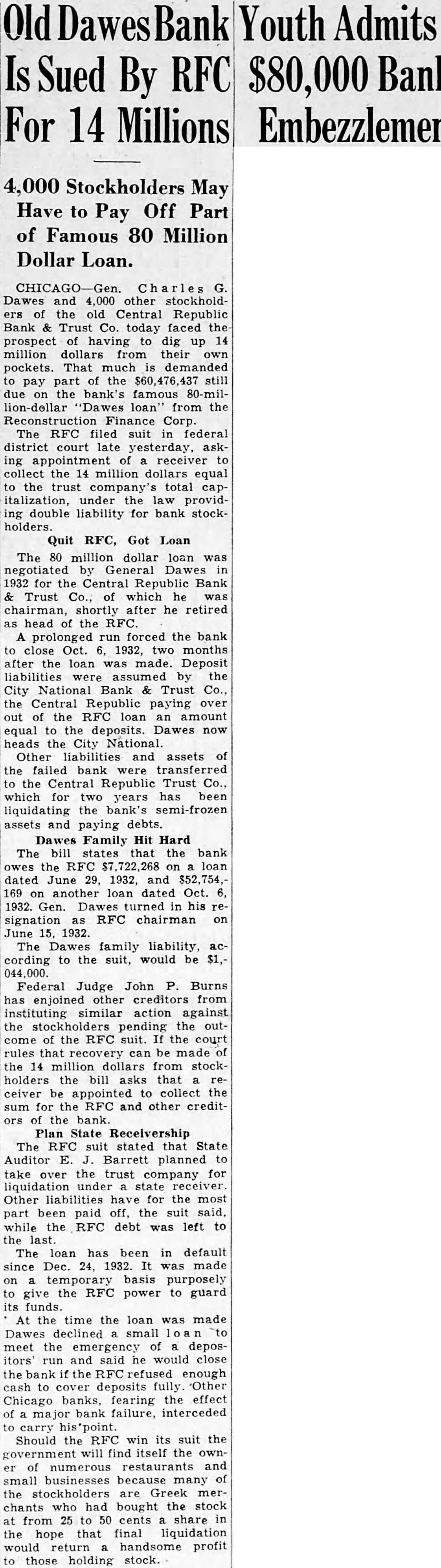 RFC By For Embezzlement Stockholders May Have to Off Part Pay of Famous 80 Million Dollar Dawes and other stockholdthe old Central Republic Bank Trust Co. today faced prospect having to dig million dollars from their pockets. That much demanded part of the still pay the bank's famous from the Reconstruction Finance Corp. The RFC filed suit in federal district court late of collect the million dollars equal the trust company's total italization, under law double liability for bank holders. Quit RFC, Got Loan The 80 million dollar loan negotiated Dawes 1932 for the Central Republic Bank Trust which he shortly after he retired head of the run forced the bank close Oct. two months after the loan made. Deposit by the City National Bank Trust the Central Republic paying of RFC loan amount equal the deposits. Dawes now heads the City National. Other liabilities and assets the failed bank transferred the Central Republic Trust which years has been liquidating the bank's assets and paying debts. Dawes Family Hit Hard The bill the bank owes the RFC on loan dated June 1932, and another loan 1932. turned in his signation RFC chairman June 15, 1932. The Dawes family liability, cording to the suit, would be Federal Judge John Burns enjoined other creditors from instituting similar action against the stockholders pending the outcome of the RFC suit. the court rules that recovery can be made the million dollars from holders the bill that ceiver be appointed collect the RFC and other creditthe bank. Plan State Receivership The RFC suit stated that State Auditor Barrett planned take over the trust company for liquidation under state Other liabilities have for the most been paid the suit while the RFC debt left to the last. The loan has been in default since Dec. 24, 1932. made on temporary basis purposely give the RFC power to guard its funds. At the time the loan made Dawes declined small the deposand said he would close the bank enough cash cover deposits fully Other Chicago banks, fearing the effect bank failure, interceded the RFC its suit the government will find itself the numerous restaurants and businesses because many stockholders Greek who had bought the stock to cents share hope that final liquidation return handsome profit holding stock.
