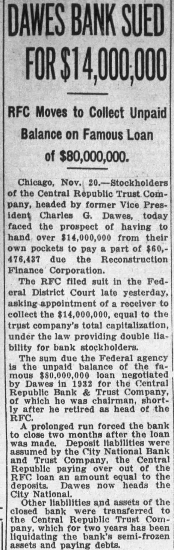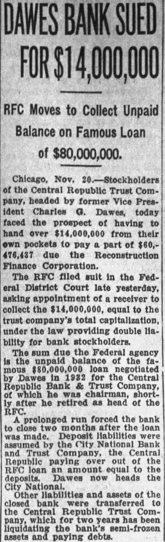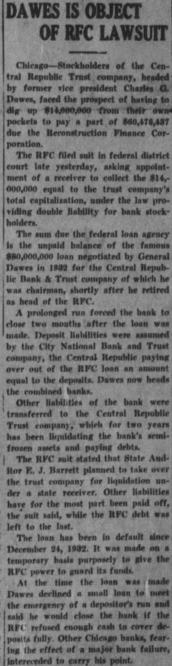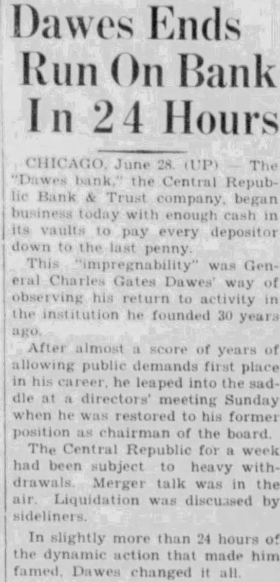 Dawes Ends Run On Bank In 24 Hours CHICAGO, June "Dawes bank,' the Central Republie Bank Trust company, began business today with enough cash in its vaults to pay every depositor down the last penny This was General Charles Gates Dawes way of his return to activity in the institution he founded 30 years After almost score of years of allowing public demands first place in his career he leaped into the saddle at directors' meeting Sunday when he restored to his former position as chairman of the board The Central Republic for week had been subject heavy withdrawals. Merger talk was in the air. Liquidation was discussed by sideliners. In slightly more than 24 hours of the action that made him famed, Dawes changed all