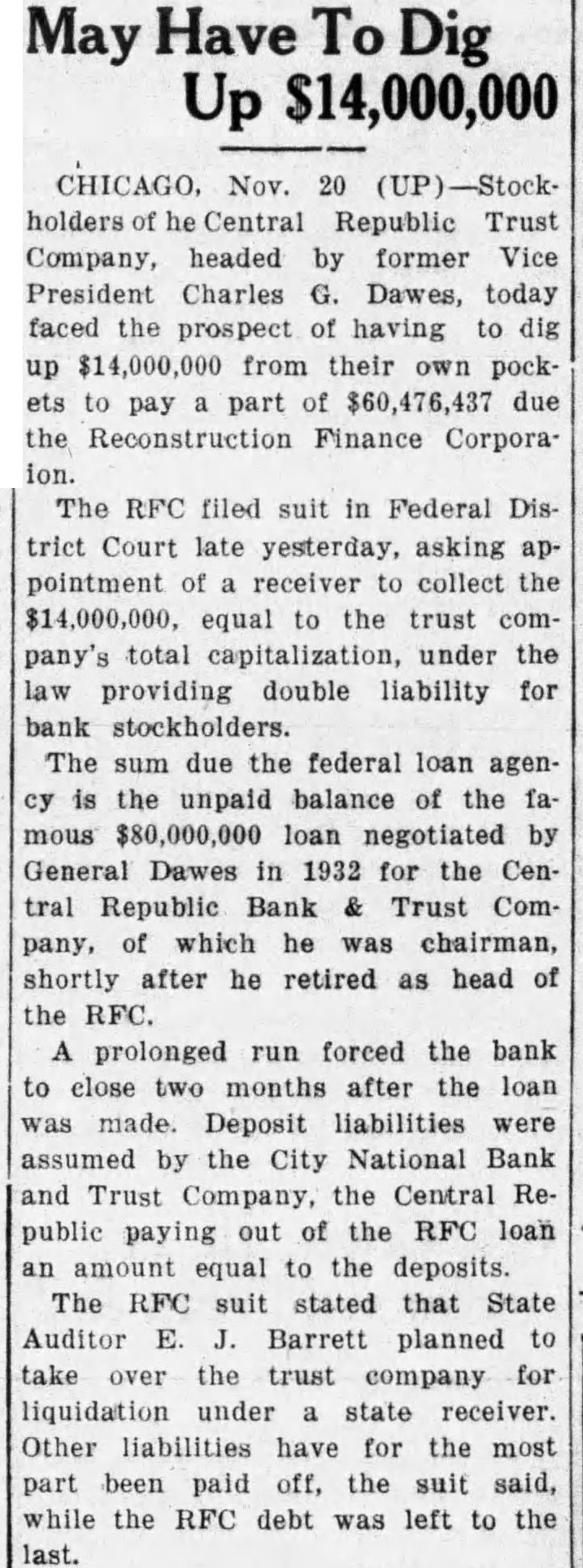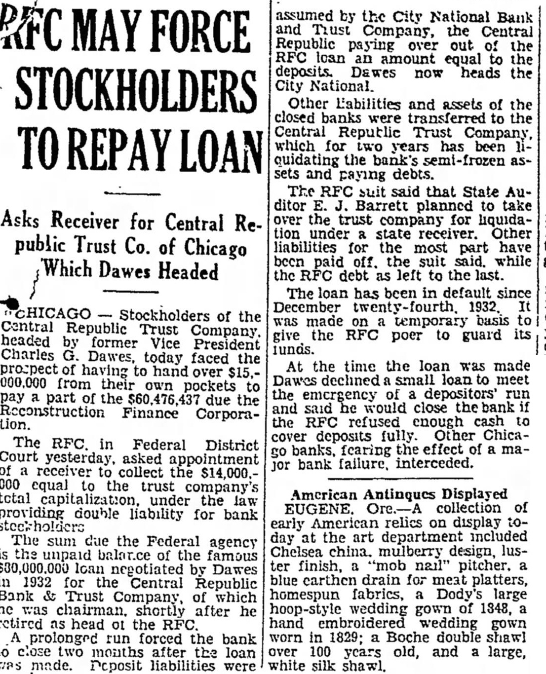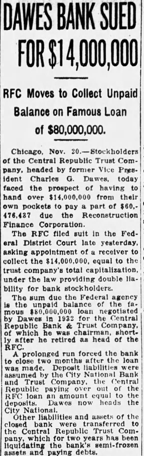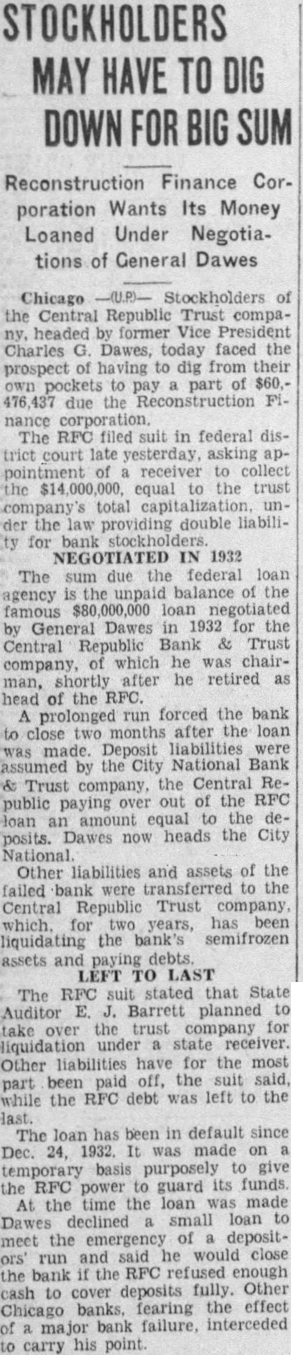 Dawes Ends Run On Bank In 24 Hours CHICAGO, June "Dawes bank,' the Central Republie Bank Trust company, began business today with enough cash in its vaults to pay every depositor down the last penny This was General Charles Gates Dawes way of his return to activity in the institution he founded 30 years After almost score of years of allowing public demands first place in his career he leaped into the saddle at directors' meeting Sunday when he restored to his former position as chairman of the board The Central Republic for week had been subject heavy withdrawals. Merger talk was in the air. Liquidation was discussed by sideliners. In slightly more than 24 hours of the action that made him famed, Dawes changed all