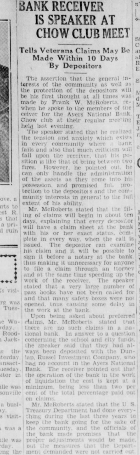(Continued from page seven) Have Lost Homes that Goebel is the They say that has actually surrendto his home. know that ought say suit now against Dunlap, pending take his home. any lost voluntarily them to the College. want to go back just moThe dated this 1927, Mr. Dunlap uary Mr. After day spent Mr. Russel, returned to Hotel wrote on Hotel paper Mr Dunlap this Mr Russel next When there Mr. had his and said, Mr. Mr. Dunlap with you on your terms. Your stuff isn't worth He said he but had to have That he had to have within 60 days, and wanted the other monthly installments. Dunlap refused that but said he would pay when he He didn't him his note, but gave word for Anyone knows they can take his word, that Millard Dunlap stands back of his word and Andrew Russel knew he Mr Dunlap thought load was taken off his mind, that checks would He Mr. Russel paid what had asked, and now he Did did not. Mr. Russel the in the next year. was out October of that Did stop then? He did He kept Mr. had fair MORE MORE MORE MORE Russel It appears from the evidence there were state deposits which Mr. Russel instances, while he in office for the Ayres believe ran two Now when money the bank we all know bankers right it and in ordinary times very siderable of the amount loaned by the bank at interest The bank always interest on time deposits. There are hundreds of thousands, in the bank by deposit and the bank has the right to loan them out to you or me that give the securNow ordinary the most of can be loaned but here's couple Andrew of gradually he could just withdraw Suppose he called on any bank in to pay the the deposit that had, isn't bank in the world that any them do If the million was loaned Russel said that and they went and for you'd isn't due pay now Russel said letter ten in made arwith the powparty) the bank being taken care This has not been done without cost humbling pride, but sure you that these easily be to some other agency at any fit. and will done the bank doesn't see fit to honor my checks Kept on Checking In January Mr. Dunlap settle on Mr. terms, and him of as you would think aft. he drew he would He was getting salary $15,000 for doing nothing except help those state deposits in Ayers National Bank He was to get $15,000 for two years and $20,000 simply for his name and what he may had these but when Mr. Russel he was procuring the for the Ayers National Bank he just put all the he Mr. in, he quit checking then up of for he would $500 and $1,000 Did he the to cash them? He did not. he had the handed them to the the teller would Mr Dunlap he handto Mr he would he had there isn't what he He cashed them the depositing them else the banks Chicago send here for and Mr. Dunlap was afraid throw them out have thrown out check on the Harris Trust and Savings or the Continental Bank of Chicago, Mr. Russel would have come out the state deposits wrecked the bank.