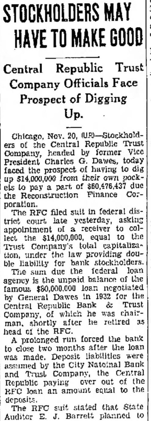 STOCKHOLDERS MAY HAVE Central Republic Trust Company Officials Face Prospect of Digging Up. Chicago, Nov. 20, (U.P)-Stockholders of the Central Republic Trust Company, headed by former Vice President Charles Dawes, today faced the prospect of having to dig $14,000,000 from their pockup of due to pay part Reconstruction Finance Co:the poration. The RFC filed sult in federal district court late yesterday, asking appointment receiver to collect the $14,000,000, equal to the Trust Company's total capitalization, under the law providing double liability for bank stockholders. The sum due the federal loan agency is the unpaid balance of the famous $80,000,000 loan negotiated by General Dawes in 1932 for the Central Republic Bank & Trust Company, of which he was chairman. shortly after he retired 35 head of the RFC. prolonged run forced the bank to close two months after the loan was made. Deposit liabilities were assumed by City Natoinal Bank and Trust Company, the Central Republic paying over out of the RFC loan an amount equal to the deposits The RFC suit stated that State Auditor E. Barrett planned to
