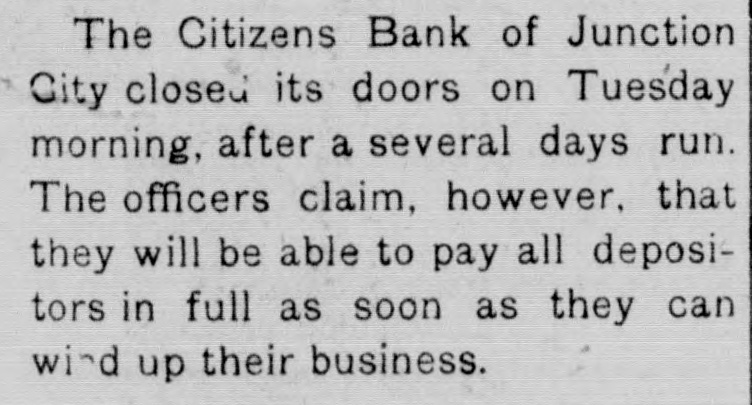The Citizens Bank of Junction City closeu its doors on Tuesday morning, after a several days run. The officers claim, however, that they will be able to pay all depositors in full as soon as they can wind up their business.