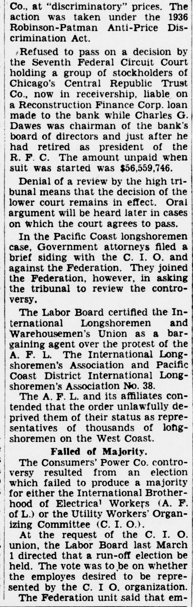 Co., at "discriminatory" prices. The action was taken under the 1936 Robinson-Patman Anti-Price Discrimination Act. Refused to pass on a decision by the Seventh Federal Circuit Court holding a group of stockholders of Chicago's Central Republic Trust Co., now in receivership, liable on a Reconstruction Finance Corp. loan made to the bank while Charles G. Dawes was chairman of the bank's board of directors and just after he had retired as president of the R. F. C. The amount unpaid when suit was started was $56,559,746. Denial of a review by the high tribunal means that the decision of the lower court remains in effect. Oral argument will be heard later in cases on which the court agrees to pass. In the Pacific Coast longshoremen case, Government attorneys filed a brief siding with the C. I. O. and against the Federation. They joined the Federation, however, in asking the tribunal to review the controversy. The Labor Board certified the International Longshoremen and Warehousemen's Union as a bargaining agent over the protest of the A. F. L. The International Longshoremen's Association and Pacific Coast District International Longshoremen's Association No. 38. The A. F. L. and its affiliates contended that the order unlawfully deprived them of their status as representatives of thousands of longshoremen on the West Coast. Failed of Majority. The Consumers' Power Co. controversy resulted from an election which failed to produce a majority for either the International Brotherhood of Electrical Workers (A. F. of L.) or the Utility Workers' Organizing Committee (C.I.O.). At the request of the C. I. O. union, the Labor Board last March 1 directed that a run-off election be held. The vote was to be on whether the employes desired to be represented by the C. I O. organization. The Federation unit said that em-
