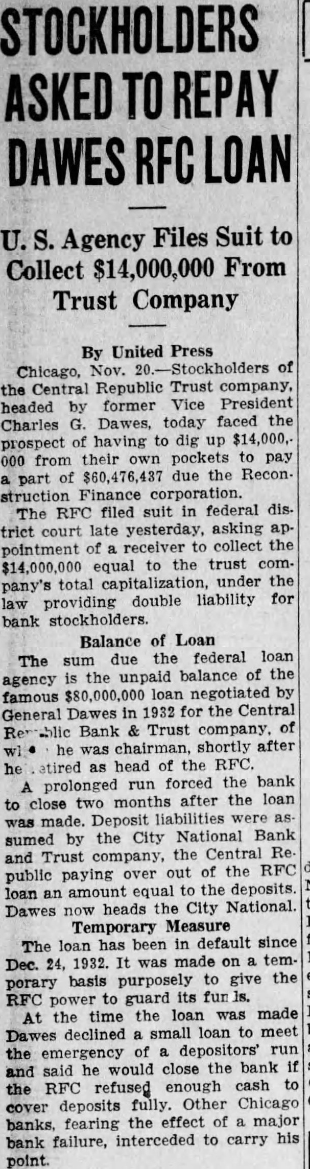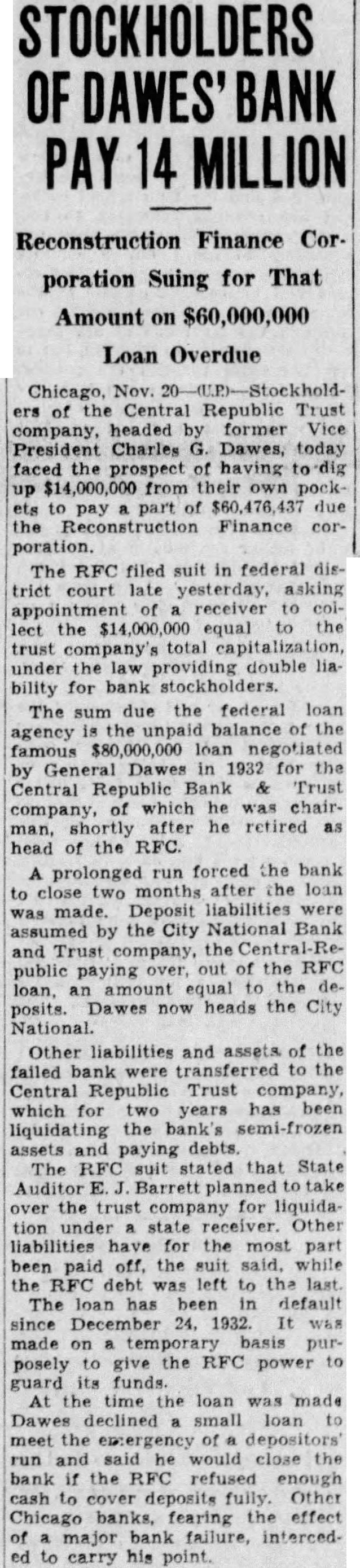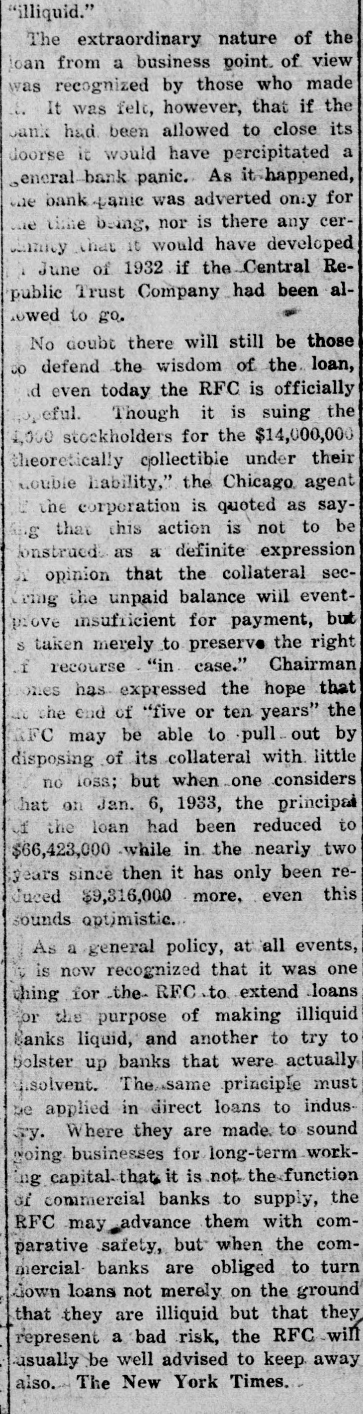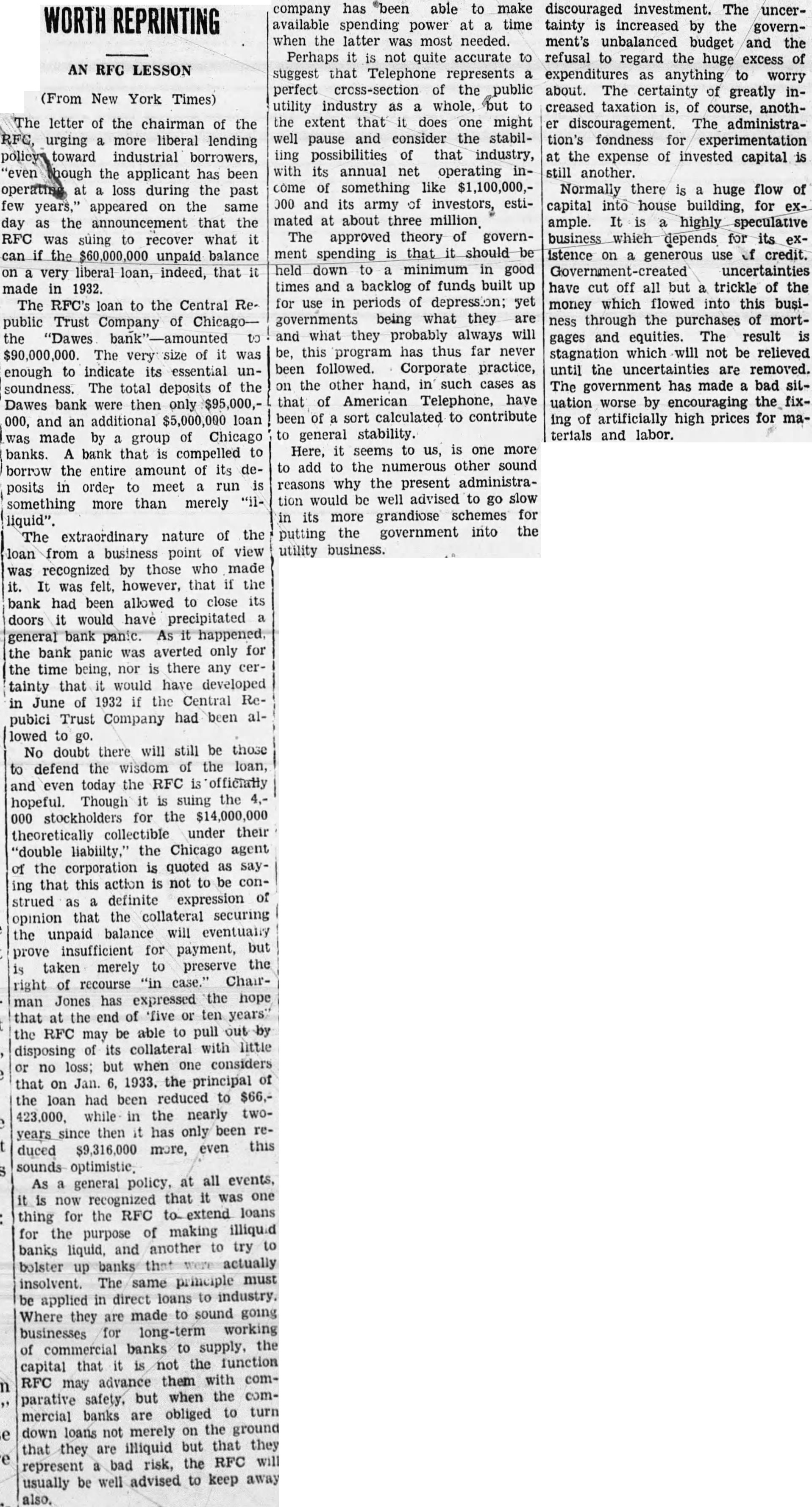 The letter of the chairman of the RFC, urging more liberal lending policy toward industrial borrowers, "even the applicant has been operating at loss during the past few years," appeared on the same day as the announcement that the RFC was suing to recover what it can the $60,000,000 unpaid balance very liberal loan, indeed, that it made in 1932. The RFC's loan to the Central Republic Trust Company Chicagothe "Dawes to $90,000,000. The size of it was enough to indicate its essential unsoundness. The total deposits of the Dawes bank were then only 000, and additional $5,000,000 loan made by group of Chicago banks. bank that is compelled to borrow the entire amount of its deposits in order to meet run something more than merely liquid". The extraordinary nature of the loan from business point of view was recognized by those who made It was felt, however, that if the bank had been allowed to close its doors it would have precipitated general bank panic. happened. the bank panic was averted only for the time being, nor there any certainty that would have developed 1932 if the Central Rein June Trust Company had been allowed to No doubt there will still be those to defend the wisdom of the loan, and even today the RFC officially hopeful. Though is suing the stockholders for the $14,000,000 theoretically collectible under their "double liability," the Chicago agent of the corporation is quoted saying that this action is not to be construed definite expression of opinion that the collateral securing the unpaid balance will eventually prove insufficient for payment, but taken merely to preserve the right of recourse "in Chairman Jones has expressed the hope that the end of 'five ten years" the RFC may be able to pull out by disposing of its collateral with little no loss; but when one considers that on Jan. 1933. the principal of the loan had been reduced to $66,423,000. while in the nearly twoyears since then has only been reduced $9,316,000 more, even this sounds As general policy, at all events. now recognized that it one thing for the RFC extend loans for the purpose of making illiquid banks liquid, and another to try to bolster up banks actually insolvent. The same principle must be applied in direct loans industry. Where they are made to sound going businesses for long-term working of commercial banks to supply, the capital that is not the function RFC may advance them with comwhen comparative but mercial banks are obliged to turn down loans not merely on the ground that they are illiquid but that they the RFC will represent bad risk, usually be well advised to keep away company has able to make available spending time power when the latter was most needed. Perhaps it not quite accurate to suggest that Telephone represents perfect cross-section of the public utility industry as whole, but to the extent that does one might well pause and consider the stabiliing possibilities that industry, with its annual net operating income of something like $1,100,000,000 and its army of investors, estimated at about three million The approved theory of government spending that should be held down minimum in good times and backlog of funds built up for use in periods of depression; yet governments being what they are and what they probably always be, this program thus far never been followed. Corporate practice, on the other hand, in such cases as that of American Telephone, been of sort calculated to contribute general stability. Here, it seems us, is one more to add to the numerous other sound reasons why the present administration would be well advised to go slow in its more grandiose schemes for putting the government into the utility business. discouraged investment. The uncertainty is increased by the government's unbalanced budget and the refusal to regard the huge excess of expenditures anything to worry about. The certainty of greatly increased taxation is, of course, another discouragement. The administration's fondness for experimentation at the expense of invested capital is still another. Normally there huge flow of capital into house building, for ample. It is highly speculative business which depends for its istence on generous use of credit. uncertainties have cut off all but trickle of the money which flowed into this business through the purchases of mortgages and equities. The result stagnation which will not be relieved until the uncertainties are removed. The government has made bad situation worse encouraging the fixing artificially high prices for materials and labor.