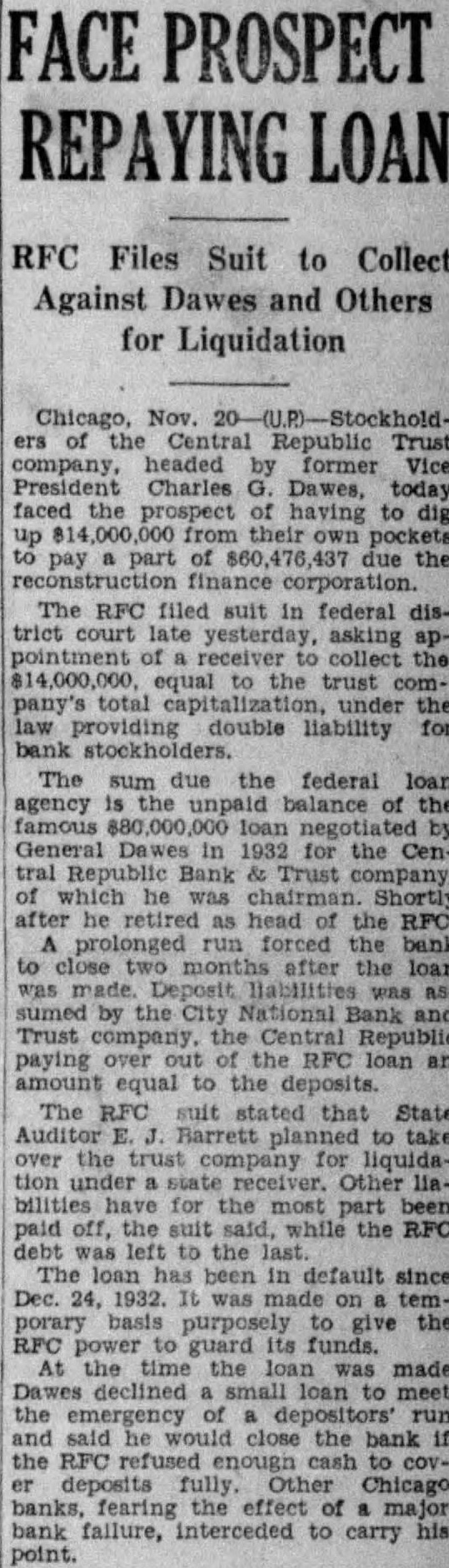 The sum due the federal loan agency the unpaid balance of the famous $80,000,000 loan negotiated by General Dawes in 1932 for the Central Republie Bank Trust company of which he chairman, shortly after he retired head of the RFC. A prolonged run forced the bank to close two months after the loan was made. Deposit liabilities were assumed by the City National Bank and Trust the Central Republic paying company, over out of the RFC loan an amount equal to the deposits. Dawes now heads the combined banks. Other liabilities of the bank were transferred to the Central Republic Trust which for two years company, has been liquidating the bank's semifrozen assets and paying debts. The RFC suit stated that State AudBarrett planned to take over the trust for liquidation uncompany der state receiver. Other liabilities have for the most part been paid off, the suit said, while the RFC debt was left to the Inst. The loan has been in default since December 24, 1932. It was made basis to give the temporary purposely RFC power to guard its funds. At the time the loan made declined small loan to meet Dawes the emergency of depositor's run and said he would close the bank if the RFC refused enough cash to cover posits fully. Other Chicago banks, fearIng the effect of major bank failure, intereceded to carry his point.