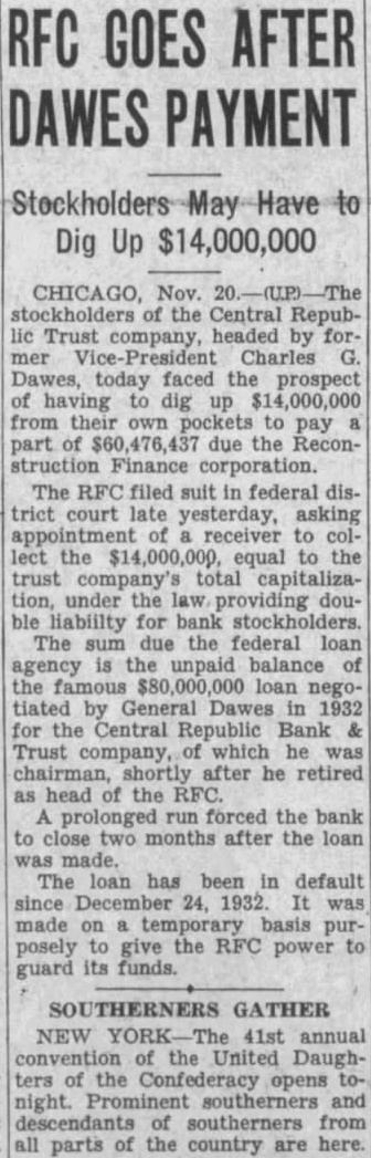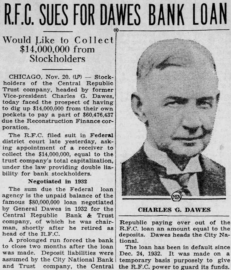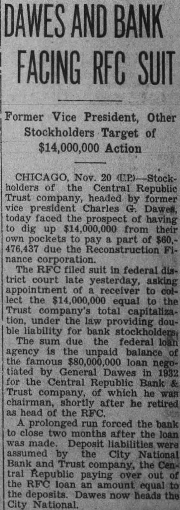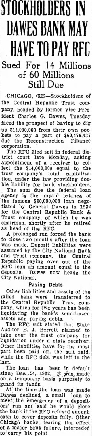 CHICAGO, of the Central Republic Trust com pany, headed by former Vice Pres ident Charles G. Dawes, Tuesday faced the prospect of having to dig $14,000,000 from their own pockets pay part of due the Reconstruction Finance The RFC filed suit in federal district court late Monday, asking of receiver to lect the $14,000,000 equal to the trust total capitaliza tion, under the law providing double liability for bank The sum due the federal loan agency the unpaid balance the $80,000,000 loan nego by General Dawes 1932 for the Central Republic Bank Trust company, of which he was shortly after he retired as head of the prolonged run forced the bank close months after the loan was made. Deposit liabilities were assumed by the City National Bank and Trust ompany, the Central Republic paying over out of the RFC loan an amount equal to the deposits. Dawes now heads the City National.