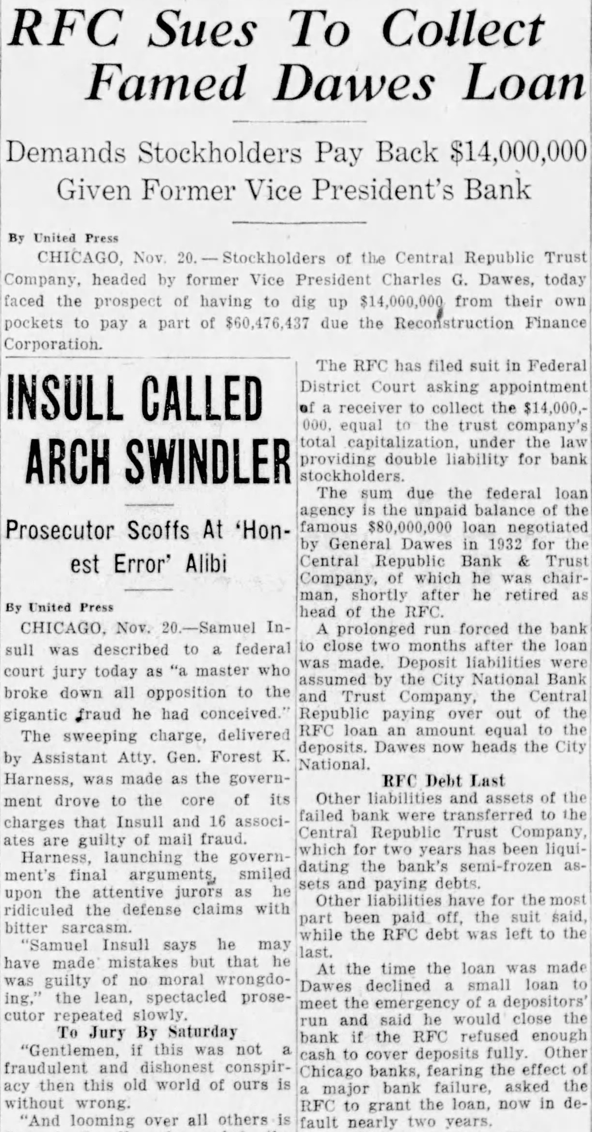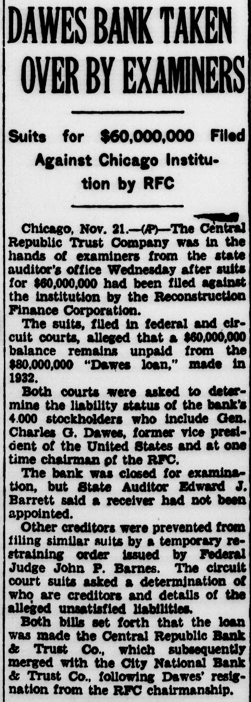 DAWES BANK TAKEN OVER BY EXAMINERS Suits for $60,000,000 Filed Against Chicago Institution by RFC Chicago, Nov. 21.-(P)-The Central Republic Trust Company was in the hands of examiners from the state auditor's office Wednesday after suits for $60,000,000 had been filed against the institution by the Reconstruction Finance Corporation. The suits, filed in federal and circuit courts, alleged that a $60,000,000 balance remains unpaid from the $80,000,000 "Dawes loan," made in 1932. Both courts were asked to determine the liability status of the bank's 4.000 stockholders who include Gen. Charles G. Dawes, former vice president of the United States and at one time chairman of the RFC. The bank was closed for examination, but State Auditor Edward J. Barrett said a receiver had not been appointed. Other creditors were prevented from filing similar suits by a temporary restraining order issued by Federal Judge John P. Barnes. The circuit court suits asked a determination of who are creditors and details of the alleged unsatisfied liabilities. Both bills set forth that the loan was made the Central Republic Bank & Trust Co., which subsequently merged with the City National Bank & Trust Co., following Dawes' resignation from the RFC chairmanship.