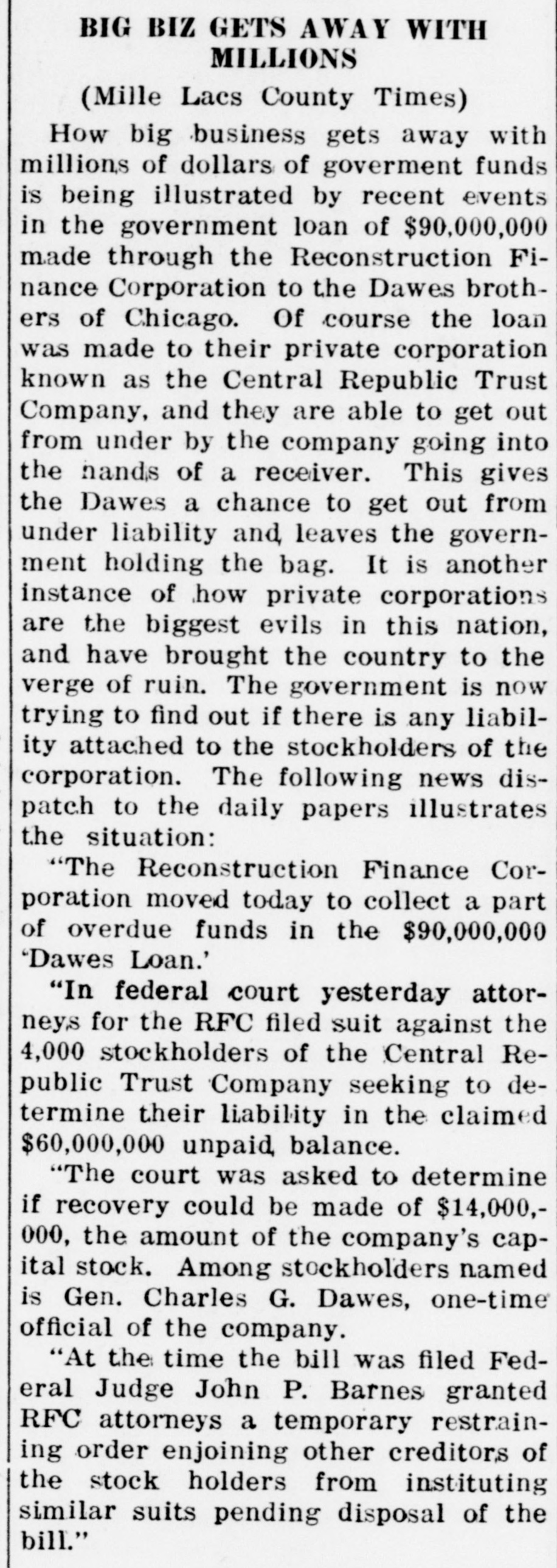 How big business gets away with millions of dollars of goverment funds is being illustrated by recent events in the government loan of $90,000,000 made through the Reconstruction Finance Corporation to the Dawes brothers of Chicago. Of course the loan was made to their private corporation known as the Central Republic Trust Company, and they are able to get out from under by the company going into the hands of a receiver. This gives the Dawes a chance to get out from under liability and leaves the government holding the bag. It is another instance of how private corporations are the biggest evils in this nation, and have brought the country to the verge of ruin. The government is now trying to find out if there is any liability attached to the stockholders of the corporation. The following news dispatch to the daily papers illustrates the situation: