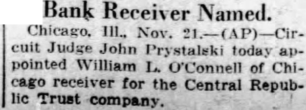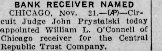 BANK RECEIVER NAMED Nov. cuit Judge John today appointed William O'Connell Chicago receiver the Central Republic Trust Company.