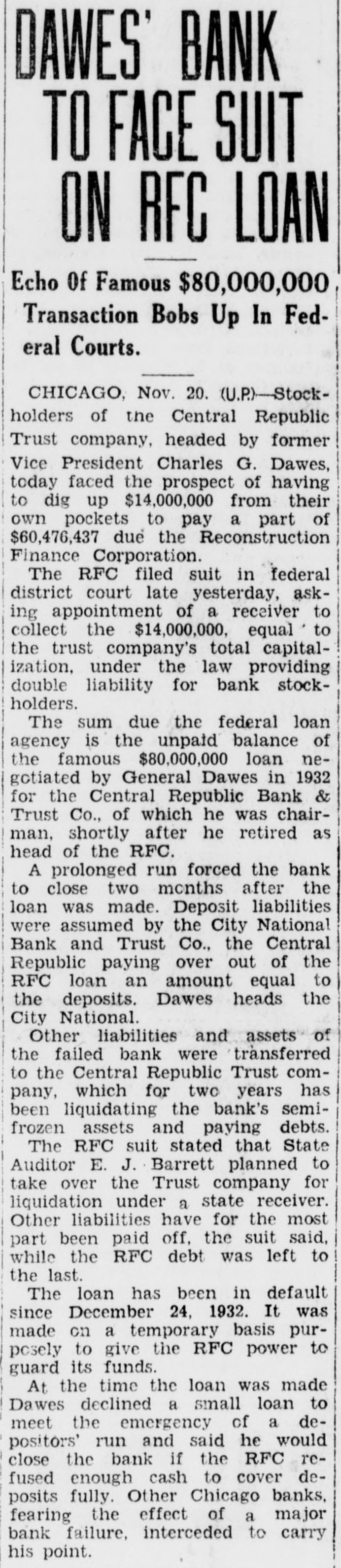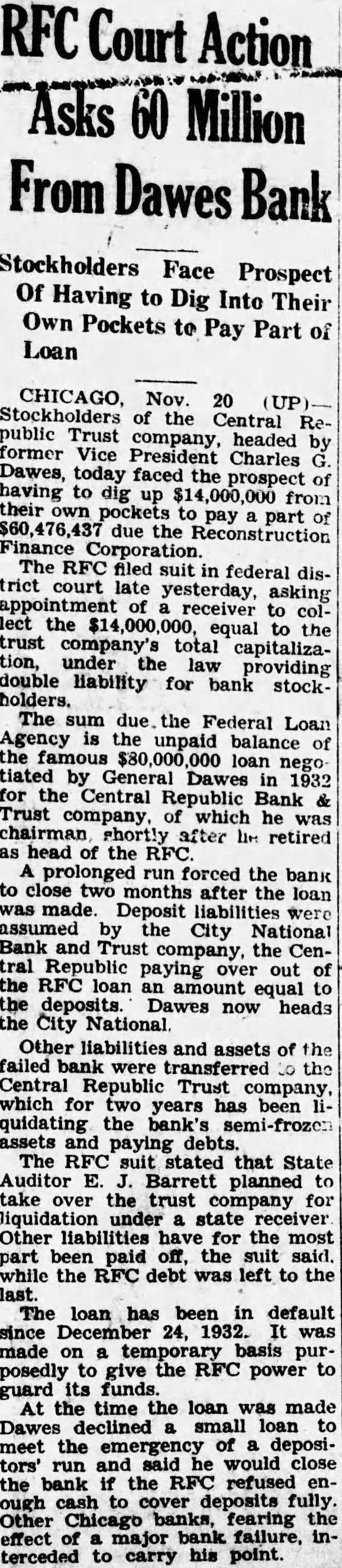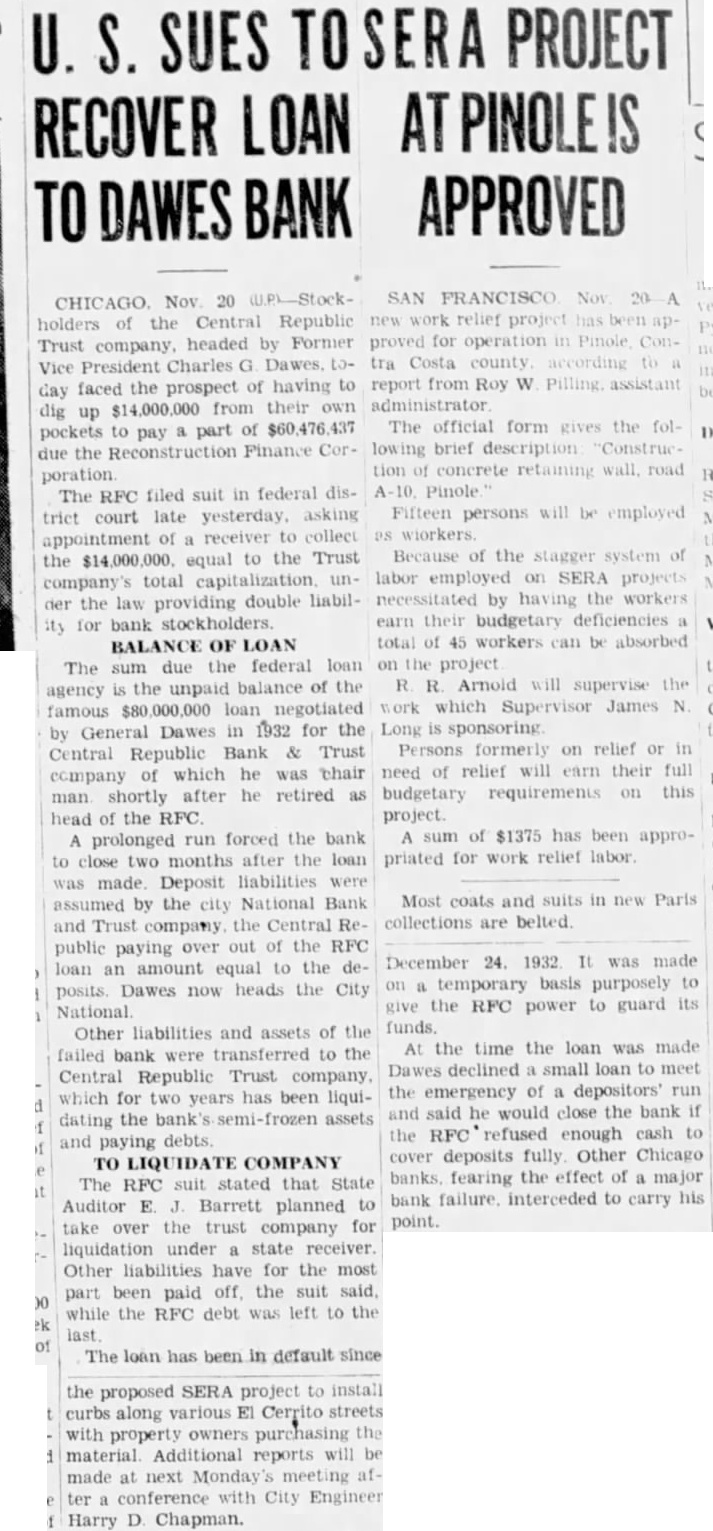 U. S. SUES TO SERA PROJECT RECOVER LOAN APPROVED TO DAWES BANK CHICAGO. Nov 20 of the Central Republic Trust company, headed by Former Vice President Charles G Dawes tothe prospect of having to day faced $14,000,000 from their own dig up pockets to pay a part of $60,476,437 due the Reconstruction Finance Corporation The RFC filed suit in federal district court late yesterday, asking appointment of a receiver to collect the $14,000,000. equal to the Trust company's total capitalization under the law providing double liability for bank stockholders. BALANCE OF LOAN The sum due the federal loan agency is the unpaid balance of the famous $80,000,000 loan negotiated by General Dawes in 1932 for the Central Republic Bank & Trust company of which he was chair man shortly after he retired as head of the RFC. A prolonged run forced the bank to close two months after the loan was made. Deposit liabilities were assumed by the city National Bank and Trust company the Central Republic paying over out of the RFC loan an amount equal to the deposits. Dawes now heads the City National Other liabilities and assets of the failed bank were transferred to the Central Republic Trust company, which for two years has been liquidating the bank's semi-frozen assets and paying debts TO LIQUIDATE COMPANY The RFC suit stated that State Auditor E. J. Barrett planned to take over the trust company for liquidation under a state receiver Other liabilities have for the most part been paid off. the suit said, while the RFC debt was left to the The loan has been in default since SAN FRANCISCO new proved for in Contra Costa county report from Roy W Pilling assistant administrator The official form gives the following brief description "Construe tion of concrete retaining wall. road Pinole Fifteen persons be employed Because of the stagger system of labor employed on SERA projects necessitated by having the workers earn their budgetary deficiencies total of 45 workers can be absorbed on the project R. R. Arnold will supervise the work which Supervisor James N. Long is sponsoring Persons formerly on relief or in need of relief will earn their full budgetary requirements on this project. A sum of $1375 has been appropriated for work relief labor Most coats and suits in new Paris collections are belted December 24. 1932 It was made on a temporary basis purposely to give the RFC power to guard its At the time the loan was made Dawes declined small loan to meet the emergency of a depositors' run and said he would close the bank if the RFC refused enough cash to cover deposits fully Other Chicago banks. fearing the effect of a major bank failure. interceded to carry his point. the proposed SERA project to install curbs along various El Cerrito streets with property owners purchasing the material Additional reports will be made at next Monday's meeting at ter conference with City Engineer Harry D. Chapman.