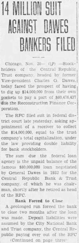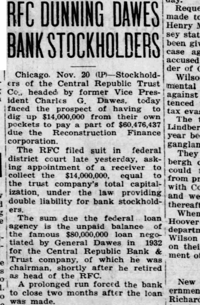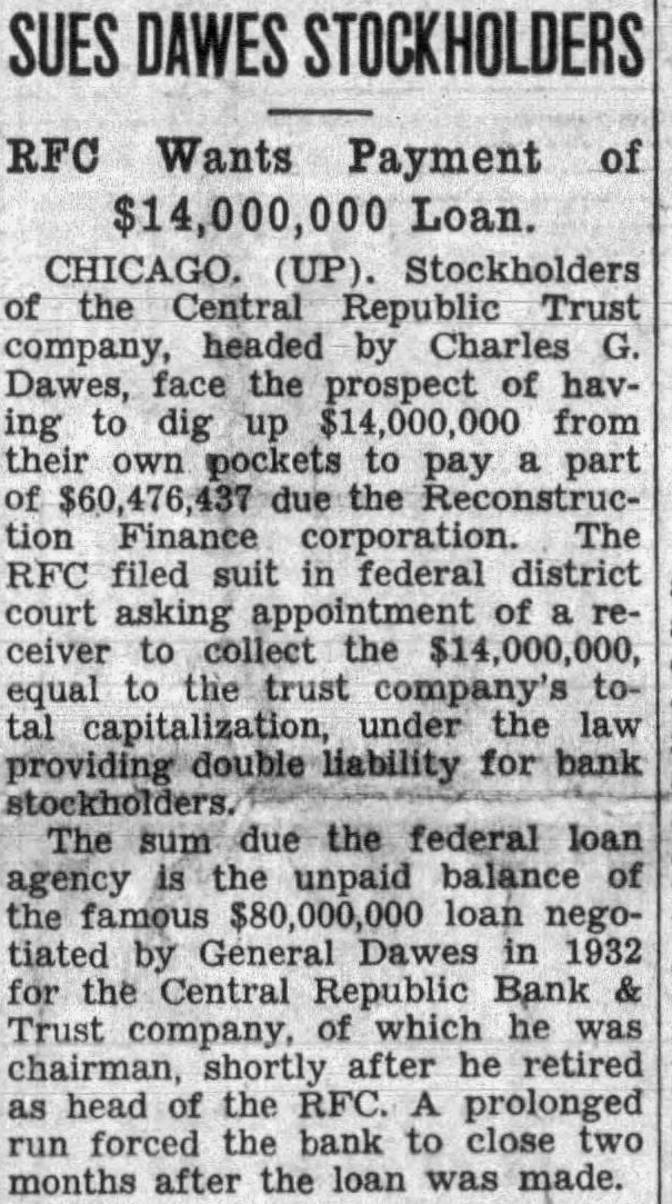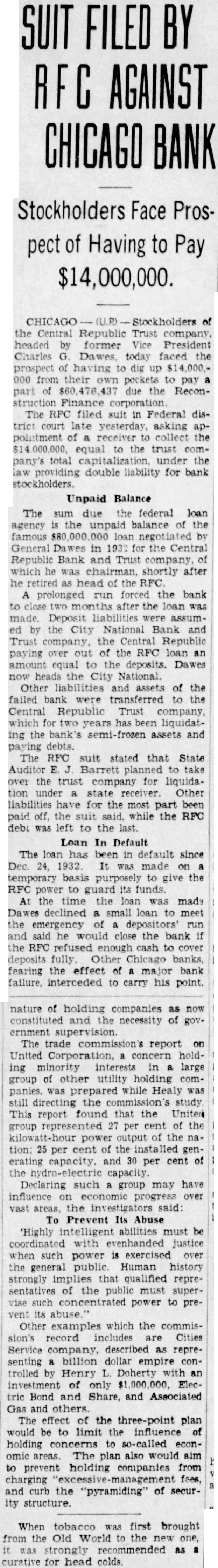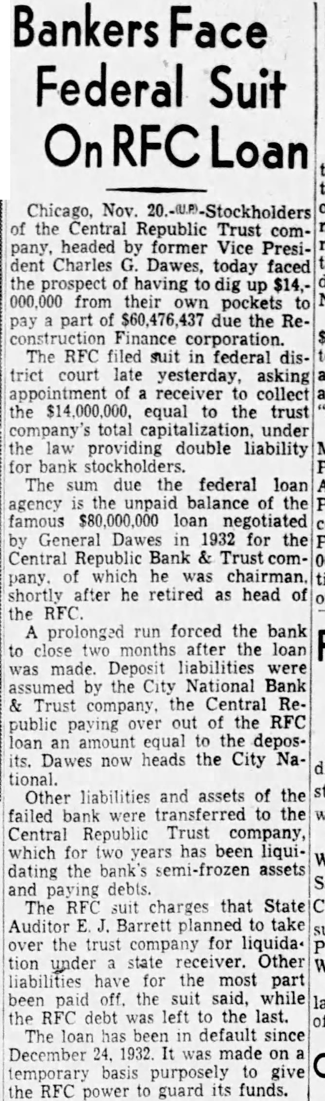 U. S. SUES TO SERA PROJECT RECOVER LOAN APPROVED TO DAWES BANK CHICAGO. Nov 20 of the Central Republic Trust company, headed by Former Vice President Charles G Dawes tothe prospect of having to day faced $14,000,000 from their own dig up pockets to pay a part of $60,476,437 due the Reconstruction Finance Corporation The RFC filed suit in federal district court late yesterday, asking appointment of a receiver to collect the $14,000,000. equal to the Trust company's total capitalization under the law providing double liability for bank stockholders. BALANCE OF LOAN The sum due the federal loan agency is the unpaid balance of the famous $80,000,000 loan negotiated by General Dawes in 1932 for the Central Republic Bank & Trust company of which he was chair man shortly after he retired as head of the RFC. A prolonged run forced the bank to close two months after the loan was made. Deposit liabilities were assumed by the city National Bank and Trust company the Central Republic paying over out of the RFC loan an amount equal to the deposits. Dawes now heads the City National Other liabilities and assets of the failed bank were transferred to the Central Republic Trust company, which for two years has been liquidating the bank's semi-frozen assets and paying debts TO LIQUIDATE COMPANY The RFC suit stated that State Auditor E. J. Barrett planned to take over the trust company for liquidation under a state receiver Other liabilities have for the most part been paid off. the suit said, while the RFC debt was left to the The loan has been in default since SAN FRANCISCO new proved for in Contra Costa county report from Roy W Pilling assistant administrator The official form gives the following brief description "Construe tion of concrete retaining wall. road Pinole Fifteen persons be employed Because of the stagger system of labor employed on SERA projects necessitated by having the workers earn their budgetary deficiencies total of 45 workers can be absorbed on the project R. R. Arnold will supervise the work which Supervisor James N. Long is sponsoring Persons formerly on relief or in need of relief will earn their full budgetary requirements on this project. A sum of $1375 has been appropriated for work relief labor Most coats and suits in new Paris collections are belted December 24. 1932 It was made on a temporary basis purposely to give the RFC power to guard its At the time the loan was made Dawes declined small loan to meet the emergency of a depositors' run and said he would close the bank if the RFC refused enough cash to cover deposits fully Other Chicago banks. fearing the effect of a major bank failure. interceded to carry his point. the proposed SERA project to install curbs along various El Cerrito streets with property owners purchasing the material Additional reports will be made at next Monday's meeting at ter conference with City Engineer Harry D. Chapman.