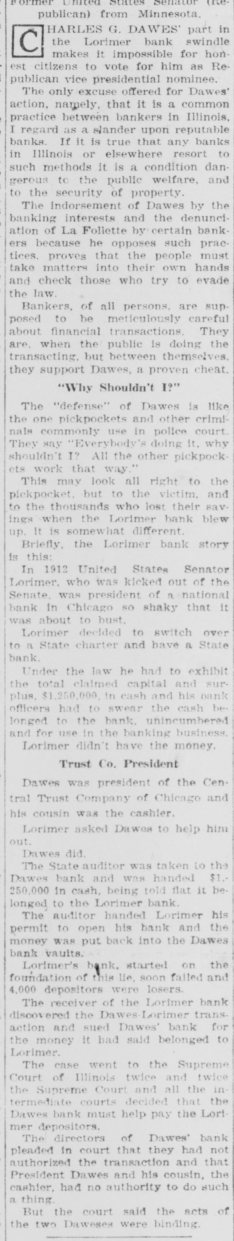 publican) from Minnesota. HARLES G. DAWES' part in the Lorimer bank swindle C makes it impossible for honest citizens to vote for him as Republican vice presidential nominee. The only excuse offered for Dawes' action, namely, that it is a common practice between bankers in Illinois, I regard as a slander upon reputable banks. If it is true that any banks in Illinois or elsewhere resort to such methods it is a condition dangerous to the public welfare, and to the security of property. The indorsement of Dawes by the banking interests and the denunciation of La Follette by certain bankers because he opposes such practices. proves that the people must take matters into their own hands and check those who try to evade the law. Bankers, of all persons, are supposed to be meticulously careful about financial transactions. They are, when the public is doing the transacting, but between themselves. they support Dawes, a proven cheat. "Why Shouldn't I?" The "defense" of Dawes is like the one pickpockets and other criminals commonly use in police court. They say "Everybody's doing it. why shouldn't I? All the other pickpockets work that way." This may look all right to the pickpocket. but to the victim, and to the thousands who lost their savings when the Lorimer bank blew up. It is somewhat different. Briefly, the Lorimer bank story is this: In 1912 United States Senator Lorimer, who was kicked out of the Senate. was president of a national bank in Chicago SO shaky that it was about to bust. Lorimer decided to switch over to a State charter and have a State bank. Under the law he had to exhibit the total claimed capital and surplus, $1,250,000. in cash and his bank officers had to swear the cash belonged to the bank. unincumbered and for use in the banking business. Lorimer didn't have the money. Trust Co. President Dawes was president of the Central Trust Company of Chicago and his cousin was the cashier. Lorimer asked Dawes to help him out. Dawes did. The State auditor was taken to the Dawes bank and was handed $1.250,000 in cash, being told flat it belonged to the Lorimer bank. The auditor handed Lorimer his permit to open his bank and the money was put back into the Dawes bank vaults. Lorimer's bank, started on the foundation of this lie, soon falled and 4,000 depositors were losers. The receiver of the Lorimer bank discovered the Dawes Lorimer trans. action and sued Dawes' bank for the money it had said belonged to Lorimer. The case went to the Supreme Court of Illinois twice and twice the Supreme Court and all the intermediate courts decided that the Dawes bank must help pay the Lorimer depositors. The directors of Dawes' bank pleaded in court that they had not authorized the transaction and that President Dawes and his cousin, the cashier, had no authority to do such a thing. But the court said the acts of the two Daweses were binding.