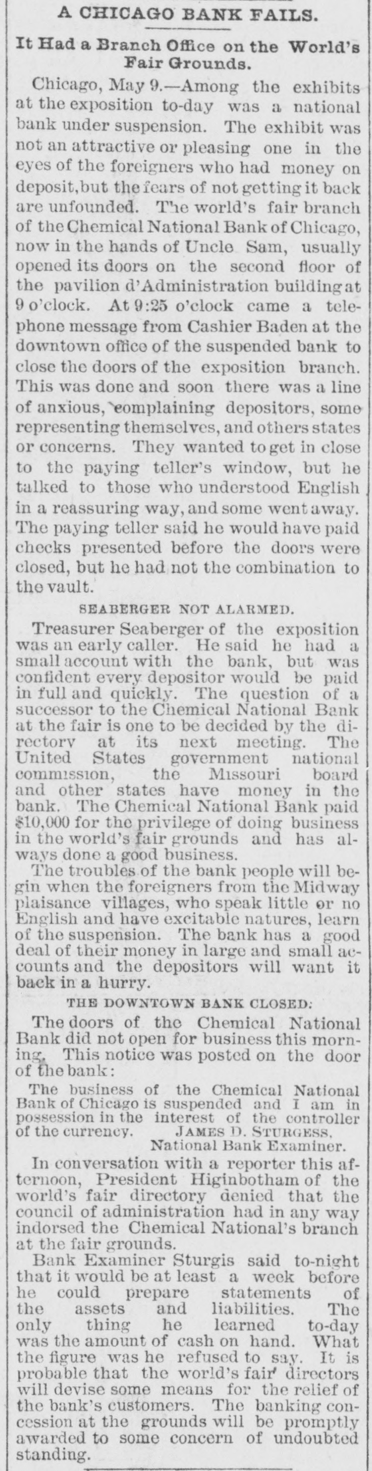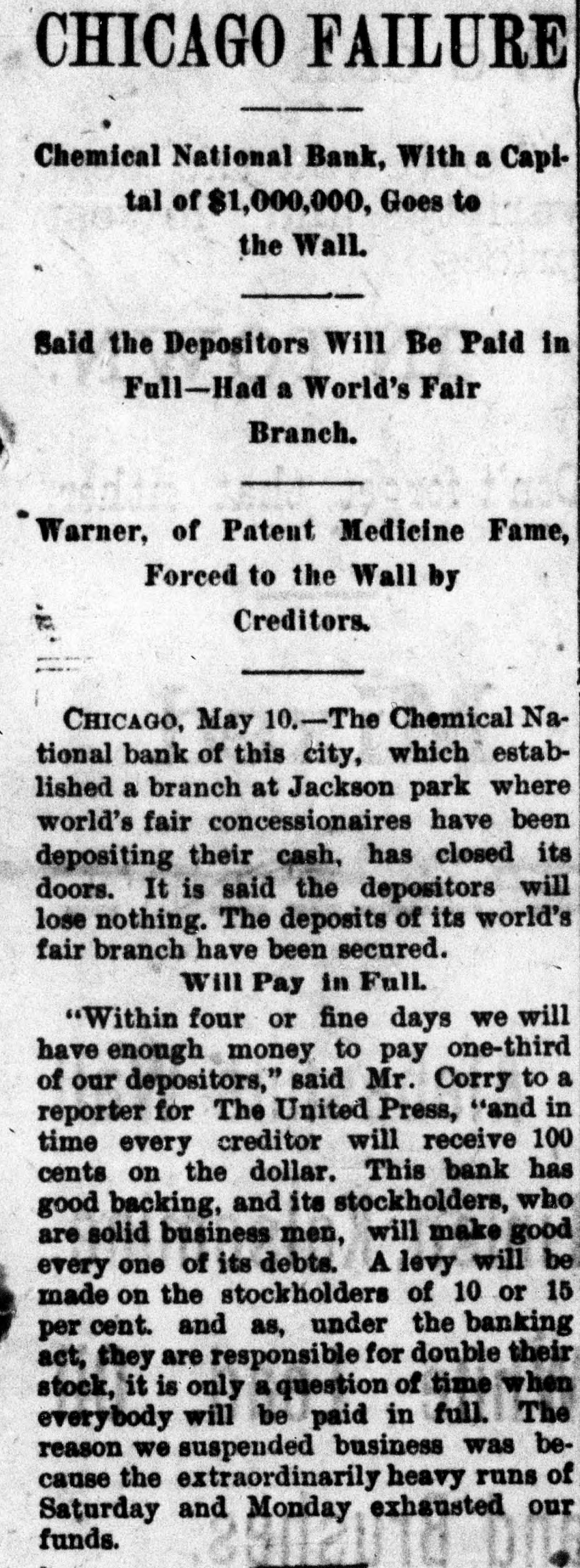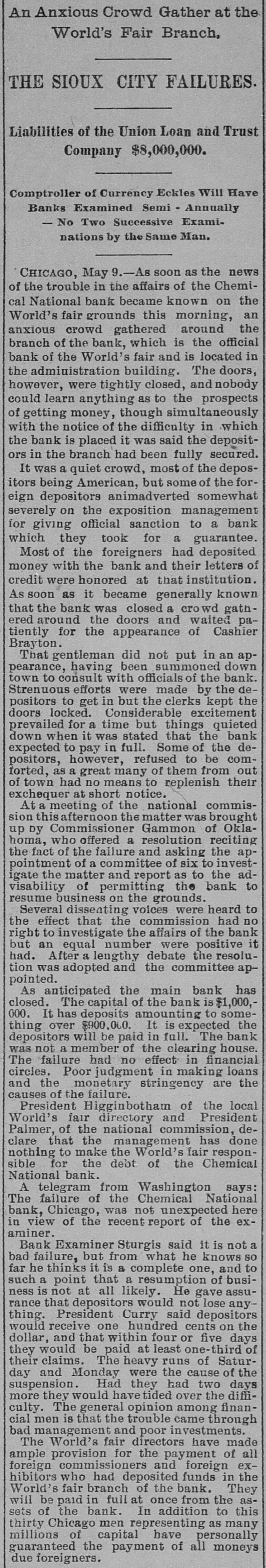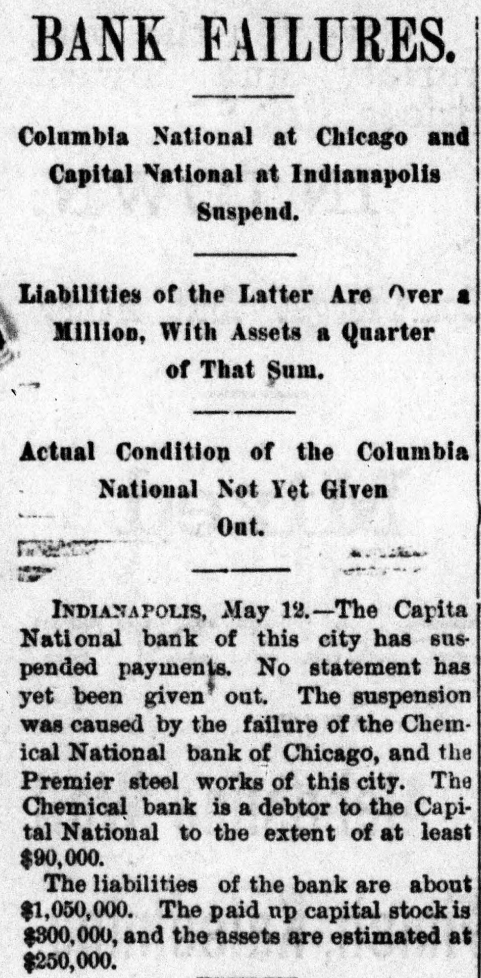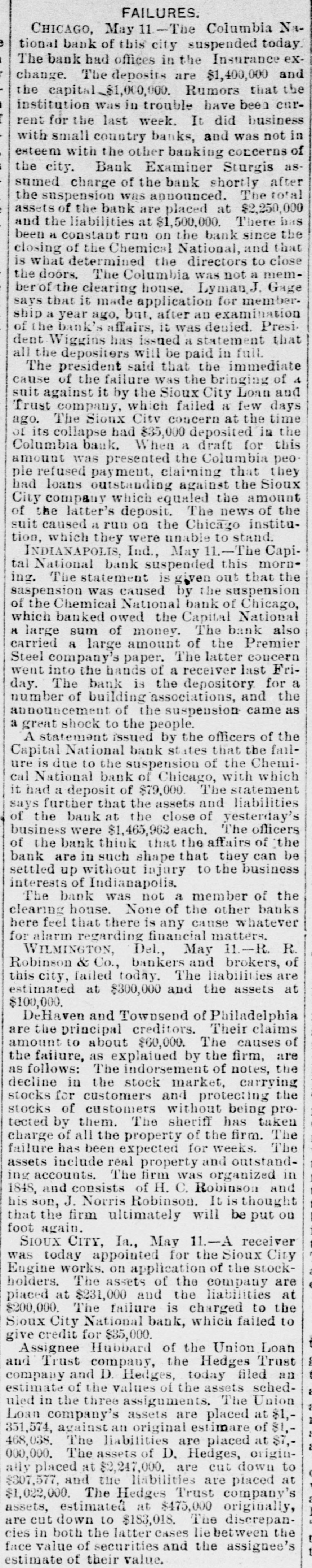 CHICAGO, May 11-Tue tional bank of this city suspended today The bank had offices in the Insurance exchange. The deposits are $1,400,000 and the capital $1,000,000. Rumors that the institution was in trouble have been current for the last week. It did business with small country banks, and was not in of esteem with the other banking concerns the city. Bank Examiner Sturgis assumed charge of the bank shortly after total the suspension was announced. The assets of the bank are placed at $2,250,000 the liabilities at $1,500,000. There run on the of the Chemical National, closing been and a constant bank since and close that the is what determined the directors to the doors. The Columbia was not a member of the clearing house. Lyman,J. Gage says that it made application for memberbut. after an examination affairs, it was ship of the a bank's year ago, statement denied. Presi- that dent Wiggins has issued a all the depositers will be paid in full. The president said that the immediate cause of the failure was the bringing of and & suit against it by the Sioux City Loan Trust company, which failed a few days The Sioux City concern at the time ago. of its collapse had $35,000 deposited in this the Columbia bank. When a draft for amount was presented the Columbia people refused payment, claiming that they had loans outstanding against the Sioux City company which equaled the amount the of the latter's deposit. The news of suit caused a run on the Chicago institution, which they were unable to stand. INDIANAPOLIS, Ind., May 11.-The Capital National bank suspended this morn- the inz. The statement is given out that saspension was caused by the suspension of the Chemical National bank of Chicago, which banked owed the Capital National large sum of money. The bank also H carried a large amount of the Premier Steel company's paper. The latter concern Friwent into the hands of a receiver last The bank is the depository for the a of building associations, of the suspension announcement day. number and came as a great shock to the people. A statement issued by the officers of fall- the Capital National bank states that the Chemiis due to the suspension of the cal ure National bank of Chicago, with which it had a deposit of $79,000. The statement liabilities further that the assets and says of the bank at the close of yesterday's business were $1,465,962 each. The officers the of the bank think that the affairs of be bank are in such shape that they can settled up without injury to the business interests of Indianapolis. The bank was not a member of the clearing house. None of the other banks here feel that there is any cause whatever for alarm regarding financial matters. WILMINGTON, Del., May 11.-R. R. Robinson & Co., bankers and brokers, of this city, failed today. The liabilities are at estimated at $300,000 and the assets $100,000. DeHaven and Townsend of Philadelphia the principal creditors. Their claims of amount are to about $60,000. The causes the failure, as explained by the firm, the are follows: The indorsement of notes, decline as in the stock market, carrying the stocks for customers and protecting stocks of customers without being taken protected by them. The sheriff has The charge of all the property of the firm. The failure has been expected for weeks. outstandinclude real property and in assets accounts. The firm was organized and ing and consists of H. C. Robinson his 1848, J. Norris Robinson. It is thought that son, the firm ultimately will be put on foot again. SIOUX CITY, Ia., May 11.-A receiver today appointed for the Sioux stock- City was works. on application of the Engine The assets of the company are at piaced holders. at $231,000 and the liabilities to the The failure is charged Sioux $200,000. City National bank, which failed to give credit for $35,000. Assignee Hubbard of the Union Trust Loan Trust company, the Hedges filed an and and D. Hedges, today schedcompany of the values of the assets Union estimate uled in the three assignments. The at $1,Loan company's assets are placed of $1,against an original estimare at $7,351,574, The liabilities are placed origin468,038. The assets of D. Hedges, down to 000,000. placed at $2,247,000. are cut at ally and the liabilities are placed $307,577, The Hedges Trust company's $1,022,000. estimated at $475,000 originally, discrepanassets, cut down to $183,018. The the are in both the latter cases lie between cies face value of securities and the assignee's estimate of their value.