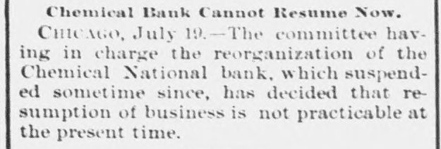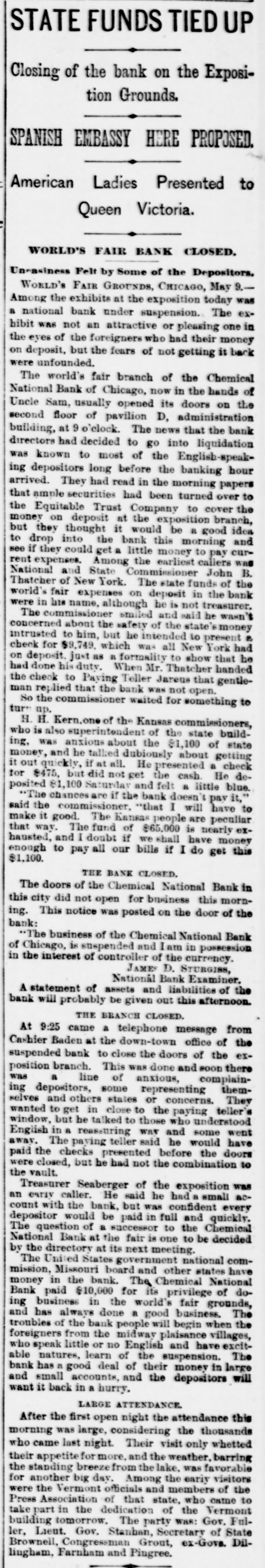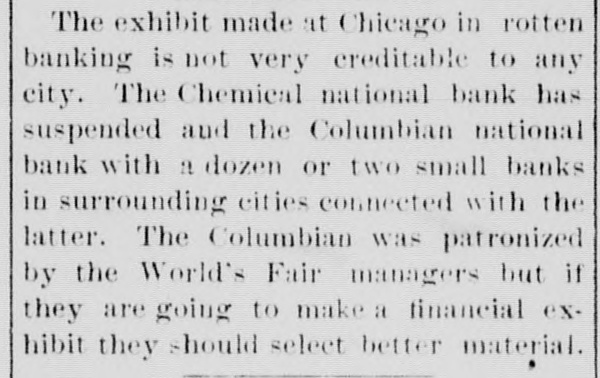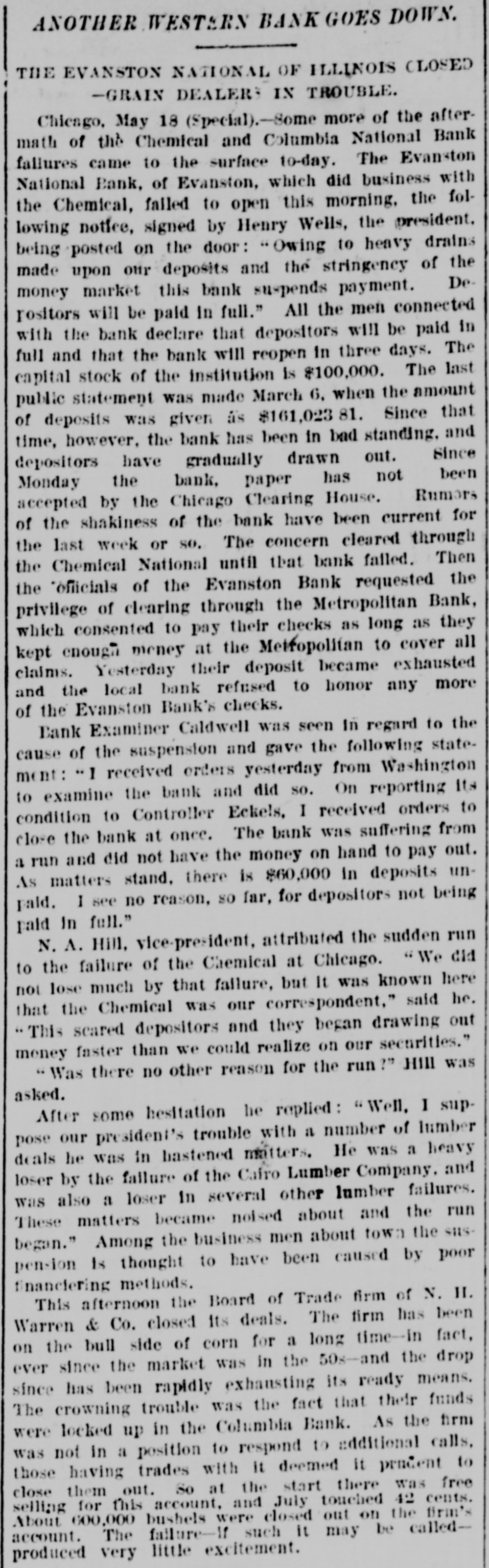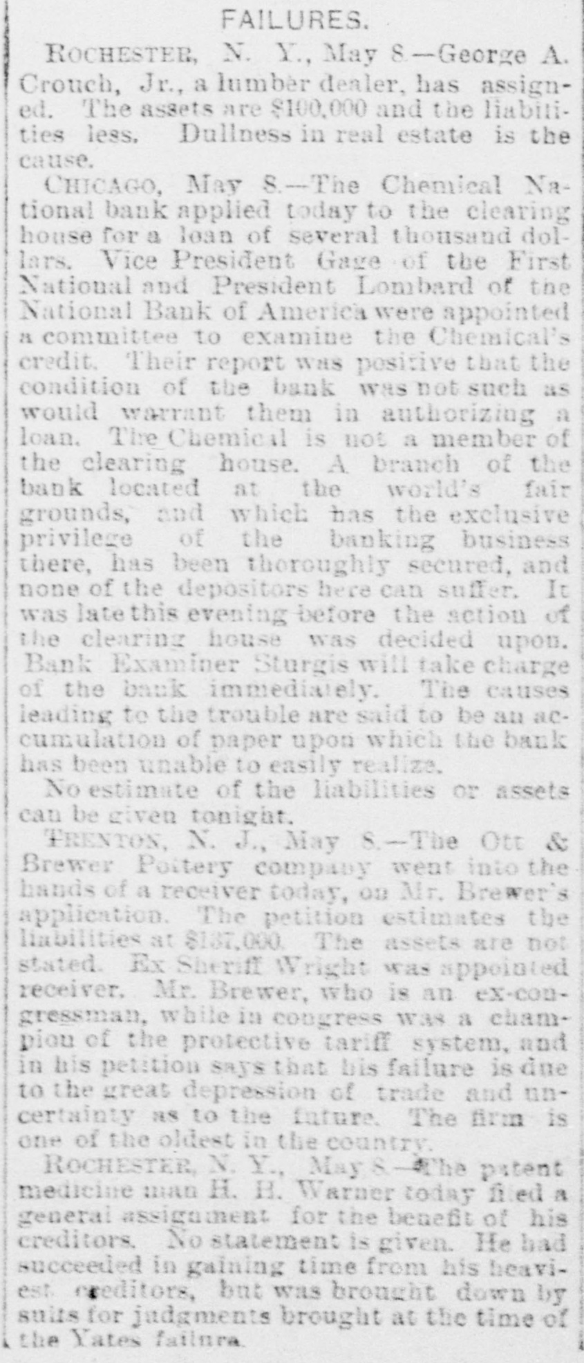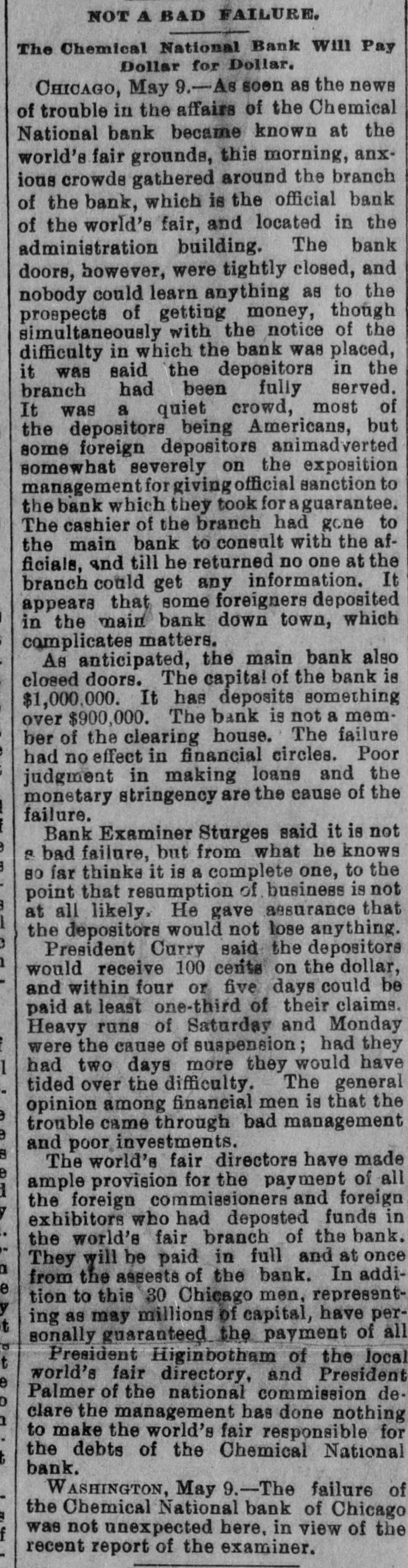 CHICAGO, May 11-Tue tional bank of this city suspended today The bank had offices in the Insurance exchange. The deposits are $1,400,000 and the capital $1,000,000. Rumors that the institution was in trouble have been current for the last week. It did business with small country banks, and was not in of esteem with the other banking concerns the city. Bank Examiner Sturgis assumed charge of the bank shortly after total the suspension was announced. The assets of the bank are placed at $2,250,000 the liabilities at $1,500,000. There run on the of the Chemical National, closing been and a constant bank since and close that the is what determined the directors to the doors. The Columbia was not a member of the clearing house. Lyman,J. Gage says that it made application for memberbut. after an examination affairs, it was ship of the a bank's year ago, statement denied. Presi- that dent Wiggins has issued a all the depositers will be paid in full. The president said that the immediate cause of the failure was the bringing of and & suit against it by the Sioux City Loan Trust company, which failed a few days The Sioux City concern at the time ago. of its collapse had $35,000 deposited in this the Columbia bank. When a draft for amount was presented the Columbia people refused payment, claiming that they had loans outstanding against the Sioux City company which equaled the amount the of the latter's deposit. The news of suit caused a run on the Chicago institution, which they were unable to stand. INDIANAPOLIS, Ind., May 11.-The Capital National bank suspended this morn- the inz. The statement is given out that saspension was caused by the suspension of the Chemical National bank of Chicago, which banked owed the Capital National large sum of money. The bank also H carried a large amount of the Premier Steel company's paper. The latter concern Friwent into the hands of a receiver last The bank is the depository for the a of building associations, of the suspension announcement day. number and came as a great shock to the people. A statement issued by the officers of fall- the Capital National bank states that the Chemiis due to the suspension of the cal ure National bank of Chicago, with which it had a deposit of $79,000. The statement liabilities further that the assets and says of the bank at the close of yesterday's business were $1,465,962 each. The officers the of the bank think that the affairs of be bank are in such shape that they can settled up without injury to the business interests of Indianapolis. The bank was not a member of the clearing house. None of the other banks here feel that there is any cause whatever for alarm regarding financial matters. WILMINGTON, Del., May 11.-R. R. Robinson & Co., bankers and brokers, of this city, failed today. The liabilities are at estimated at $300,000 and the assets $100,000. DeHaven and Townsend of Philadelphia the principal creditors. Their claims of amount are to about $60,000. The causes the failure, as explained by the firm, the are follows: The indorsement of notes, decline as in the stock market, carrying the stocks for customers and protecting stocks of customers without being taken protected by them. The sheriff has The charge of all the property of the firm. The failure has been expected for weeks. outstandinclude real property and in assets accounts. The firm was organized and ing and consists of H. C. Robinson his 1848, J. Norris Robinson. It is thought that son, the firm ultimately will be put on foot again. SIOUX CITY, Ia., May 11.-A receiver today appointed for the Sioux stock- City was works. on application of the Engine The assets of the company are at piaced holders. at $231,000 and the liabilities to the The failure is charged Sioux $200,000. City National bank, which failed to give credit for $35,000. Assignee Hubbard of the Union Trust Loan Trust company, the Hedges filed an and and D. Hedges, today schedcompany of the values of the assets Union estimate uled in the three assignments. The at $1,Loan company's assets are placed of $1,against an original estimare at $7,351,574, The liabilities are placed origin468,038. The assets of D. Hedges, down to 000,000. placed at $2,247,000. are cut at ally and the liabilities are placed $307,577, The Hedges Trust company's $1,022,000. estimated at $475,000 originally, discrepanassets, cut down to $183,018. The the are in both the latter cases lie between cies face value of securities and the assignee's estimate of their value.