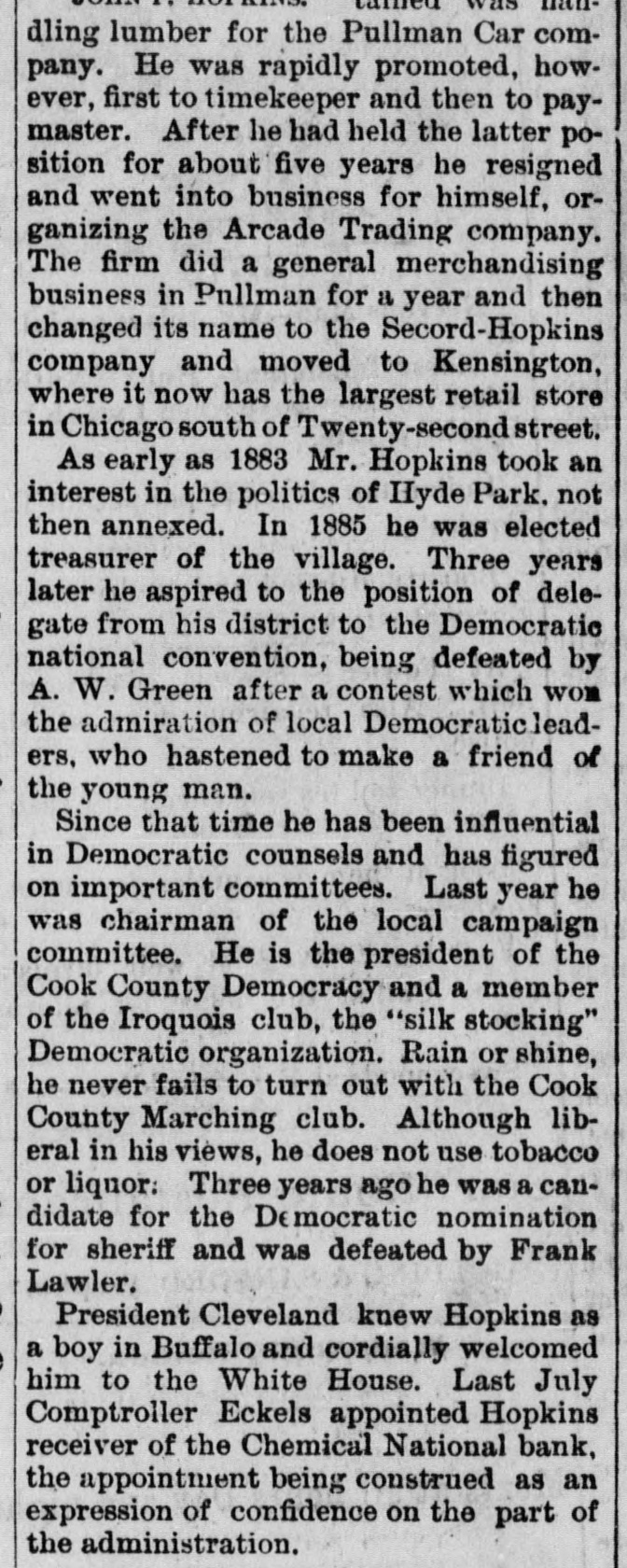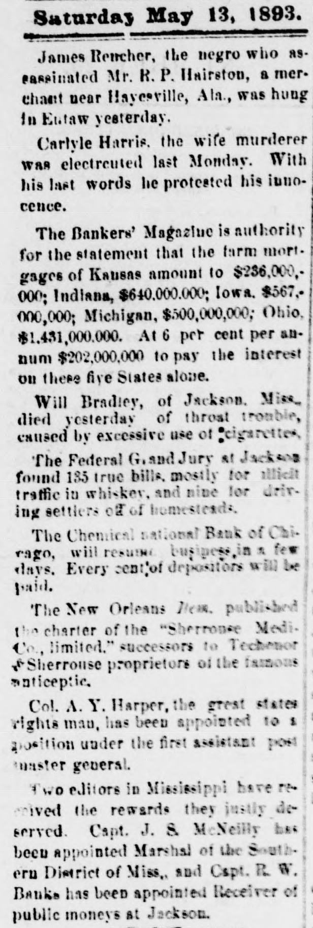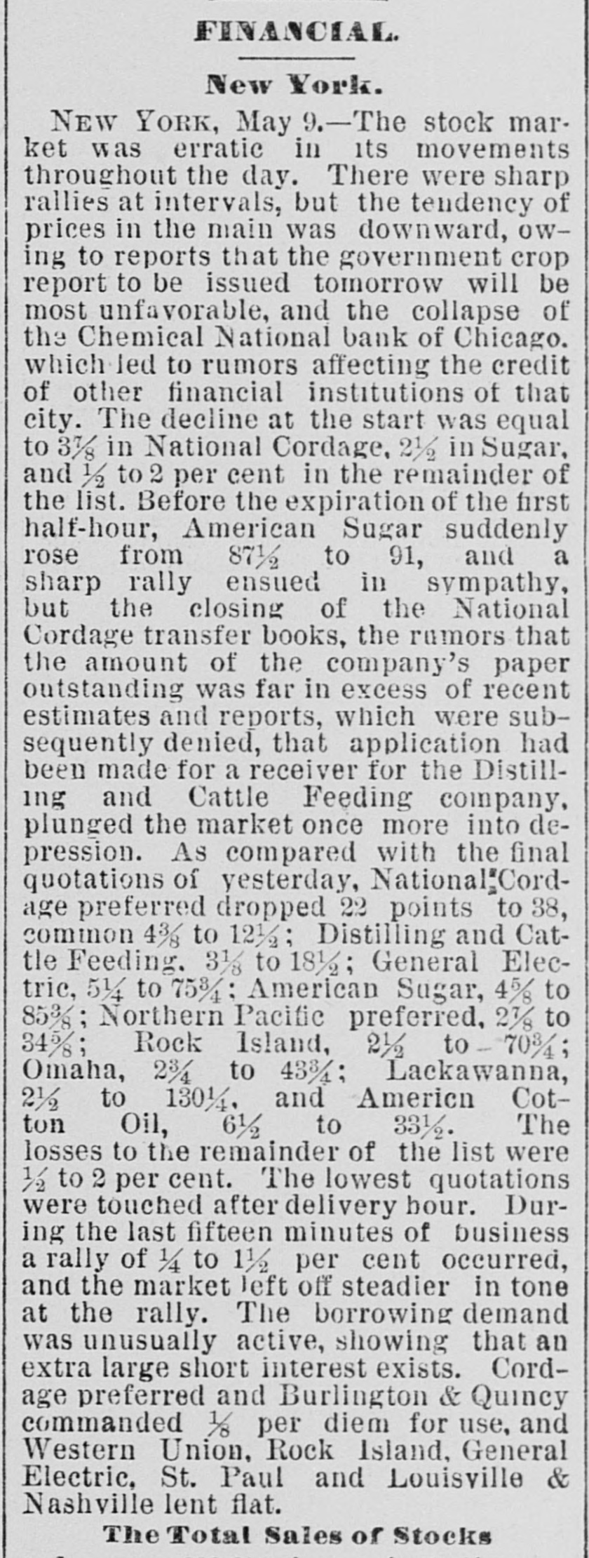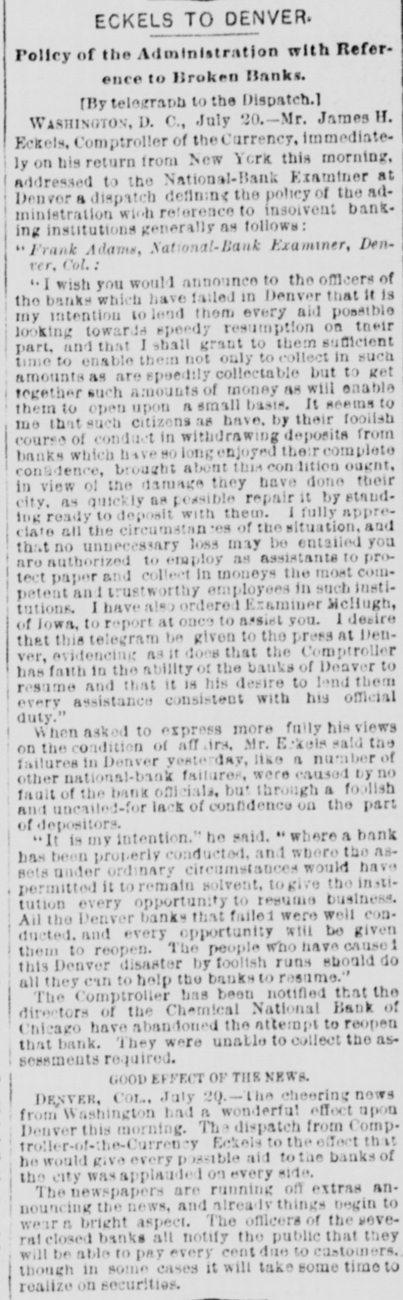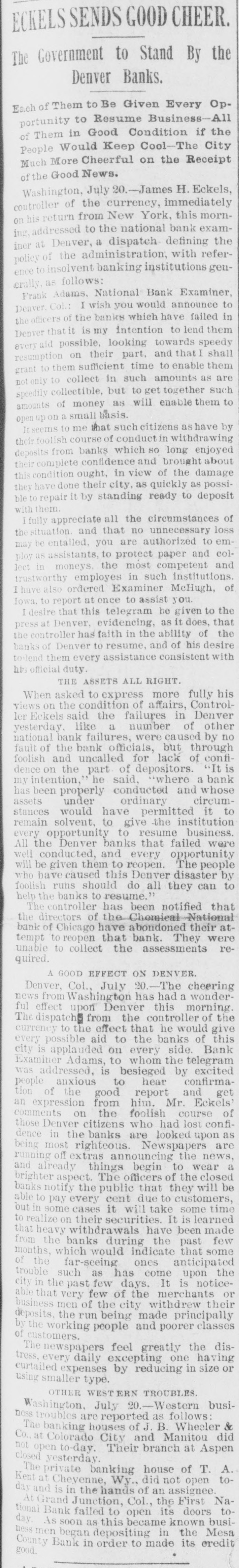 CHICAGO, May 11-Tue tional bank of this city suspended today The bank had offices in the Insurance exchange. The deposits are $1,400,000 and the capital $1,000,000. Rumors that the institution was in trouble have been current for the last week. It did business with small country banks, and was not in of esteem with the other banking concerns the city. Bank Examiner Sturgis assumed charge of the bank shortly after total the suspension was announced. The assets of the bank are placed at $2,250,000 the liabilities at $1,500,000. There run on the of the Chemical National, closing been and a constant bank since and close that the is what determined the directors to the doors. The Columbia was not a member of the clearing house. Lyman,J. Gage says that it made application for memberbut. after an examination affairs, it was ship of the a bank's year ago, statement denied. Presi- that dent Wiggins has issued a all the depositers will be paid in full. The president said that the immediate cause of the failure was the bringing of and & suit against it by the Sioux City Loan Trust company, which failed a few days The Sioux City concern at the time ago. of its collapse had $35,000 deposited in this the Columbia bank. When a draft for amount was presented the Columbia people refused payment, claiming that they had loans outstanding against the Sioux City company which equaled the amount the of the latter's deposit. The news of suit caused a run on the Chicago institution, which they were unable to stand. INDIANAPOLIS, Ind., May 11.-The Capital National bank suspended this morn- the inz. The statement is given out that saspension was caused by the suspension of the Chemical National bank of Chicago, which banked owed the Capital National large sum of money. The bank also H carried a large amount of the Premier Steel company's paper. The latter concern Friwent into the hands of a receiver last The bank is the depository for the a of building associations, of the suspension announcement day. number and came as a great shock to the people. A statement issued by the officers of fall- the Capital National bank states that the Chemiis due to the suspension of the cal ure National bank of Chicago, with which it had a deposit of $79,000. The statement liabilities further that the assets and says of the bank at the close of yesterday's business were $1,465,962 each. The officers the of the bank think that the affairs of be bank are in such shape that they can settled up without injury to the business interests of Indianapolis. The bank was not a member of the clearing house. None of the other banks here feel that there is any cause whatever for alarm regarding financial matters. WILMINGTON, Del., May 11.-R. R. Robinson & Co., bankers and brokers, of this city, failed today. The liabilities are at estimated at $300,000 and the assets $100,000. DeHaven and Townsend of Philadelphia the principal creditors. Their claims of amount are to about $60,000. The causes the failure, as explained by the firm, the are follows: The indorsement of notes, decline as in the stock market, carrying the stocks for customers and protecting stocks of customers without being taken protected by them. The sheriff has The charge of all the property of the firm. The failure has been expected for weeks. outstandinclude real property and in assets accounts. The firm was organized and ing and consists of H. C. Robinson his 1848, J. Norris Robinson. It is thought that son, the firm ultimately will be put on foot again. SIOUX CITY, Ia., May 11.-A receiver today appointed for the Sioux stock- City was works. on application of the Engine The assets of the company are at piaced holders. at $231,000 and the liabilities to the The failure is charged Sioux $200,000. City National bank, which failed to give credit for $35,000. Assignee Hubbard of the Union Trust Loan Trust company, the Hedges filed an and and D. Hedges, today schedcompany of the values of the assets Union estimate uled in the three assignments. The at $1,Loan company's assets are placed of $1,against an original estimare at $7,351,574, The liabilities are placed origin468,038. The assets of D. Hedges, down to 000,000. placed at $2,247,000. are cut at ally and the liabilities are placed $307,577, The Hedges Trust company's $1,022,000. estimated at $475,000 originally, discrepanassets, cut down to $183,018. The the are in both the latter cases lie between cies face value of securities and the assignee's estimate of their value.