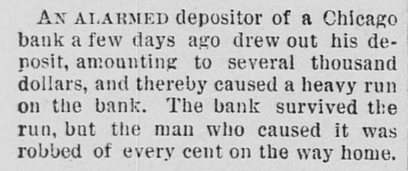 AN ALARMED An alarmed depositor of a Chicago bank a few days ago drew out his deposit, amounting to several thousand dollars, and thereby caused a heavy run on the bank. The bank survived the run, but the man who caused it was robbed of every cent on the way home.