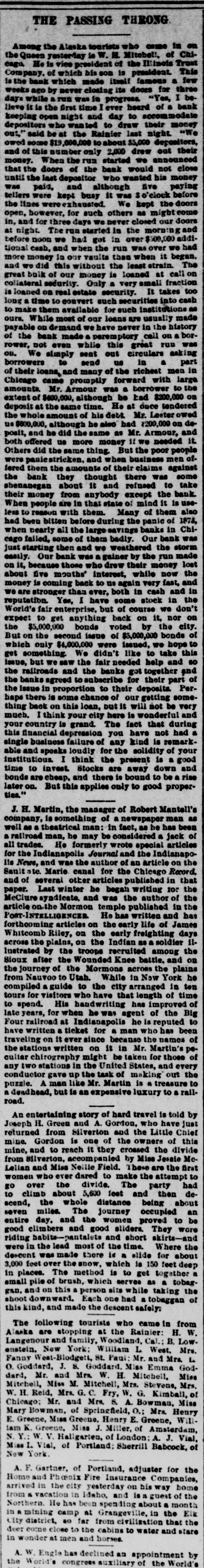 THE PASSING THRONG Among the Alaska tourists who cause the Queen esterday is w. He is viee of the Illinois Company. of which his is famous bank by never closing its doors for "Yes, in lieve the Grot heard of to day keeping depositors to draw their money ou:, said the Rainier last night "We 000,000 83,000 depositors, and of this number only 2,000 drew out their money. When the run started that the doors of the bank would not close until the last who wanted his money paying five and although paid, before tellers kept busy the the We lines kept open, however, for such others might our closed in. for three and night. in the morning and before noon had $500,000 tional cash, and when the began. when it than vaults more our money and did the strain. balk of our money loaned at call security Only very small fraction is loaned on real estate security. It takes too long time to convert such securities into cash to make them available for such institutions ours. While most of our loans are usually made payable on demand have never in the history of the call bank rower, not even while this great run on. We simply sent out circulars asking us send borrowers part to in of their loans, and many of the richest men in Chicago came promptly forward with large amounts Mr. Armour borrower extent of $400,000. although be tad $200,000 deposit the same time. He at once tendered the whole amount of his debt Mr. Lester $600,000, although he also had $200,000 de posit, and he did the same as Mr. Armour, and both offered us more money needed it Others did the same thing But the poor people werepaniestricken and when business men of fered them the amounts of their claims against the bank they thought there was some shenanegan about it and refused to take their money from anybody except the bank When people are in that state of mind it is less to reason with them. Many of them also had been bitten before during the panic of 1873, hen nearly all the banks in Chicago failed, some of them badly. Our bank just starting then and we the storm easily. Our bank gainer by the run made on because those who drew their money lost about five months' interest, while now the money is coming back to us again very fast, and stronger than ever, both in cash and in reputation. Yes, I have some stock in the World's fair aterprise, but of course we don't expect to get anything back on it, nor on the $5,000,000 bonds voted by the city. But the second issue of $5,000,000 bonds of which only $4,000,000 were issued. we hope get something We didn't like to take this issue, but the fair needed help and so the railroads and the banks got together and the banks agreed to subscribe for their part of the Issue in proportion to their deposits. Perhaps there is some chance of our getting some thing back on this loan, but it will not be very mucb. think your city here is wonderful and your country is grand. The fact that during a this financial depression you have not had single business failure of any kind is remark. able and speaks loudly for the solidity of your institutious think the present is good time to invest Stocks are away down and bonds cheap. and there is bound to be rise later on. But this applies only to good properties.' H. Martin, the manager of Robert Mantell's company is something of newspaper man as well theatrical man: in fact. as he has been railroad man. he may be considered a jack of all trades. He formerly wrote special article for the Indianapolis Journal and the Indianapo lis News, and was the author of an article the Sault Marie canal for the Chicago Record and of several other articles published in that paper. Last winter be began writing for the McClure syndicate, and was the author of article on-the Mormon temple published in the has POST-INTELLIGENCEE He written and forthcoming articles on the early life of James Whitcomb Riley, on the early freighting days across the plains, on the Indian soldier il lustrated by the troops recruited among the Sioux after the Wounded Knee battle. and on the journey of the Mormons across the plains from Nauvoo to Utah. While in New York he compiled guide to the city arranged in ten tours for visitors who have that length of time to spend. His handwriting has improved of late years, for when he was agent of the Big Four railroad at Indianapolis he reputed to have written a ticket for man who has been traveling on it ever since because the names of the stations written on it in Mr. Martin's cultar might be taken for those of any two stations in the United States. and every conductor gave the task of making out the puzzle. like Mr. Martin is treasure to deadhead, but expensive luxury to a rail road. An entertaining story of hard travel is told by Joseph H. Green and A. Gordon. who have just returned from Silverton and the Little Chief mine. Gordon is one of the owners of this mine, and to reach it they crossed the divide from accompanied by Miss Jesale McLellan and Miss Neille Field. hese are the first women who ever dared to make the attempt go over the divide. The party had to climb about 5,600 feet and then descend, the whole distance being about seven milea. The journey occupied an entire day. and the women proved to be good climbers and good sliders. They wore habits short and skirts. and riding were in the lead most of the time. Where the descent was made there slide for about 3,000 feet over the snow. which is 150 feet deep in places. The method is to get together small pile of brush, which serves as a tobag this person while taking the shoot downward. Each had a tobaggan of skind, and made the descent safely: The following tourists who came in from Alaska are stopping at the Rainier Langenour and family, Foodland, Cal B. Low enstein. New York: Illiam L West. Mrs Fanay West-Blodgett, St. Paul Mr and Mrs. o. Goddard, J. Goddard, Miss Emma Goddard. Mr and Mrs. W H. Mitchell. Miss Mitchell, Miss M Mitchell. Mrs. Stevens, Mrs. w H. Reid, Mrs. G. Fry. W. G. Kimball, Chicago: Mr. and Mrs