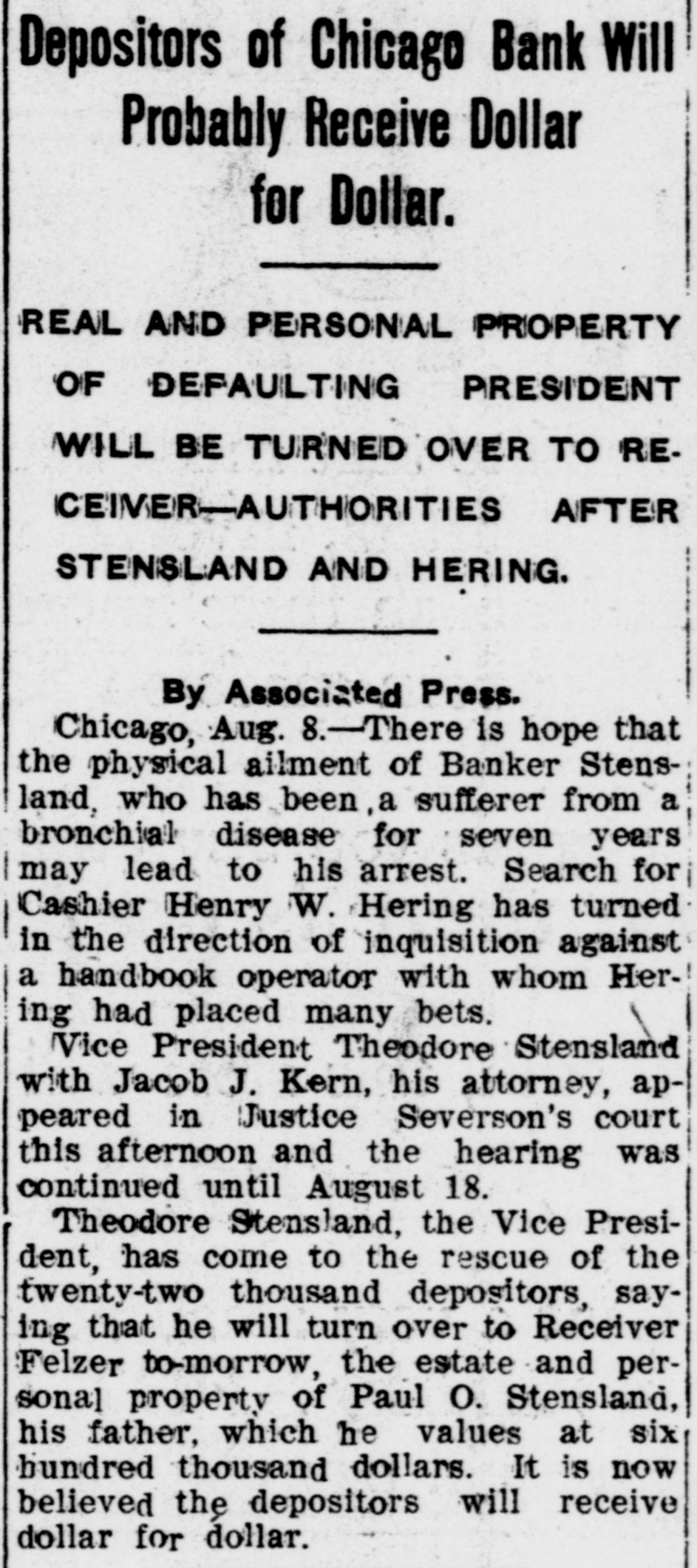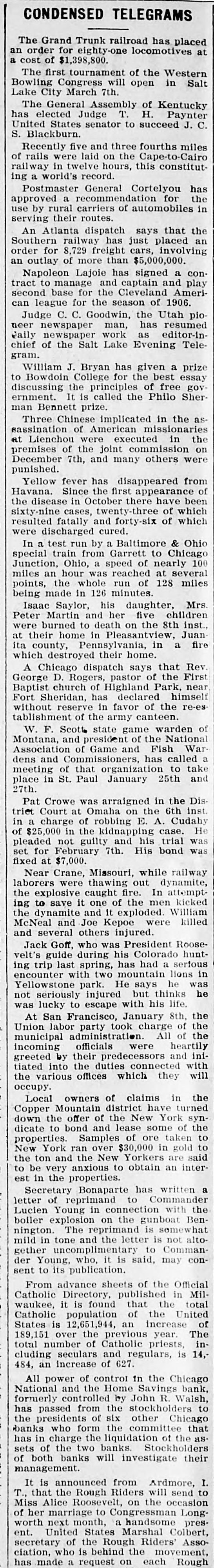 CONDENSED TELEGRAMS an Grand Trunk railroad has placed at The order for eighty-one locomotives a cost of $1,398,800. first tournament of the Western Salt Bowling The Congress will open in Lake City March 7th. The General Assembly of Kentucky Paynter elected Judge T. H. J. has United States senator to succeed C. S. Blackburn. five and three fourths miles Recently were laid on the Cape-to-Cairo constitutrailway of rails in twelve hours, this ing a world's record. Postmaster General Cortelyou has the a recommendation for in approved use by rural carriers of automobiles serving their routes. An Atlanta dispatch says placed that the an railway has just involving Southern for 8.729 freight cars, an order outlay of more than $5,000,000. Napoleon Lajoie has signed and a play conto manage and captain Ameritract base for the Cleveland second can league for the season of 1906. Judge C. C. Goodwin, the Utah resumed pionewspaper man, has editor-inneer newspaper work as Telechief daily of the Salt Lake Evening gram. William J. Bryan has given a prize Bowdoin College for the best essay to the principles of free Sher- govdiscussing ernment. It is called the Philo man Bennett prize. Chinese implicated in the asThree of American missionaries the eassination Lienchou were executed in at of the joint commission were on premises December 7th, and many others punished. Yellow fever has disappeared from of Since the first appearance been Havana. in October there have the disease cases, twenty-three of of which which sixty-nine resulted fatally and forty-six were discharged cured. test run by a Baltimore Chicago & Ohio In a train from Garrett to 100 special Ohio, a speed of nearly several Junction, hour was reached at miles miles points, an the whole run of 128 being made in 126 minutes. Isaac Saylor, his daughter, children Mrs. Martin and her five inst., Peter burned to death on the 8th Juan were their home in Pleasantview, a fire ita at county, Pennsylvania, in which destroyed their home. Chicago dispatch says that the First Rev. A D. Rogers, pastor of Park, near Baptist George church of Highland declared himself Fort Sheridan, reserve has in favor of the re-establishment without of the army canteen. F. Scott state game warden National of Montana, W. and president of the Fish War Association of Game and and Commissioners, has called take a dens of that organization to and place meeting in St. Paul January 25th 27th. Crowe was arraigned in the inst. DisPat Court at Omaha on the 6th Cudahy triet charge of robbing E. A. He in $25,000 a in the kidnapping case. was of not guilty and his trial set pleaded for February 7th. His bond was fixed at $7,000. Near Crane, Missouri, while dynamite, railway laborers were thawing out attemptthe explosive caught fire. In kicked save it one of the men William the ing dynamite to and it exploded. were killed McNeal and Joe Kepoe and several others injured. Goff, who was President Roose- huntvelt's Jack guide during his Colorado serious last spring, has had a lions in ing trip with two mountain was encounter Yellowstone park. He says thinks he he seriously injured but life. was not lucky to escape with his San Francisco, January 8th, of the the Union At labor party took charge All of the municipal administration. officials were heartily and incoming by their predecessors with inigreeted into the duties connected will tiated the various offices which they occupy. owners of claims in turned the Local Mountain district have synCopper the offer of the New York down to bond and lease some taken of the to dicate Samples of ore gold to properties. York ran over $30,000 in said New and the New Yorkers are to the be ton very anxious to obtain an interest in the properties. Secretary Bonaparte has Commander written a of reprimand to with the letter Young in connection BenLucien explosion on the gunboat boiler The reprimand is somewhat altonington. tone and the letter is Comman- not mild in uncomplimentary to congether der Young, who, it is said, may sent to its publication. advance sheets of the Official Catholic From Directory, published the in total Milit is found that United waukee, population of the of Catholic is 12,651,944, an increase The States over the previous year. 189,151 number of Catholic priests, intotal cluding seculars and regulars, is 14, 484, an increase of 627. All power of control in the Chicago bank, and the Home Savings National formerly controlled by John R. Walsh, to has passed from the stockholders Chicago presidents of six other that the who form the committee banks in charge the liquidation of the as has of the two banks. Stockholders of sets both banks will investigate their management. is announced from Ardmore, I. It the Rough Riders will send to T., that Alice Roosevelt, on the occasion Long. of Miss her marriage to Congressman presnext month, a handsome worth States Marshal Colbert, of the Rough Assowho is behind the movement, secretary ciation, ent. United Riders' has made a request on each Rough