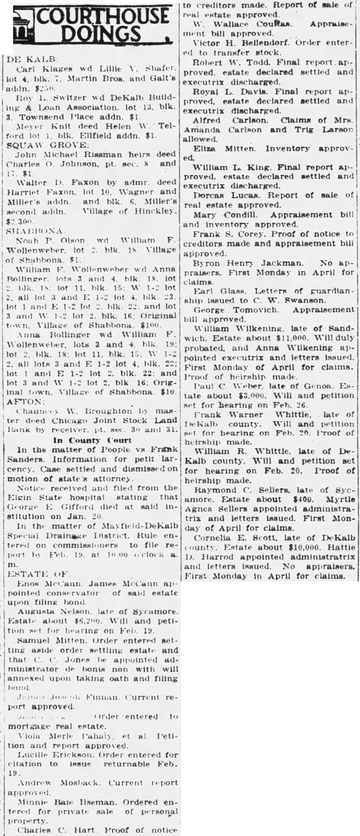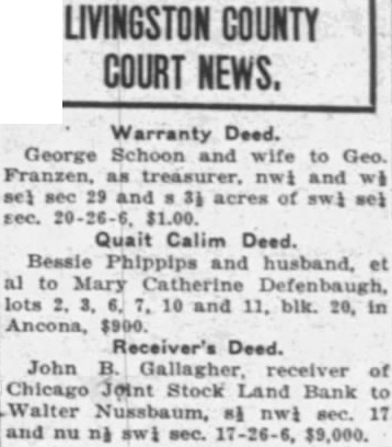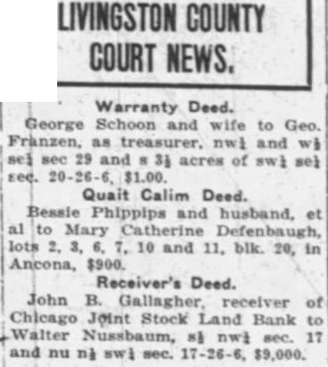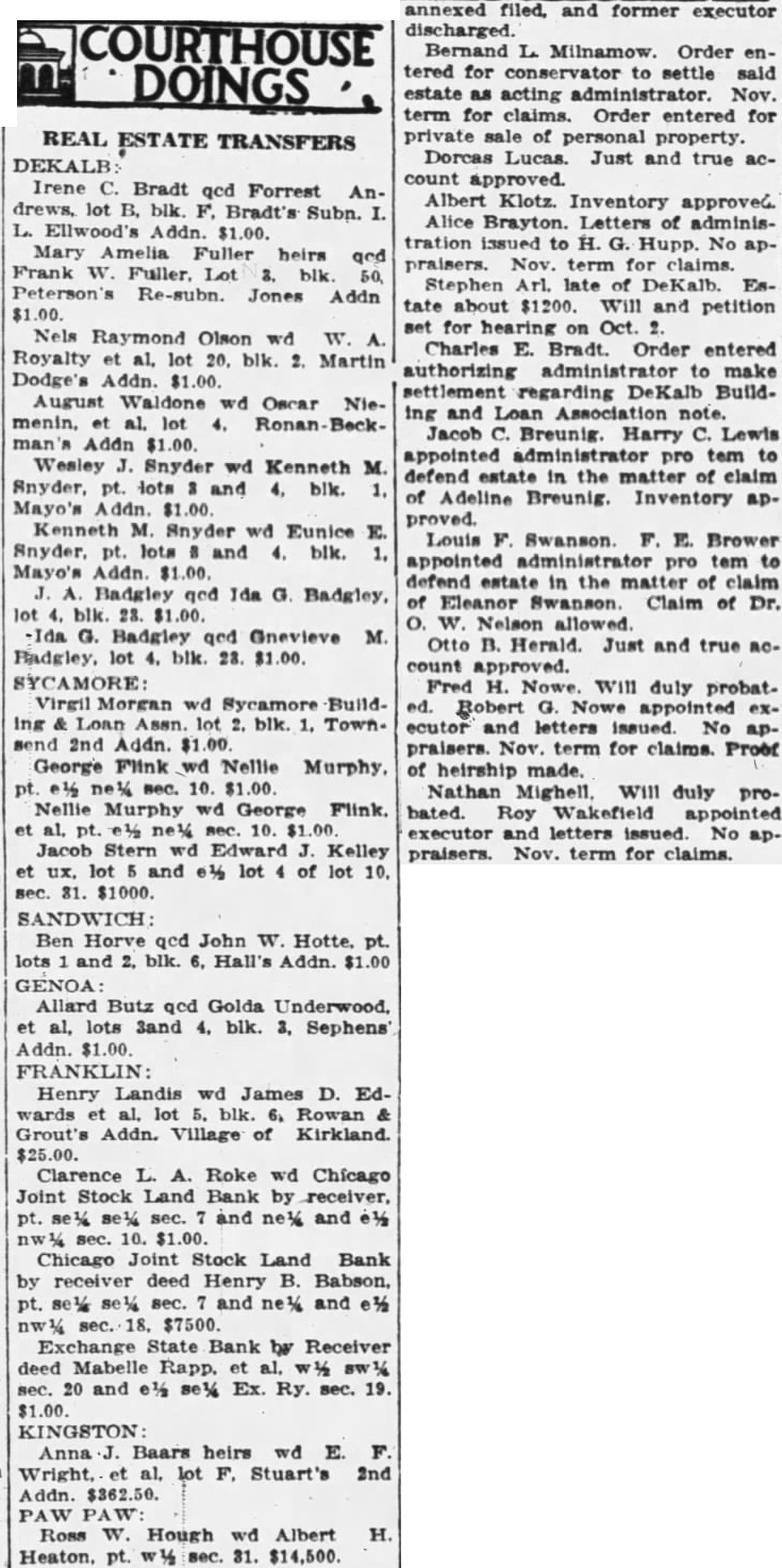 Blanche Hollenbeak wd Ralph H. Browne, lot 1, blk 4, Plat A, $10. Exchange State Bank et al by Receiver deed Dr. B. W. Jones, uot sec 19, 30 and 31, Genoa Twp., and $1. pt sec 24 and 25, Kingston Twp.,