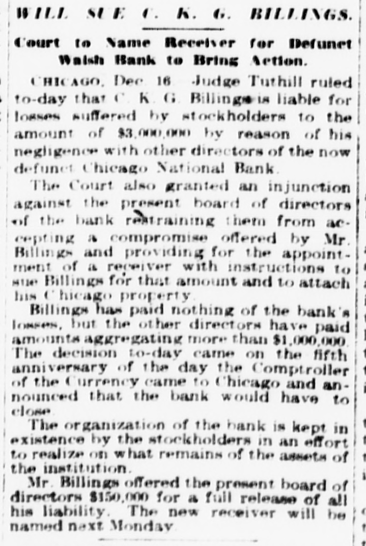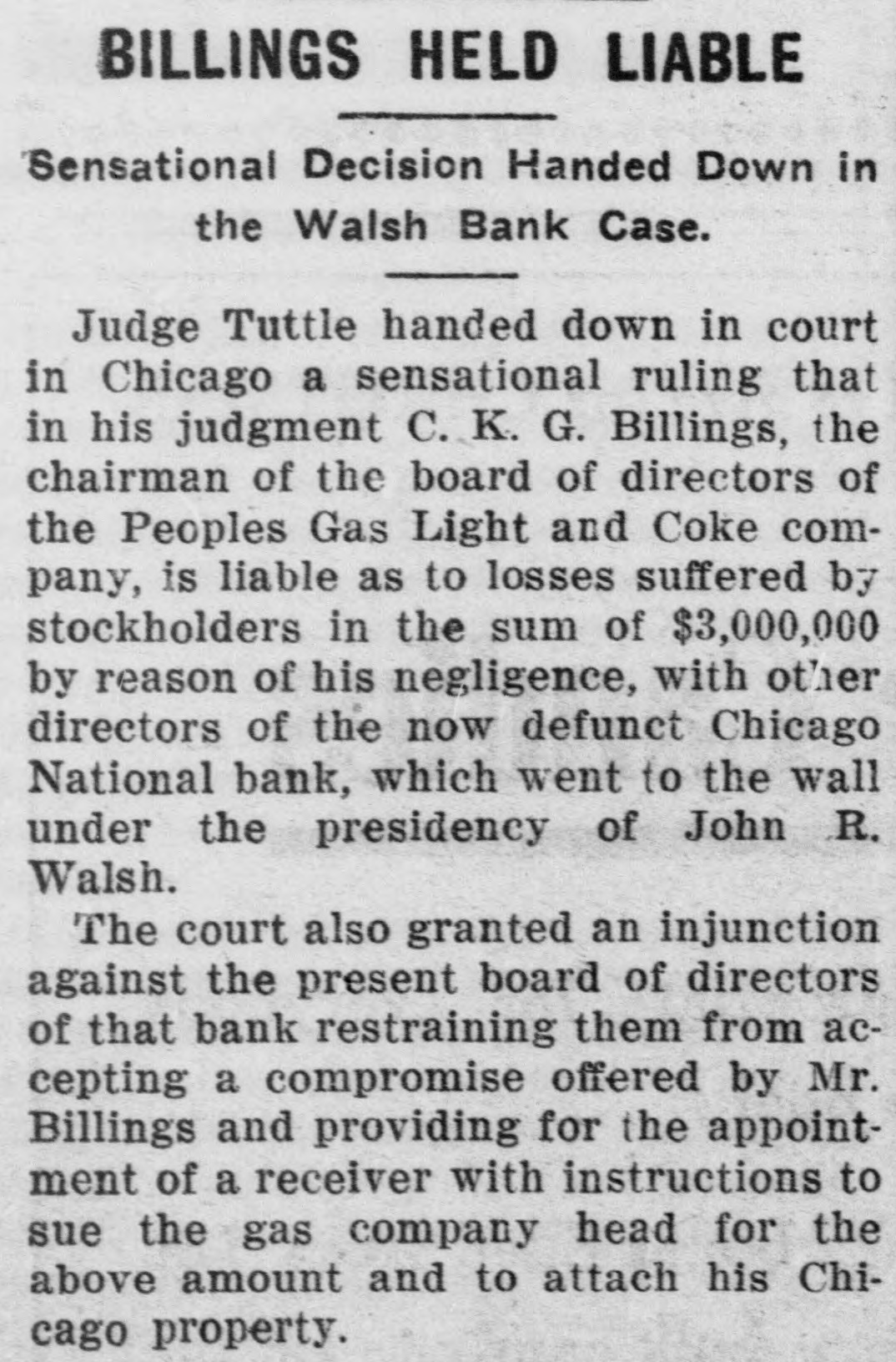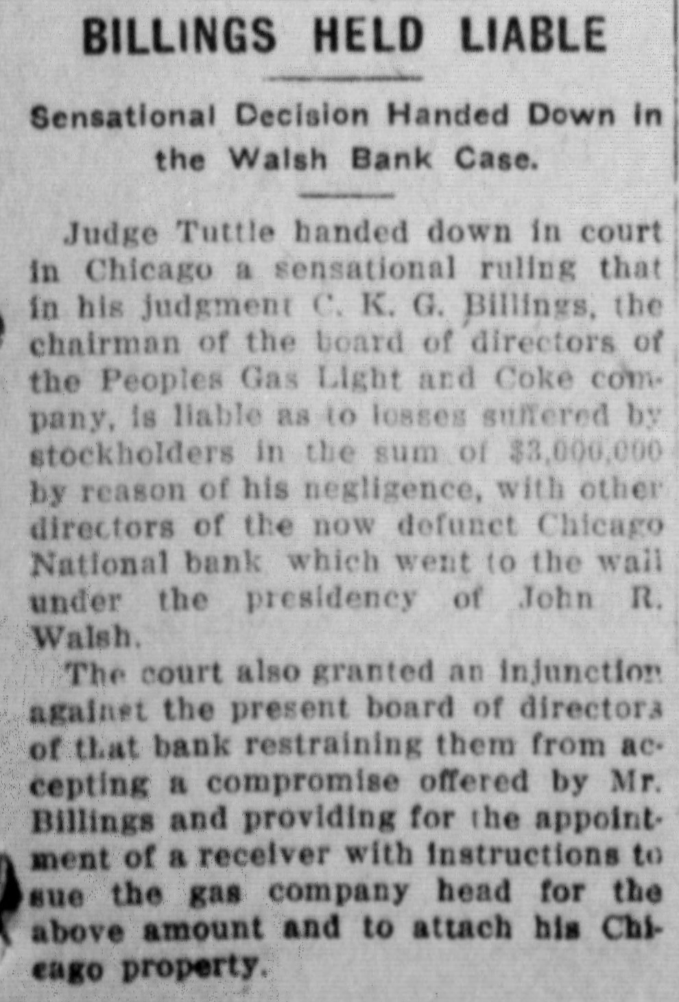 BILLINGS HELD LIABLE Sensational Decision Handed Down in the Walsh Bank Case. Judge Tuttle handed down in court in Chicago a sensational ruling that in his judgment C.K. G. Billings, the chairman of the board of directors of the Peoples Gas Light and Coke company, is liable as to losses suffered by stockholders in the sum of $3,000,000 by reason of his negligence, with other directors of the now defunct Chicago National bank, which went to the wall under the presidency of John R. Walsh. The court also granted an injunction against the present board of directors of that bank restraining them from accepting a compromise offered by Mr. Billings and providing for the appointment of a receiver with instructions to sue the gas company head for the above amount and to attach his Chicago property.
