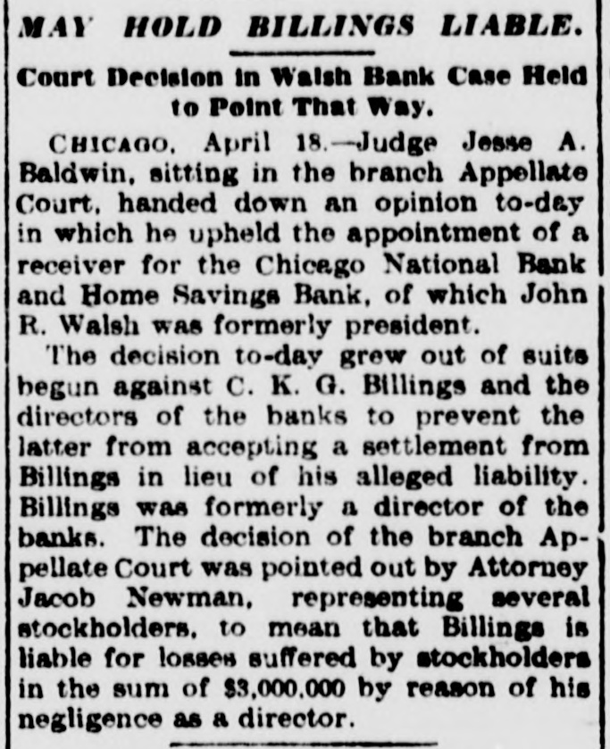 MAY HOLD BILLINGS LIABLE. Court Decision in Walsh Bank Case Held to Point That Way. CHICAGO. April 18. -Judge Jesse A. Baldwin, sitting in the branch Appellate Court, handed down an opinion to-day in which he upheld the appointment of a receiver for the Chicago National Bank and Home Savings Bank, of which John R. Walsh was formerly president. The decision to-day grew out of suits begun against C. K. G. Billings and the directors of the banks to prevent the latter from accepting a settlement from Billings in lieu of his alleged liability. Billings was formerly a director of the banks. The decision of the branch Appellate Court was pointed out by Attorney Jacob Newman, representing several stockholders. to mean that Billings is liable for losses suffered by stockholders in the sum of $3,000,000 by reason of his negligence as a director.