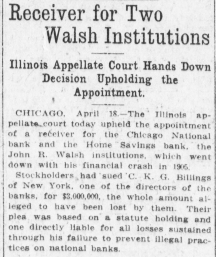 Receiver for Two Walsh Institutions Illinois Appellate Court Hands Down Decision Upholding the Appointment. CHICAGO. April 18.-The Illinois appellate court today upheld the appointment of a receiver for the Chicago National bank and the Home Savings bank, the John R. Walsh institutions, which went down with his financial crash in 1905. Stockholders had sued C. K. G. Billings of New York, one of the directors of the banks, for $3,000,000, the whole amount alleged to have been lost by them. Their plea was based on a statute holding and one directly liable for all losses sustained through his failure to prevent illegal practices on national banks.