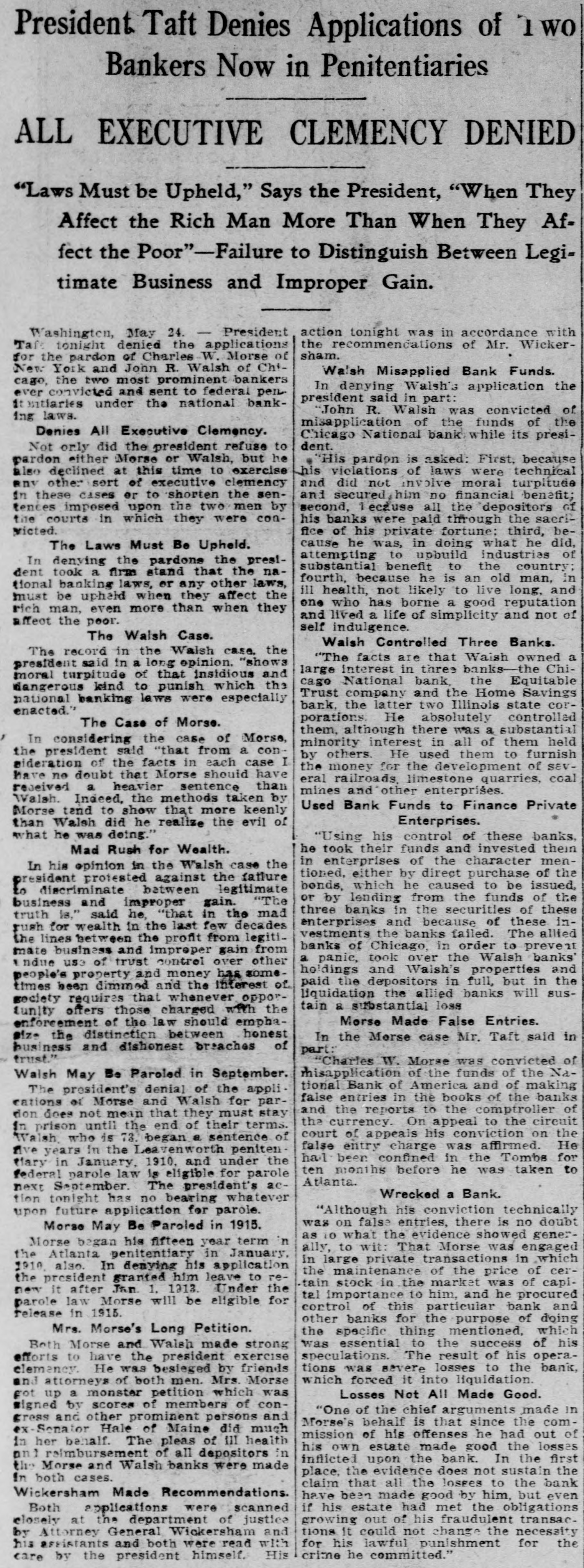 President Taft Denies Applications of 1 WO Bankers Now in Penitentiaries ALL EXECUTIVE CLEMENCY DENIED "Laws Must be Upheld," Says the President, "When They Affect the Rich Man More Than When They Affect the Poor" -Failure to Distinguish Between Legitimate Business and Improper Gain. Washington, May 24. - President action tonight was in accordance with the recommencations of Mr. WickerTaf: tonight denied the applications sham. for the pardon of Charles W. Morse of New York and John R. Walsh of ChiWalsh Misapplied Bank Funds. cago, the two most prominent bankers In denying Walsh's application the ever convicted and sent to federal pen president said in part: Itentiaries under the national bankJohn R. Walsh was convicted of ing laws. misapplication of the funds of the Denies All Executive Clemency. Chicago National bank while its president. Not only did the president refuse to pardon either Morse or Walsh, but he 'His pardon is asked: First, because his violations of laws were technical also declined at this time to exercise any other sort of executive elemency and did not involve moral turpitude in these cases or to shorten the senand secured,him no financial benefit; tences imposed upon the two men by second, eccuse all the depositors of the courts in which they were conhis banks were paid through the sacrivicted. fice of his private fortune: third, because he was, in doing what he did. The Laws Must Be Upheld. attempting to upbuild industrias of In denying the pardons the prestsubstantial benefit to the country: dent took a firm stand that the nafourth, because he is an old man, in tional banking laws, or any other laws, ill health, not likely to live long. and must be upheld when they affect the one who has borne a good reputation rich man, even more than when they and lived a life of simplicity and not of affect the poor. self indulgence. The Walsh Case. Walsh Controlled Three Banks. The record in the Walsh case. the "The facts are that Waish owned a president said in a long opinion. "shows large interest in three banks the Chimoral turpitude of that insidious and cago National bank the Equitable dangerous kind to punish which the Trust company and the Home Savings national banking laws were especially bank. the latter two Illinois state corenacted." porations He absolutely controlled The Case of Morse. them, although there was a substantial In considering the case of Morse, minority interest in all of them held the president said "that from a con by others. He used them to furnish gideration of the facts in each case I the money for the development of SEVhave no doubt that Morse should have eral railroads, limestone quarries, coal received a heavier sentence than mines and other enterprises. Walsh. Indeed, the methods taken by Used Bank Funds to Finance Private Morse tend to show that more keenly Enterprises. than Walsh did he realize the evil of what he was doing.' "Using his control of these banks. he took their funds and invested their Mad Rush for Wealth. in enterprises of the character menIn his opinion in the Walsh case the tioned, either by direct purchase of the president protested against the fatture bonds, which he caused to be issued, to discriminate between legitimate or by lending from the funds of the business and improper gain. "The three banks in the securities of these truth is. said he, "that in the mad enterprises and because of these inrush for wealth in the last few decades vestments the banks failed. The allied the lines between the profit from legitibanks of Chicago, in order to prevent mate business and impreper gain from a panic, took over the Walsh banks ndue use of trust control over other holdings and Walsh's properties and people's property and money has some. paid the depositors in full, but in the times been dimmed and the Interest of liquidation the allied banks will sussociety requires that whenever opportain a substantial loss tunity offers those charged with the Morse Made False Entries. enforcement of the law should emphasize the distinction between honest In the Morse case Mr. Taft said in business and dishonest breaches of part trust." 'Charles W. Morse was convicted of misapplication of the funds of the NaWalsh May Be Paroled in September. tional Bank of America and of making The president's denial of the appli false entries in the books of the banks cations of Morse and Walsh for parand the reports to the comptroller of don does not mean that they must stay the currency. On appeal to the circuit in prison until the end of their terms. court of appeals his conviction on the Walsh who is 73. began a sentence of false entry charge was affirmed. He five years in the Leavenworth peniten ha-1 beer confined in the Tombs for Mary in January, 1910. and under the ten months before he was taken to federal parole law is eligible for parole Atlanta. next September The president's acWrecked a Bank. tion tonight has no bearing whatever "Although his conviction technically upon future application for parole. was on false entries, there is no doubt Morse May Be Paroled in 1915. as TO what the evidence showed generMorse began his fifteen year term n ally, to wit: That Morse was engaged the Atlanta penitentiary in January, In large private transactions in which 1910 also. In denying his application the maintenance of the price of ceithe president granted him leave to retain stock in the market was of capinew it after Jan 1. 1913. Under the tel importance to him, and he procured parole law Morse will be eligible for control of this particular bank and release in 1915. other banks for the purpose of doing Mrs. Morse's Long Petition. the specific thing mentioned, which was essential to the success of his Both Morse and Walsh made strong speculations. The result of his operaefforts to have the president exercise tions was severe losses to the bank elemency. He was besieged by friends which forced it into liquidation. and attorneys of both men. Mrs. Morse got up a mon