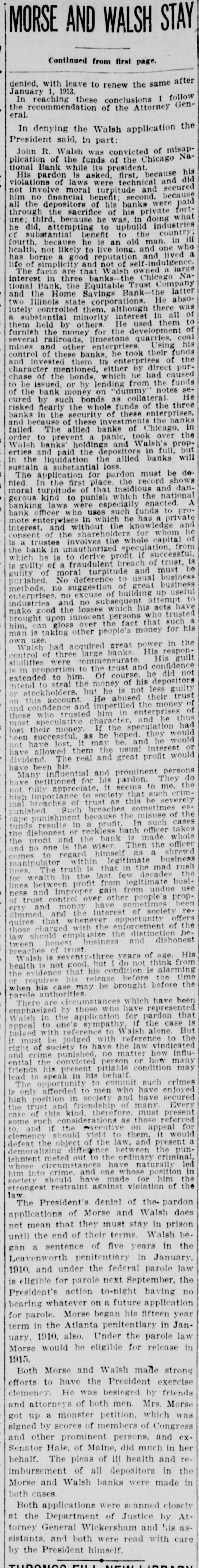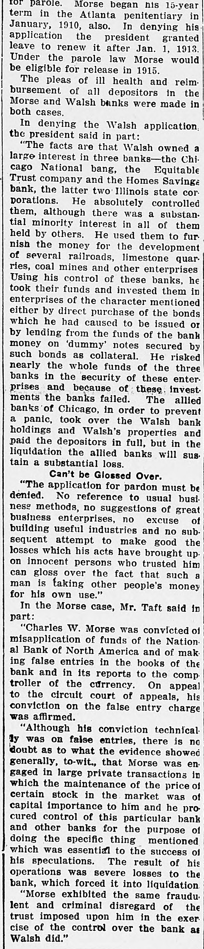 for parole. Morse began his 15-year term in the Atlanta penitentiary in January, 1910, also. In denying his application the president granted leave to renew it after Jan. 1, 1913. Under the parole law Morse would be eligible for release in 1915. The pleas of ill health and reim- bursement of all depositors in the Morse and Walsh banks were made in both cases. In denying the Walsh application the president said in part: "The facts are that Walsh owned a large interest in three banks-the Chi- cago National bang, the Equitable Trust company and the Homes Savinge bank, the latter two Illinois state cor- porations. He absolutely controlled them, although there was a substan- tial minority interest in all of them held by others. He used them to fur- nish the money for the development of several railroads, limestone quar- ries, coal mines and other enterprises Using his control of these banks, he took their funds and invested them in enterprises of the character mentioned either by direct purchase of the bonds which he had caused to be issued or by lending from the funds of the bank money on 'dummy' notes secured by such bonds as collateral. He risked nearly the whole funds of the three banks in the security of these enter- prises and because of these invest- ments the banks failed. The allied banks of Chicago, in order to prevent a panic, took over the Walsh bank holdings and Walsh's properties and paid the depositors in full, but in the liquidation the allied banks will sus- tain a substantial loss. ### Can't be Glossed Over. "The application for pardon must be denied. No reference to usual busi- ness methods, no suggestions of great business enterprises, no excuse of building useful industries and no sub- sequent attempt to make good the losses which his acts have brought up- on innocent persons who trusted him can gloss over the fact that such a man is taking other people's money for his own use." In the Morse case, Mr. Taft said in part: "Charles W. Morse was convicted of misapplication of funds of the Nation- al Bank of North America and of mak- ing false entries in the books of the bank and in its reports to the comp- troller of the currency. On appeal to the circuit court of appeals, his conviction on the false entry charge was affirmed. "Although his conviction technical- ly was on false entries, there is no doubt as to what the evidence showed generally, to-wit., that Morse was en- gaged in large private transactions in which the maintenance of the price of certain stock in the market was of capital importance to him and he pro- cured control of this particular bank and other banks for the purpose of doing the specific thing mentioned which was essential to the success of his speculations. The result of his operations was severe losses to the bank, which forced it into liquidation "Morse exhibited the same fraudu- lent and criminal disregard of the trust imposed upon him in the exer- cise of the control over the bank as Walsh did."