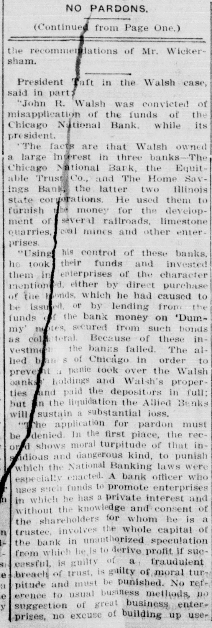 NO PARDONS. (Continued from Page One.) the recommendations of Mr. Wickersham. President Taft in the Walsh case, said in part: "John R. Walsh was convicted of misapplication of the funds of the Chicago National Bank. while its president. "The facts are that Walsh owned a large interest in three banks-The Chicago National Bark, the Equitable Trust.Co., and The Home Savings Bank, the latter two Illinois state corporations. He used them to furnish tahe money for the development of several railroads, limestone quarries, coal mines and other enterprises. "Using his control of these banks, he took their funds and invested them in enterprises of the character mentioned. either by direct purchase of the Lounds, which he had caused to be issued, or by lending from the funds of the bank money on 'Dummy' notes, secured from such bonds as collecteral. Because of these investmen the banks falled. The alhed ban of Chicago in order to prevent a panie took over the Walsh bankss' holdings and Walsh's properties and paid the depositors in full; but an the liquidation the Allied Banks will sustain a substantial loss. "The application for pardon must be denied. In the first place, the record shows moral turpitude of that inidious and dangerous kind, to punish which the National Banking laws were especially enacted. A bank officer who uses such funds to promote enterprises n in which he has a private interest and without the knowledge and consent of the shareholders for whom he is a trustee, involves the whole capital of n the bank in unauthorized speculation 1from which he is to derive profit if sucis cessful, is guilty of a, fraudulent breach of trust, is guilty of moral ture a pitude and must be punished. No reference to usual business methods, no e suggestion of great business entery prises, no excuse of building up use-