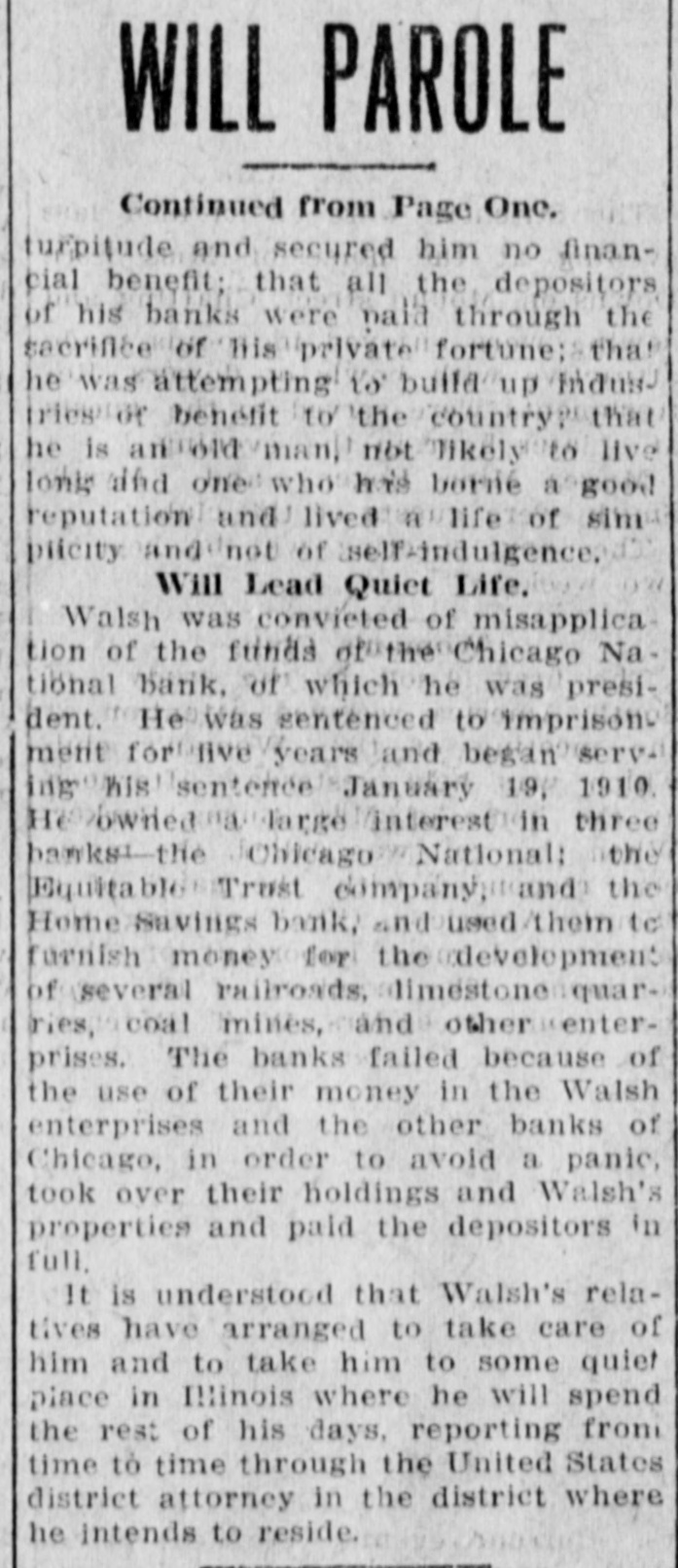WILL PAROLE Continued from Page One. turpitude and secured him no financial benefit: that all the depositors of his banks were naid through the sacrifice of This private fortune; tha! he was attempting is bulld up indus of benefit to the country that he is an old not likely to liv long and one who has borné a good reputation and lived a life of sim plicity and not of elf-indulgence. Will Lead Quiet Life. Walsh was convieted of misapplica tion of the funds of the Chicago National bank, of which he was president. He was sentenced to imprisonment for five years and began serving his sentence January 19, 1910. He owned large interest in three banks: the Chicago National: the Equitable Trust company and the Home Savings bank, and used them to furnish money for the development of several railroads, limestone quarries, coal mines, and other enterprises. The banks failed because of the use of their money in the Walsh enterprises and the other banks of Chicago, in order to avoid a panic, took over their holdings and Walsh's properties and paid the depositors in full, It is understood that Walsh's relatives have arranged to take care of him and to take him to some quiet place in Illinois where he will spend the rest of his days, reporting from time to time through the United States district attorney in the district where he intends to reside.