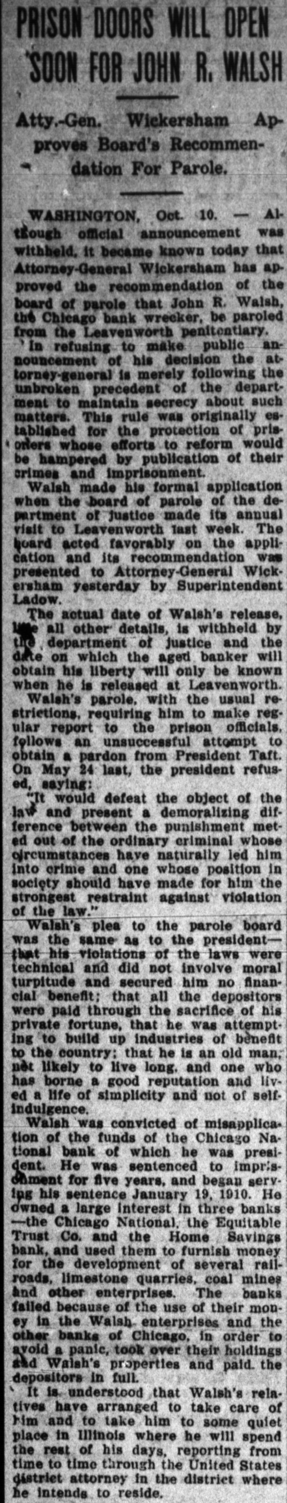PRISON DOORS WILL OPEN SOON FOR JOHN R. WALSH Atty.-Gen. Wickersham Approves Board's Recommendation For Parole. WASHINGTON, Oct. 10. - Although official announcement was withheld, it became known today that Attorney-General Wickersham has approved the recommendation of the board of parole that John R. Walsh, the Chicago bank wrecker, be paroled from the Leavenworth penitentiary. In refusing to make public announcement of his decision the attorney-general is merely following the unbroken precedent of the department to maintain secrecy about such matters. This rule was originally established for the protection of prisoners whose efforts to reform would be hampered by publication of their crimes and imprisonment. Walsh made his formal application when the board of parole of the department of justice made its annual visit to Leavenworth last week. The hoard acted favorably on the application and its recommendation was presented to Attorney-General Wickersham yesterday by Superintendent Ladow. The actual date of Walsh's release, life all other details, is withheld by the department of justice and the date on which the aged banker will obtain his liberty will only be known when he is released at Leavenworth. Walsh's parole, with the usual restrictions, requiring him to make regular report to the prison officials. follows an unsuccessful attempt to obtain a pardon from President Taft. On May 24 last, the president refused, saying: "It would defeat the object of the law and present a demoralizing difference between the punishment meted out of the ordinary criminal whose ojrcumstances have naturally led him into crime and one whose position in society should have made for him the strongest restraint against violation of the law." Walsh's plea to the parole board was the same as to the presidentthat his violations of the laws were technical and did not involve moral turpitude and secured him no financial benefit; that all the depositors were paid through the sacrifice of his private fortune, that he was attempting to build up industries of benefit to the country: that he is an old man; net likely to live long. and one who has borne a good reputation and lived a life of simplicity and not of selfindulgence. Walsh was convicted of misapplication of the funds of the Chicago National bank of which he was president. He was sentenced to imprisonment for five years, and began serving his sentence January 19, 1910. He owned a large Interest in three banks -the Chicago National. the Equitable Trust Co. and the Home Savings bank, and used them to furnish money for the development of several railroads, limestone quarries, coal mines and other enterprises. The banks failed because of the use of their money in the Walsh enterprises and the other banks of Chicago, in order to avoid a panic, took over their holdings and Walsh's properties and paid. the depositors in full.