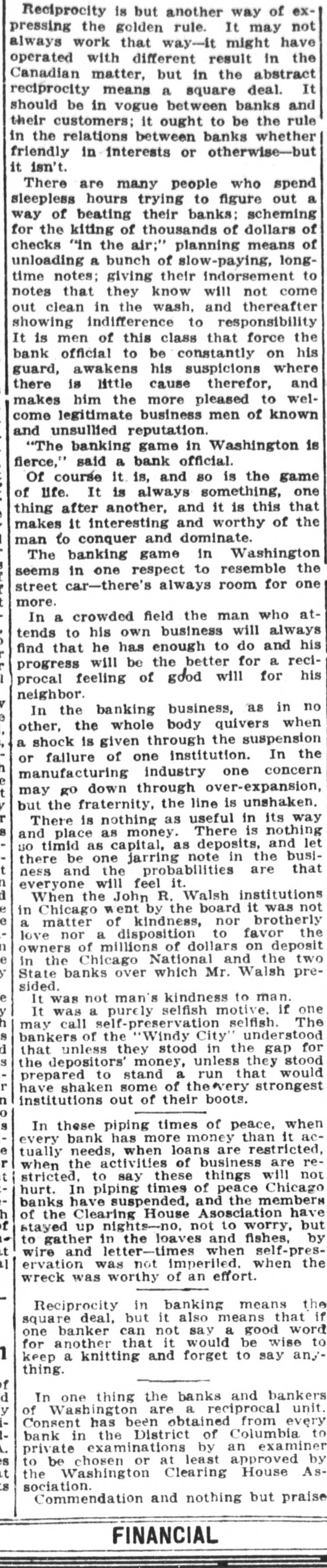 # FINANCIAL Reciprocity is but another way of expressing the golden rule. It may not always work that way—it might have operated with different result in the Canadian matter, but in the abstract reciprocity means a square deal. It should be in vogue between banks and their customers; it ought to be the rule in the relations between banks whether friendly in interests or otherwise—but it isn't. There are many people who spend sleepless hours trying to figure out a way of beating their banks; scheming for the kiting of thousands of dollars of checks "In the air;" planning means of unloading a bunch of slow-paying, long-time notes; giving their indorsement to notes that they know will not come out clean in the wash, and thereafter showing indifference to responsibility. It is men of this class that force the bank official to be constantly on his guard, awakens his suspicions where there is little cause therefor, and makes him the more pleased to welcome legitimate business men of known and unsullied reputation. "The banking game in Washington is fierce," said a bank official. Of course it is, and so is the game of life. It is always something, one thing after another, and it is this that makes it interesting and worthy of the man to conquer and dominate. The banking game in Washington seems in one respect to resemble the street car—there's always room for one more. In a crowded field the man who attends to his own business will always find that he has enough to do and his progress will be the better for a reciprocal feeling of good will for his neighbor. In the banking business, as in no other, the whole body quivers when a shock is given through the suspension or failure of one institution. In the manufacturing industry one concern may go down through over-expansion, but the fraternity, the line is unshaken. There is nothing as useful in its way and place as money. There is nothing so timid as capital, as deposits, and let there be one jarring note in the business and the probabilities are that everyone will feel it. When the John R. Walsh institutions in Chicago went by the board it was not a matter of kindness, nor brotherly love nor a disposition to favor the owners of millions of dollars on deposit in the Chicago National and the two State banks over which Mr. Walsh presided. It was not man's kindness to man. It was a purely selfish motive, if one may call self-preservation selfish. The bankers of the "Windy City" understood that unless they stood in the gap for the depositors' money, unless they stood prepared to stand a run that would have shaken some of the very strongest institutions out of their boots. In these piping times of peace, when every bank has more money than it actually needs, when loans are restricted, when the activities of business are restricted, to say these things will not hurt. In piping times of peace Chicago banks have suspended, and the members of the Clearing House Asosciation have stayed up nights—no, not to worry, but to gather in the loaves and fishes, at wire and letter-times when self-preservation was not imperiled, when the wreck was worthy of an effort. Reciprocity in banking means the square deal, but it also means that if one banker can not say a good word for another that it would be wise to keep a knitting and forget to say anything. In one thing the banks and bankers of Washington are a reciprocal unit. Consent has been obtained from every bank in the District of Columbia to private examinations by an examiner to be chosen or at least approved by the Washington Clearing House Association. Commendation and nothing but praise