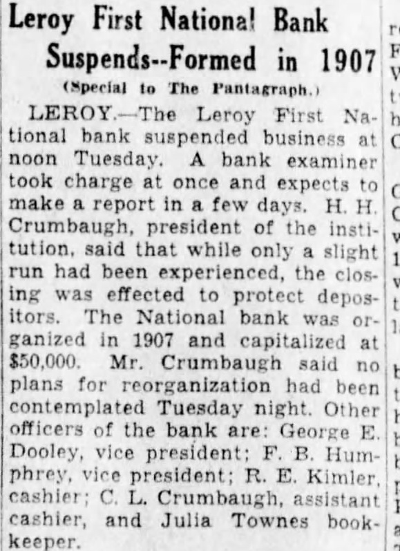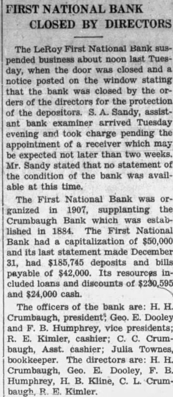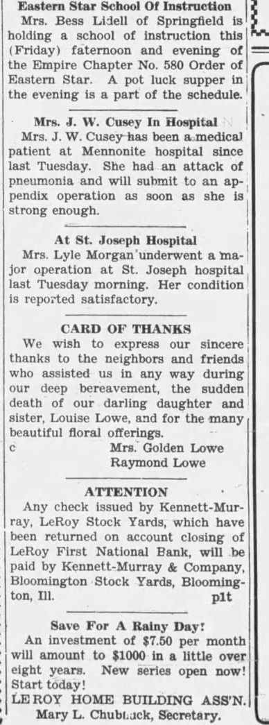 Going to the south of the street and coming back west you will find the office of Dr. Berneice McConnell, recently the office of Dr. R. May. Next is the office of veterinarian. the ing are the plumping shop Kelley and the and the Jones shop with proprifather, Jones. in the next block the pool Ray Keys, time been Donald long having Buckles. Then the restaurant of VerLand, in the building. Next the location of the stores of grocery Wm. Keys, Martin Bros., Rees & Arrowsmith, now the Kroger Grocery manager and Mr. store, and Mrs. Francis Dawson, clerks. Then the double front of The comes How, of and R. Humphrey, the location of the Morris once hardware store. Kenneth Humphrey and Kelley Schultz are store salesmen. The next building that built by Dickinson and remodeled by where he had butcher Corbin, for several years and now shop cupied by Mayfield store and by the Hurley meat grocery It is known as the Eskew market. The the post building. built by Dr. John Haig office building 1897, and where the postoffice has been located ever since. Then comes Owen building built by Leslie the Owen, law office, later the of and now that of fice McKay Arlo E. On the corcer the imposing Roy State Bank building, the old locaof the Keenan building which cation and which had been built in 1872, Reynolds Dry Goods store, the hotel. Miles Keenan bank LaMar Moore, Grizzelle is the Miss Alice Russell Clyde Killion and employed. The First NaAcross the corner in 1884, the tional bank home of the Citizen's bank for and later the First Naber of years under the receivership of tional now The next door west Feldman. store, which for the Rutledge drug half was the Vannearly century Deventer drug store. store is next, The Clothing new location of the to the soon Phares is the postand the store conducted. master Pearl Lawson Bishop.. Next the vacant store room formby Harry Buckles for erly occupied store. Robt. Murray was grocery cated here for number of years. The corner building that occupied Dean Bros., garage and filling in the Crumbaugh building built tion 1911.