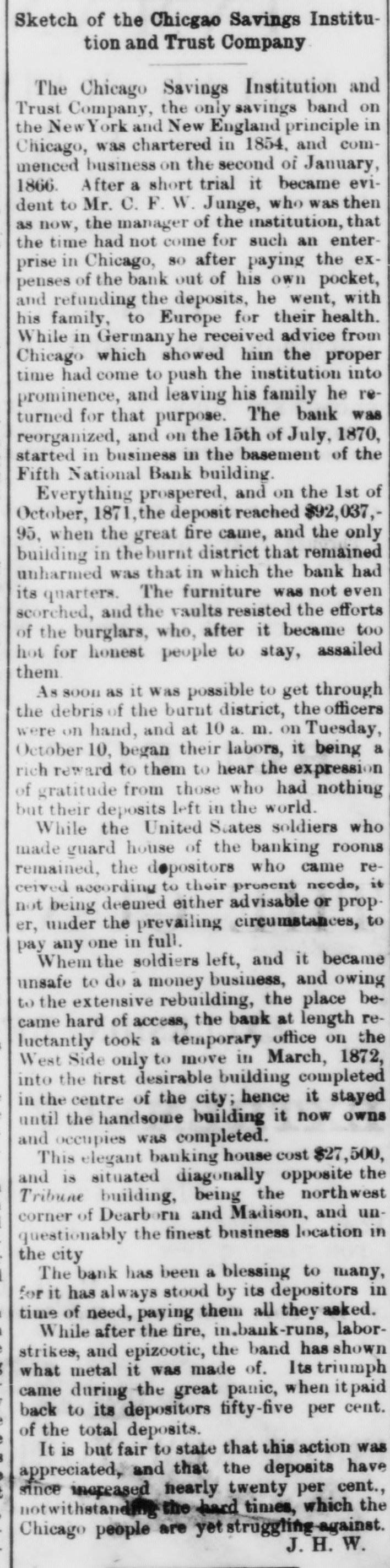 argued in time The same amounts of gold and currency that were in the country a fortnight Ago aro hold here to-day. The result has been A transfer of if no panio disturbing all only transfer, possession, business relations and that be created, affects only those immediately interested in the fortunes of one firm. But there was A GENERAL APPREHENSION that, owing to the excitement which some were endeavoring to increaso and extend and intensify, there be a run on the savings banks of the city tooutside of the officers and managers would day, and, and of interest these institutions, there was much anxiety expressed as to the result of such a movement. The of the savings banks, the and determining to managers possibilities, provide appreciating for their own safety and the security of their depositors, held a consultation yesterday, and resolved upon the adop& course as was both within the law and best as trustees of for tion the of such guardianship the treasures they hold. Their action is elsewhere reported. While it may not be denied that there was expressed yesterday & feeling of doubt in view of possible contingencies, it cannot be affirmed that there was anything approaching excitement or alarm. Men discussed THE FINANCIAL SITUATION quietly and deliberately, but not with the perfect confidence that mark predictions of ord! ary business. on the subject were in but conducted nor Conversations whispers, neither in boisterous moderate touce, as is the wont of the usual times, by couples, or in email knota. If appearances yesterday be any indication of results to-day, there will be no panic, and no rush on the banks, unless upon the savings institutions. All probability of such an attompted "run" is forestalled in the action of these institutions. A TRIBUNE reporter conversed with a number of the of the savings banks yesterday, and they the case: We receive and we pay heavy expenses mallmanagers pay thus interest, pithily put deposits. for the We agement of our institutions. To do this, of course, we cannot afford to let money lie idle in our vaults. We must invest it at remunerative rates. In doing BO, we endeavor to loan on the best terms compatible with for our depositors. This money must on a reasonable time, and in on domand. Our unperfect be immediately loaned security depositors cannot be must called derstand this. Our security is good, but we cannot pay at once all depositors out of our reserve funds." ACTION OF THE HAVINGS RANKS, The following is the result of the meeting of the officera of the avings banks yeaterday : SAVING DEPOSITE.-To allay all unnecessary excitement, and in the interest of the public and our depositors, and to prevent the possibility of any party obtaining an advantage over another, and to protect of the savings banks of the City of Chiby the officers whose names are hereto, will, from and after scribed cago, the rights represented all, this date, insist subupon requiring notice for the withdrawal of deposits, according to their respective rules. D. D. SPENCER, President State Savings Institution. JOHN C. HAINES, President of Fidelity Bank and Hafo Depository. SYDNEY MYERS, Cashier Merchants', Farmers' & Mechanica' Savings Bank, FRED. MEYER, Cashier Commercial Loan Company. F. C. TAYLOR, Vice-President Cook County Savings Bank. HENRY GREENEDAUX, President German Savings Bank. FRANCIS LACKNER, President German-American Savings Bank. 8. W. RAWHON, President Union Trust Company. CARL F. W. JUNGE, Treasurer Chicago Savings Institution and Trust Company. J. YOUNG SOAMMON, President Havings Department of the Marine Company of Calcago. H. A. WARE, Cashier City Savings Bank. W. II. PARK, Cashier of the Bank of Chicago, JAMES W. BCOVILLE, President of the Prairio State Loan and Trust Company. LAST EVENING it was reported that a tologram from President Grant, directed to & prominent financior of this city, bad been received in the afternoon, stating that the President would to-day order the immediate issue of the $14,000,000 reserve fund In order to afford relief. reported. from
