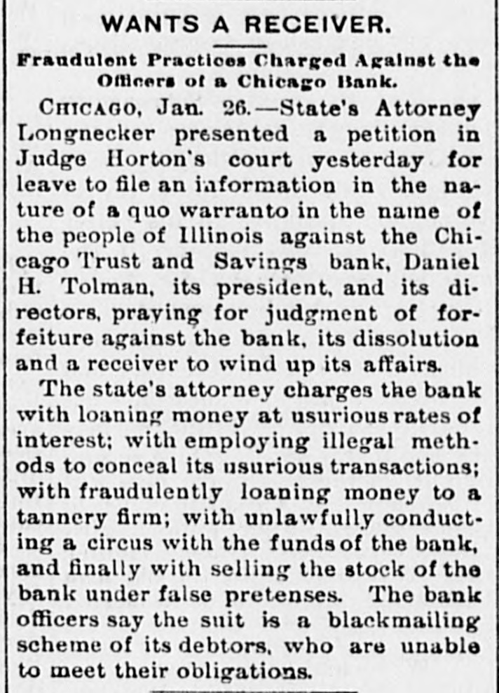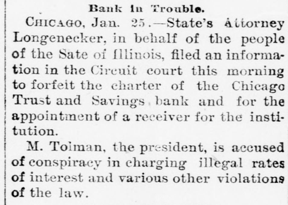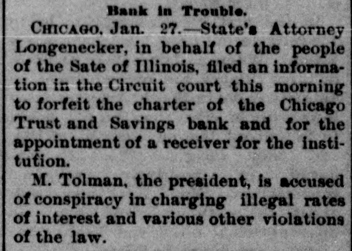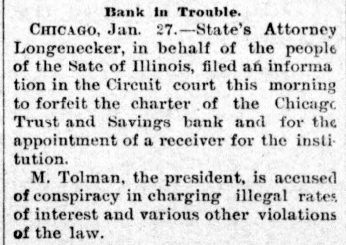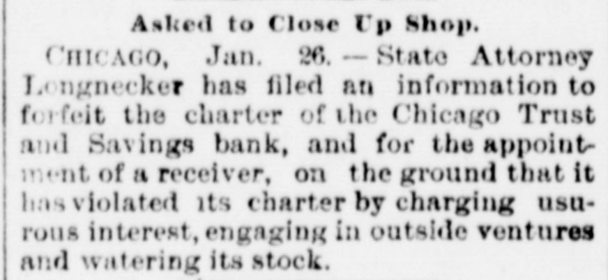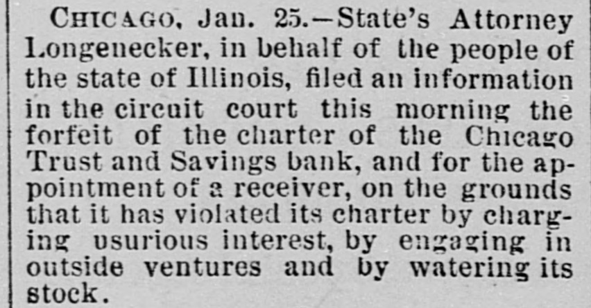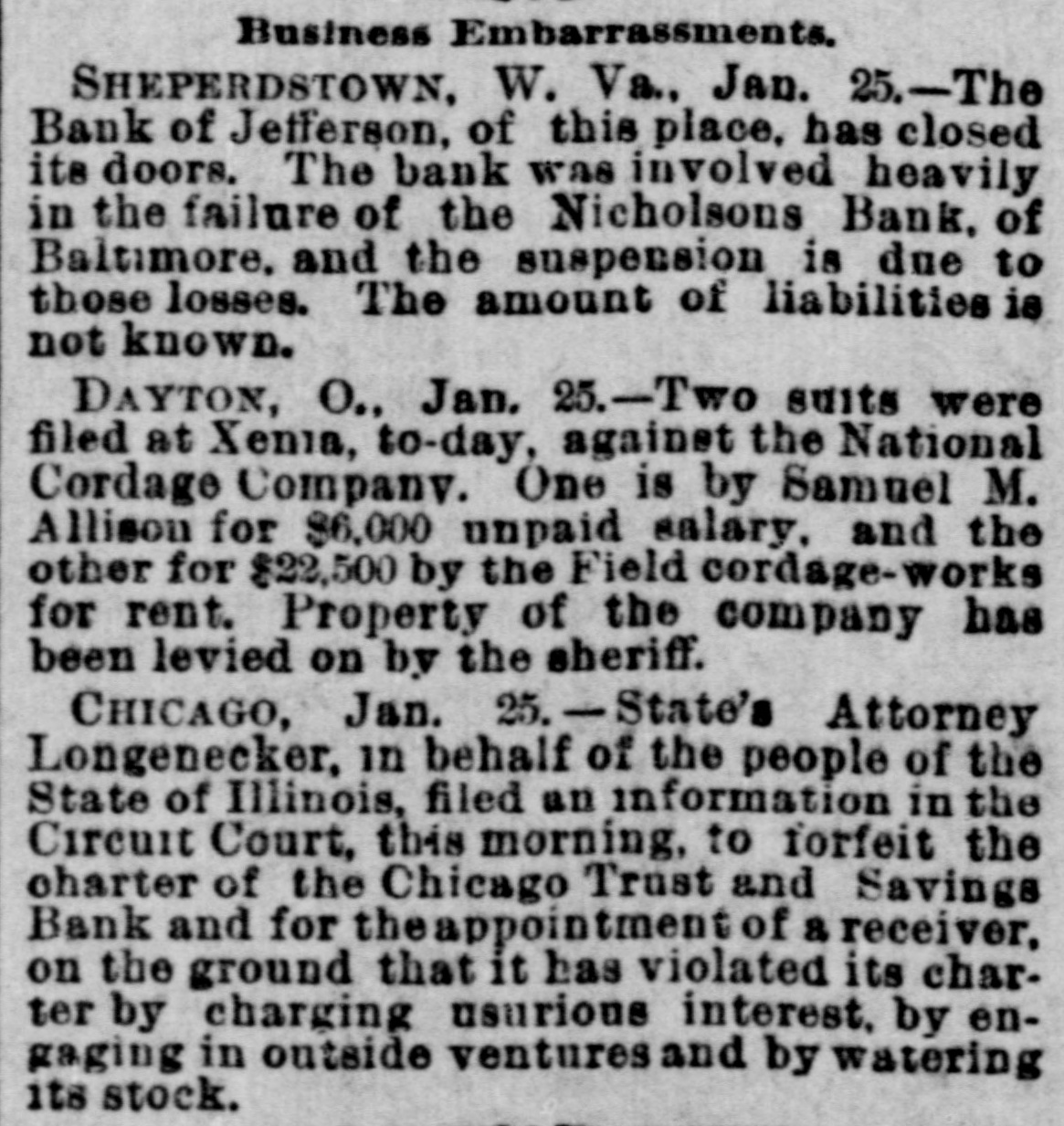 Business Embarrassments. SHEPERDSTOWN, W. Va., Jan. 25.-The Bank of Jefferson. of this place. has closed its doors. The bank was involved heavily in the failure of the Nicholsons Bank, of Baltimore, and the suspension is due to those losses. The amount of liabilities is not known. DAYTON, O., Jan. 25.-Two suits were filed at Xenia, to-day, against the National Cordage Company. One is by Samuel M. Allison for $6,000 unpaid salary. and the other for $22,500 by the Field cordage-works for rent. Property of the company has been levied on by the sheriff. CHICAGO, Jan. 25. - State's Attorney Longenecker, in behalf of the people of the State of Illinois, filed an information in the Circuit Court, this morning, to forfeit the charter of the Chicago Trust and Savings Bank and for theappointment of a receiver, on the ground that it has violated its charter by charging usurious interest. by engaging in outside ventures and by watering its stock.