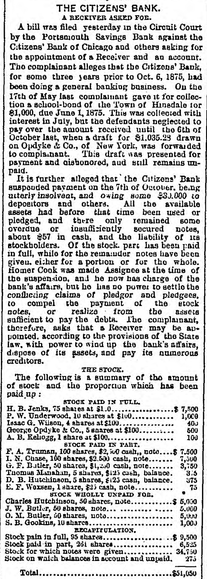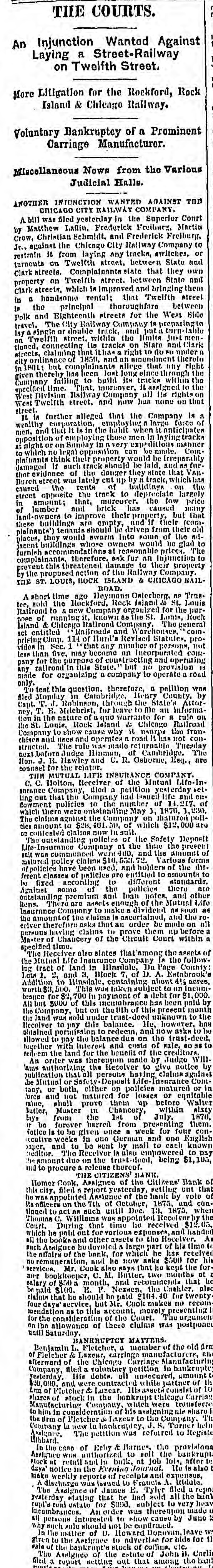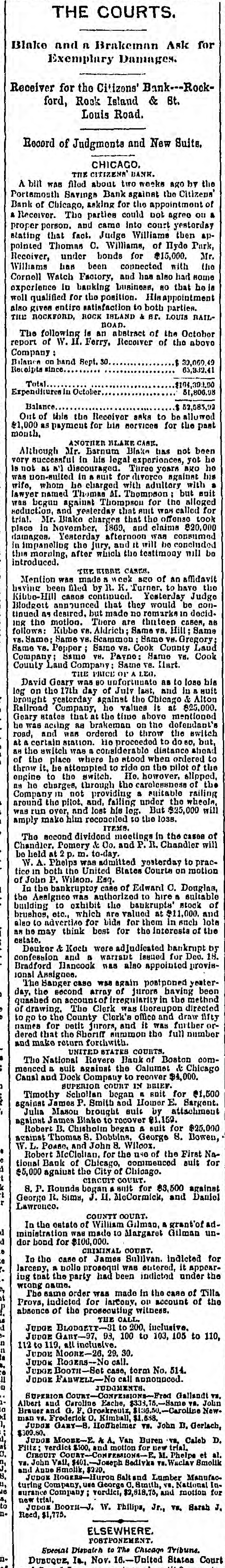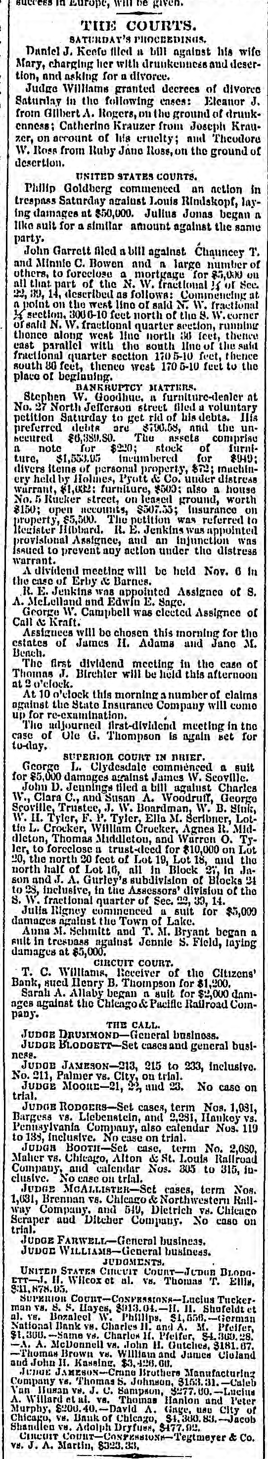 Europe, will be given. THE COURTS. SATURDAY'S PROCEEDINGS. Daniel J. Keefe filed 11 bill against his wife Mary, charging her with drunkenness and desertion, and asking for a divorce. Judge Williams granted decrees of divorce Saturday In the following enses: Elcanor J. from Gilbert A. Rogers, on the ground of drunkenness; Catherine Krauzer from Joseph Krauzer, on account of his cruelty; and Theodore W. Ross from Ruby Jane Ross, on the ground of desertion. UNITED STATES COURTS. Philip Goldberg commenced an action in trespass Saturday atrainst Louis Rindskopf, laying damages at $50,000. Julius Jonas began n like suit for a similar amount against the same party. John Garrett filed a bill against Chauncey T. and Minnie C. Bowen and n large number of others, to foreclose a mortgage for 85,000 on all that part of the N. W. fractional 14 of See. 22, 89, 14, described as follows: Commencing at n point on the west lino of said N. W. fractional section. 300 0-10 feet north of the 8. W corner of said N. W. fractional quarter section, running thonce along west line north 36 (cet, thence east parallel with the south line of the said fractional quarter section 170 5-10 feet, thence south 80 feet, thenco west 170 5-10 feet to the place of beginning. BANKRUPTCY MATTERS. Stephen W. Goodhue. a furniture-denler nt No. 27 North Jefferson street filed u voluntary petition Saturday to get rid of his debts. IIIA preferred debts are 3790.58, and the unSecured $6,389.50. The assets comprise n note for $220; stock of furniture, $1,553.05 (neumbered for $949: divers Items of personal property, 872: machincry held Holines, Pyott & Co. under distress warrant, $1,032: furniture, $500: also a house No. 5 Rucker street, on leased ground, worth $150; open accounts, $507.55; Insurance on property, 85,500. The petition was referred to Register lifbbard. R. E. Jenkins was appointed provisional Assignee, and an injunction was Issued to prevent any action under the distress warrant. A dividend meeting will be held Nov. 6 In the case of Erby & Barnes. R. E. Jenkins was appointed Assignee of S. A. McLelland and Edwin E. Sage. George W. Campbell was elected Assignee of Call & Kraft. Assignees will be chosen this morning for the estates of James H. Adams and Jane M. Bench. The first dividend meeting in the case of Thomas J. Birchler will be held this afternoon at 2o'clock. At o'clock this morning a number of claims against the State Insurance Company will como up for re-examination. The adjourned first-dividend meeting in the case of Ole G. Thompson is again set for to-day. SUPERIOR COURT IN BRIEF. George L. Clydesdale commenced a suit for 85,000 damages against James W. Scoville. John D. Jennings tiled a bill agulust Charles W., Clara C., and Susan A. Woodruff, George Scoville, Trustee, J. W. Boardman, W. B. Stnk, W. II. Tyler, F. P. Tyler, Ella M. Scribner, Lottie L. Crocker, William Crocker, Agnes R. Middicton, Thomas Middleton, and Warren O. Tyler, to forcelose 11 trust-deed for $10,000 on Lot 20, the north 20 feet of Lot 19, Lot 18, and the north half of Lot 16, all In Block 21, in Ja son and J. A. Gurley's subdivision of Blocks 24 to 28. inclusive, in the Assessors' division of the S. W. fractional quarter of Sec. 20, 33, 14. Julia Rigney commenced a suit for $5,000 damages rigulust the Town of Lake. Auna M. Schmitt and T. M. Bryant began a suit in trespass against Jennie S. Field, taying damages at $5,000. CIRCUIT COURT. T. C. Williams, Receiver of the Citizens' Bank, sucil Ilenry B. Thompson for $1,200. Sarah A. Allaby began n suit for $2,000 damages against the Chicago & Pacific Railroad Coinpany. THE CALL JUDGE DRUMMOND-General business. JUDGE BLODGETT-Set casesand general businese. JUDGE JAMESON-213, 215 to 233, inclusive. No. 211, Palmer VS. City, on trial. JUDGE MOORE-21, 27 and 23. No case on trial. JUDGE RODGERS-Set cases, term Nos. 1,031, Bargesa V8. Liebenstein, and 2,281, Haukey vs. Pennsylvania Company, also calendar Nos. 119 to 138, inclusive. No case on trial. Judan BOOTH-Set case, term No. 2,0S0 Maher vs. Chicago, Alton St. Louis Rattroad Company, and calendar Nos. 305 to 315, inclusive. No ense on trial. JUDGE McAll.ister-Sci cases, term Nos. 1,631, Brennan vs. Chicago Northwestern Rallway Company. and 549, Dietrich Vd. Chicago Scraper and Ditcher Company. No caso on trial. JUDGE FARWELL-General business. JUDGE WILLIAMB-General business. JUDGMENTS. UNITED STATES Circuit COUNT-JUDIE BLODO CTT-J. II. Wilcox et al. VS. Thomas T. Ellis, Sill, 878.05. SUPERIOR Tuckerman vs. S. S. Hayes, $013.04.-H. II. Shofeldt et al. vs. Bozaleel W. Phillips. S1. 556. -German National Bank vs. Charles 11. and A. M. Pfelfer, $1,300. -Same Yd. Charles 11. Pfelfer, $4,360.28 -A. A. McDonnell VA. John II. Gutches, 3181. 67. -Thomas Brown VH. William and James Cieland and John II. Kassing. $3,426.00. JUDGE JAMESON-Crane Brothers Manufacturing Company VS. Thomas Johnson, 3153.31.-Caleb Van Husan Vs. J. C. Sampson, $277.00.-Lucius . Willard et al. vs. Thoinas Hanlon and Peter Murphy, $200.40 David . Gage, usu City of Chicago, VI. Bank of Chicago, $1,300.83.-Jacob Shandlen ve. Adolph Dryfuen, $177.92 CURCUIT Co. vs. J. A. Martin, $323.