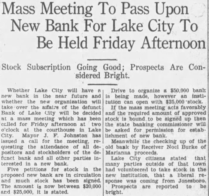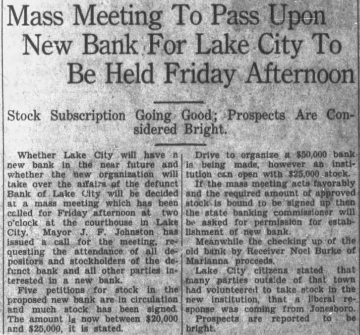 Mass Meeting To Pass Upon New Bank For Lake City To Be Held Friday Afternoon Stock Subscription Going Good; Prospects Are Considered Bright. Whether Lake City will have new bank in the near future and whether the new organization will take over the afairs of the defunct Bank of Lake City will be decided at mass meeting which has been called for Friday afternoon at two o'clock at the courthouse in Lake City. Mayor F. Johnston has issued call for the meeting, requesting the attendance of all depositors and stockholders of the defunct bank and all other parties interested in a new bank. Five petitions for stock in the proposed new bank are in circulation and much stock has been signed. The amount is now between $20,000 and $25,000, it is stated. Drive to organize a $50,000 bank is being made, however an institution can open with $25,000 stock. If the mass meeting acts favorably and the required amount of approved stock is bound to be signed up then the state banking will be asked for permission for estab lishment of new Meanwhile the checking up of the old bank by Receiver Noel Burke of Marianna proceeds. Lake City citizens stated that many parties outside of that town had volunteered to take stock in the new institution, that liberal response was coming from Jonesboro. Prospects are reported to be bright.