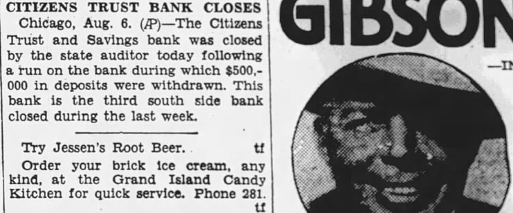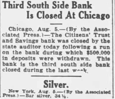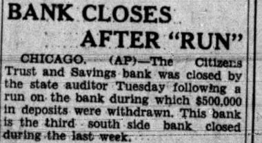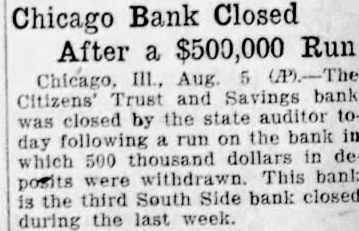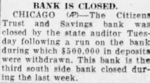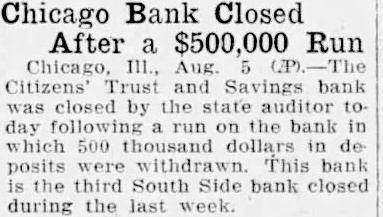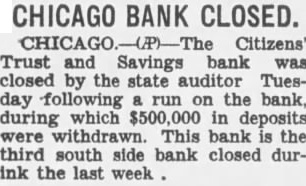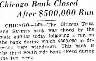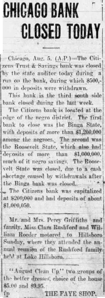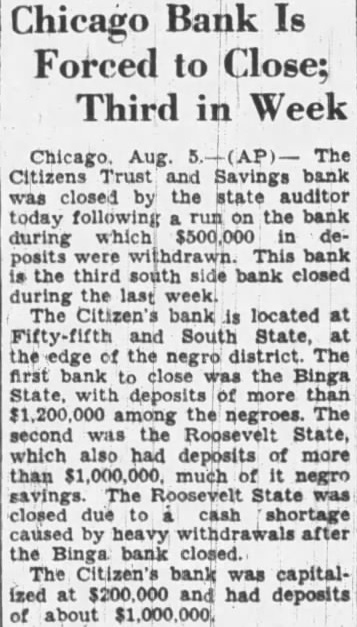Chicago, Aug. 5. Citizens Trust & Savings bank was closed by the state auditor today during a run on the bank, during which $500,000 in deposits were withdrawn. This bank is the third south side bank closed during the last week. The Citizens bank is located at the edge of the negro district. The first bank to close was the Binga State, with deposits of more than $1,200,000 among the negroes. The second was the Roosevelt State, which also had deposits of more than $1,000,000, much of it negro savings. The Roosevelt State was closed. due to a cash shortage caused by withdrawals after the Binga bank was closed. The Citizens bank was capitalized at $200,000 and had deposits of about $1,000,050.