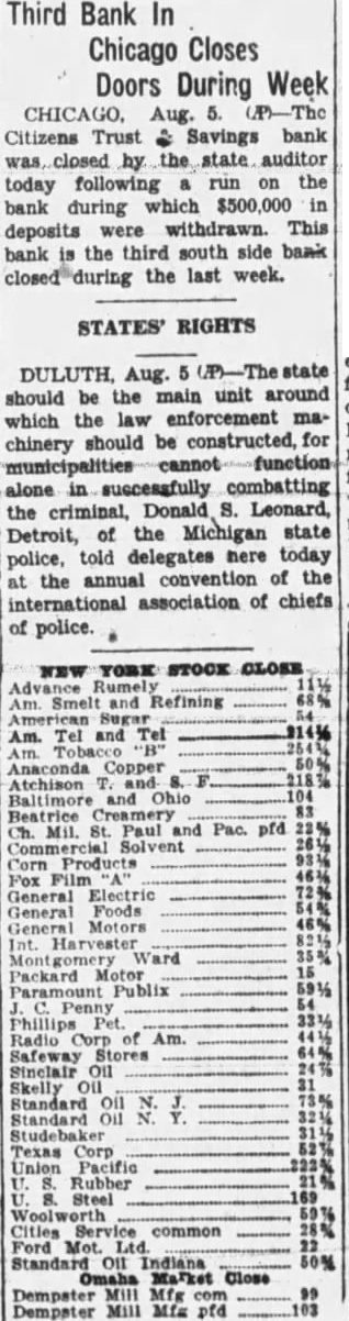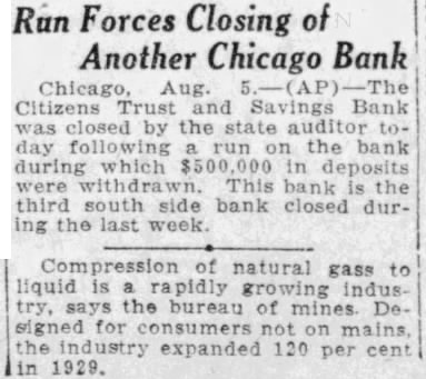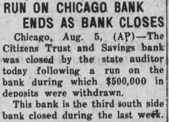 RUN ON CHICAGO BANK ENDS AS BANK CLOSES Chicago, Aug. 5, Citizens Trust and Savings bank was closed by the state auditor today following run on the bank during which $500,000 in deposits were withdrawn. This bank is the third south side bank closed during the last week.