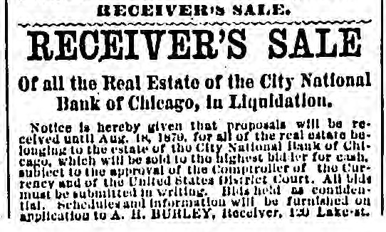 RECEIVER'S SALE. # RECEIVER'S SALE Of all the Real Estate of the City National Bank of Chicago, in Liquidation. Notice is hereby given that proposals will be re- celved until Aug. 18, 1870, for all of the real estate be- longing to the estate of the City National Bank of Chi- cago, which will be sold to the highest bidder for cash, subject to the approval of the Comptroller of the Cur- rency and of the United States District Court. All bids must be submitted in writing. Bids held as confiden- tial, schedules and information will be furnished on application to A. H. BURLEY, Receiver, 150 Lake-st.