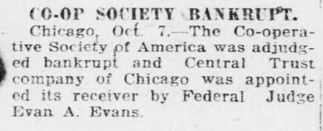 CO-OP SOCIETY BANKRUPT. Chicago, Oct. 7.-The Co-operative Society of America was adjudged bankrupt and Central Trust company of Chicago was appointed its receiver by Federal Judge Evan A. Evans.